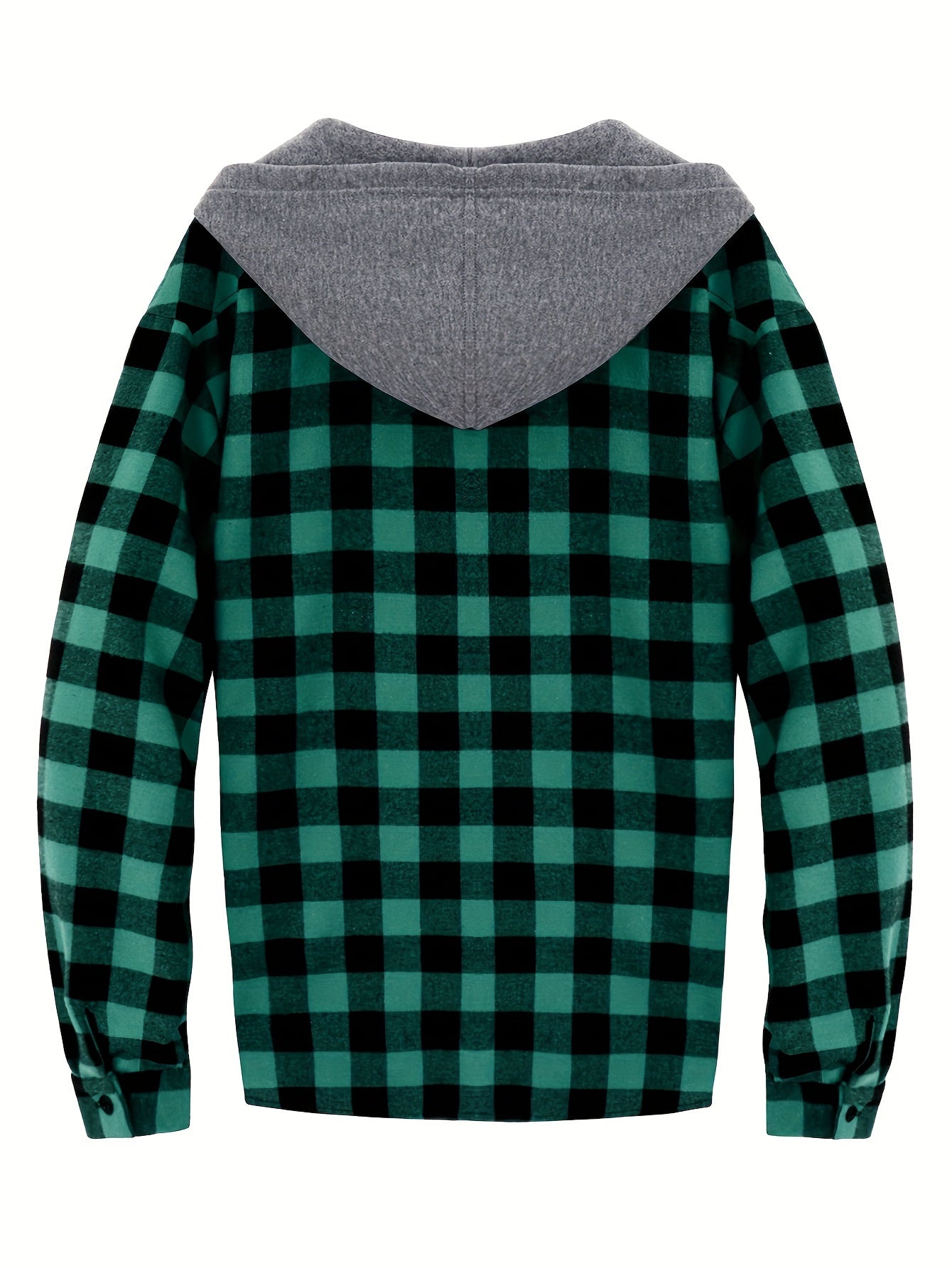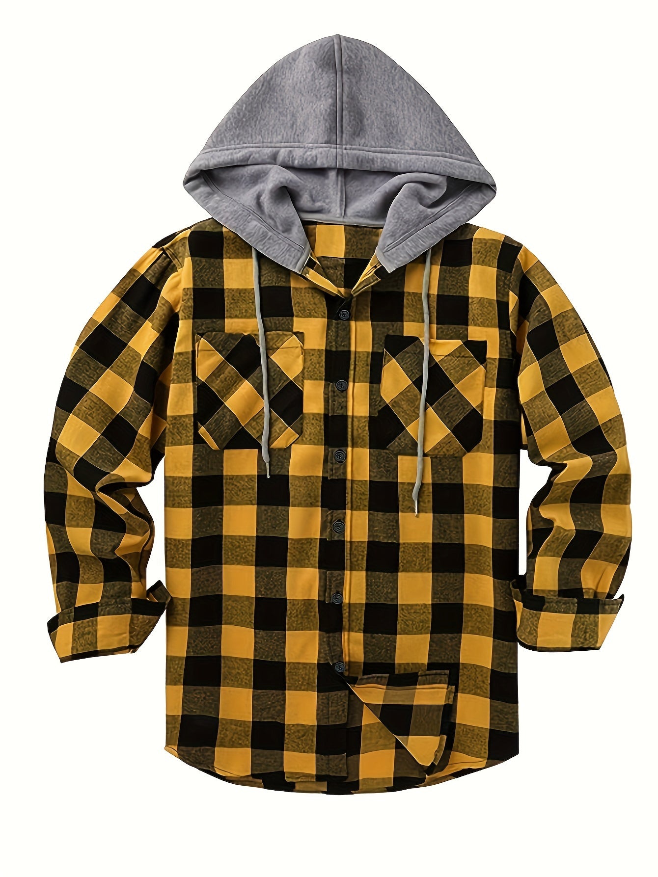 2pcs Men's Casual Plaid Hooded Button-Up Shirts - Soft Polyester-Rayon Blend, Long Sleeve Regular Fit, Purple & Yellow Checkered Patterns for Spring Summer Fall