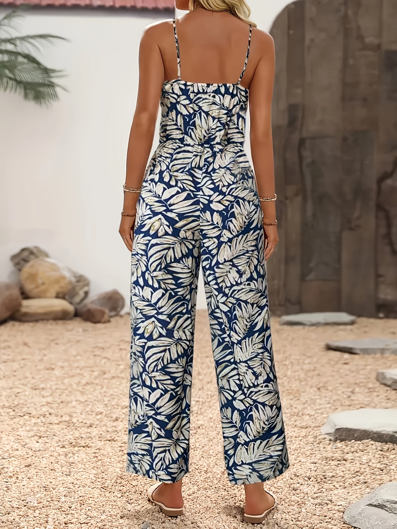 Introducing the Stylish Women’s V-Neck Backless Jumpsuit, crafted from 100% polyester for a comfortable and versatile fit. This trendy jumpsuit boasts a stunning printed design featuring botanical patterns, making it perfect for spring and summer outings.
