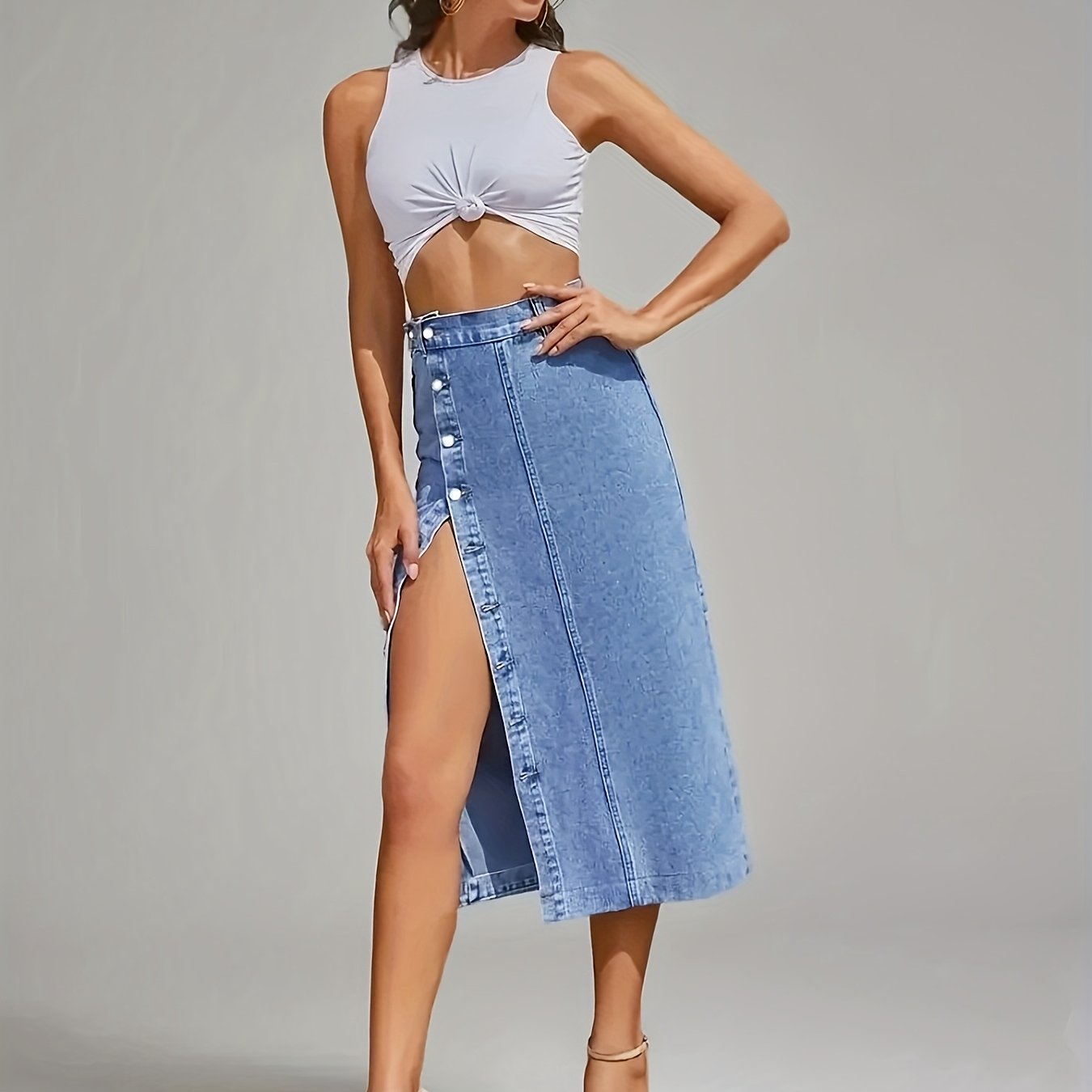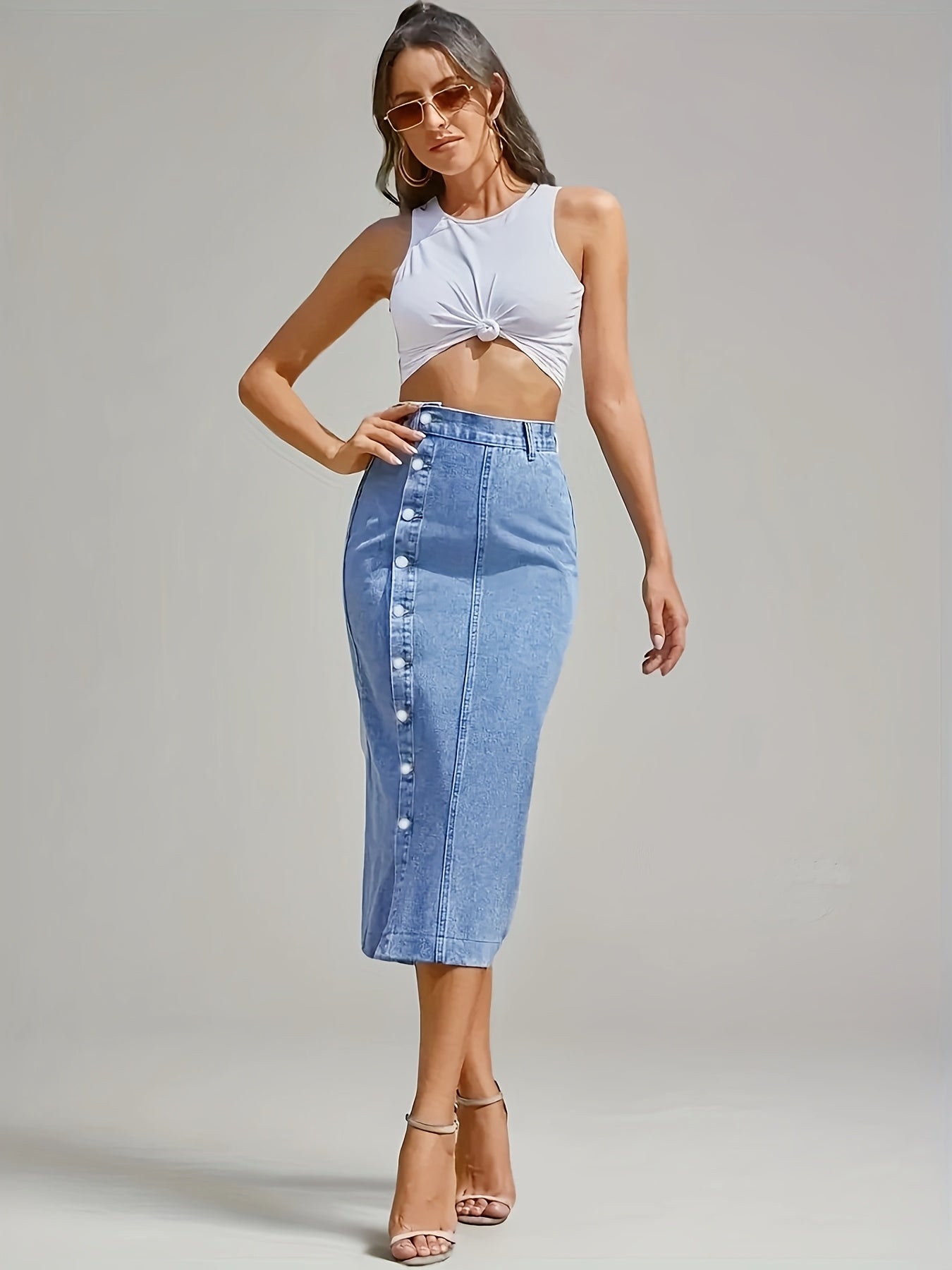 Introducing the AW25 Light Blue Bodycon Denim Skirt, a stylish and versatile addition to any wardrobe. Made from medium stretch polyester, this skirt is designed to highlight your curves while providing comfort. Perfect for spring, summer, and fall, it features a trendy button front and a classic solid color, ensuring you make a fashion statement wherever you go.