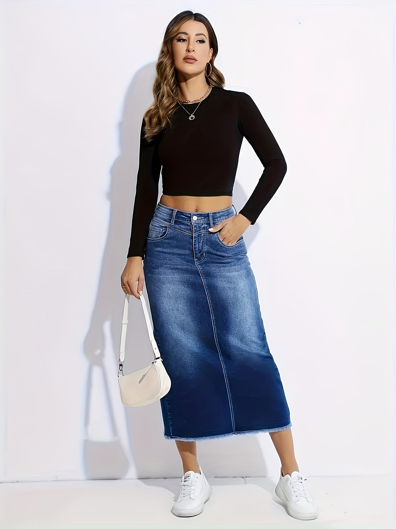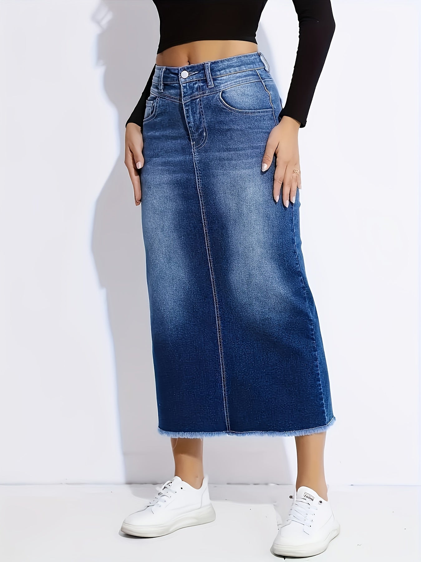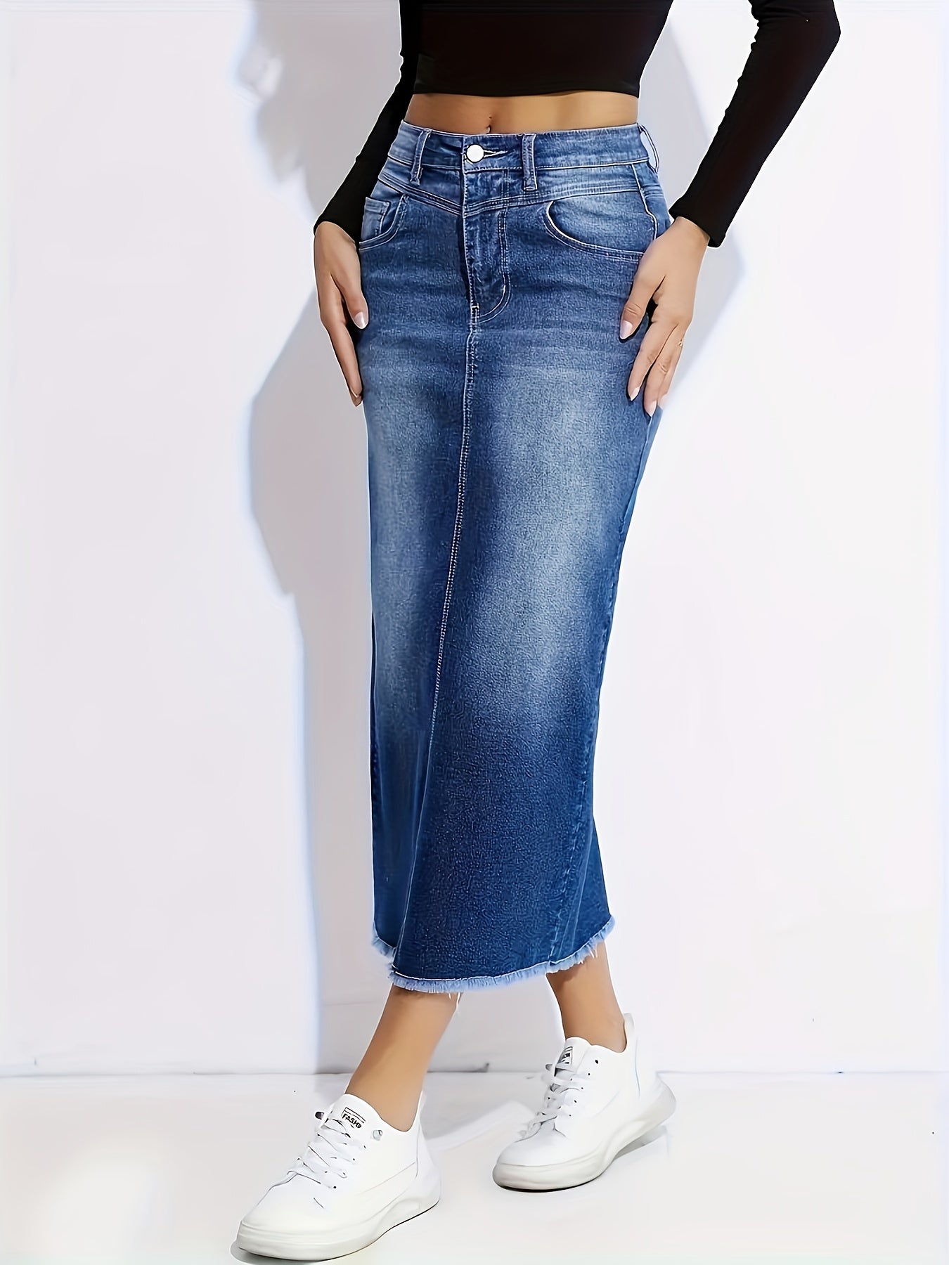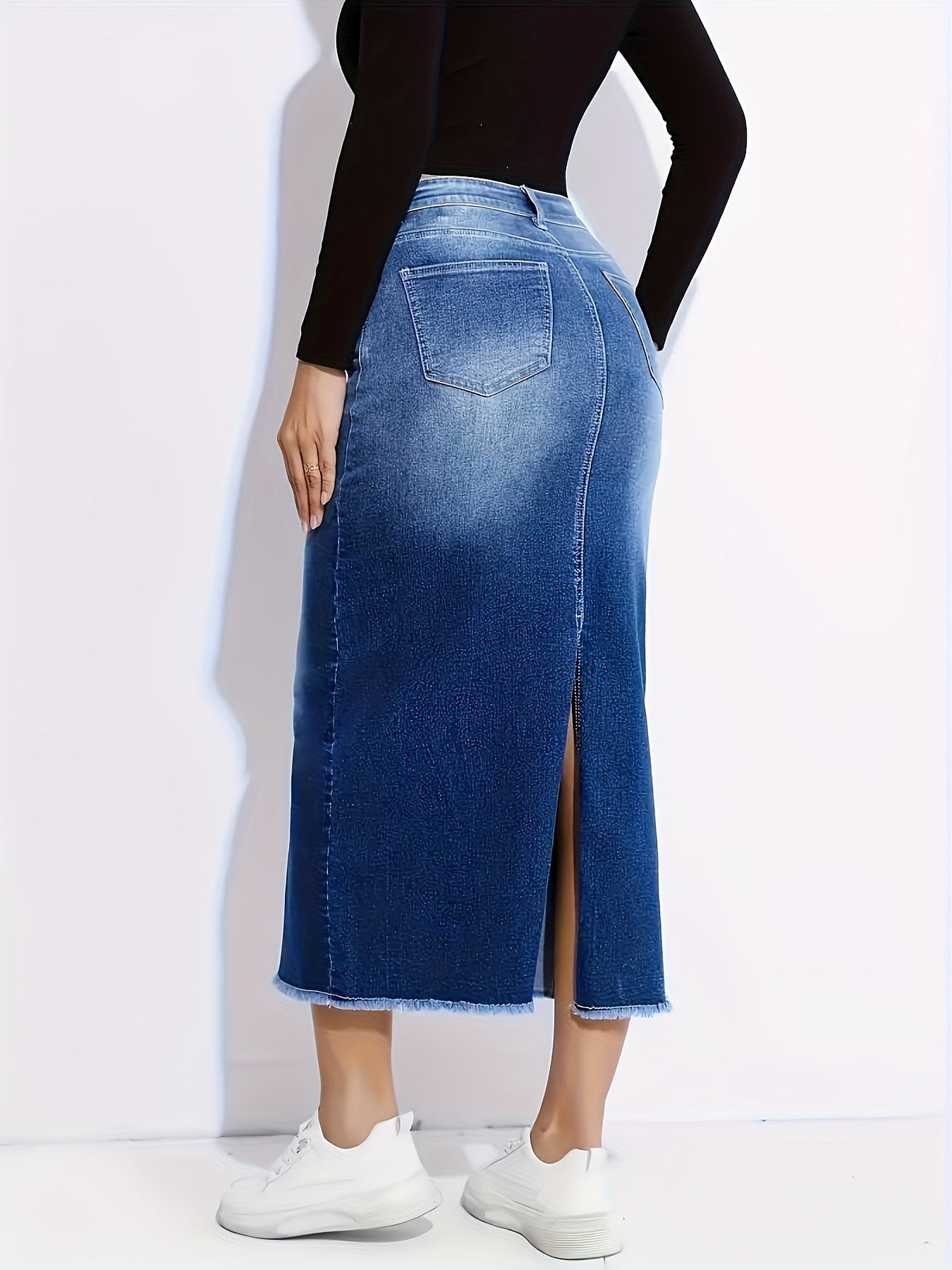Introducing our Women's Elegant Straight-Leg Jeans Skirt, designed for versatility and comfort. Crafted from non-see-through stretchy denim, this fashionable piece effortlessly transitions from office to party, making it an essential addition to your wardrobe. With a ruffled hem and durable construction, this jeans skirt is perfect for denim lovers who value style and practicality.