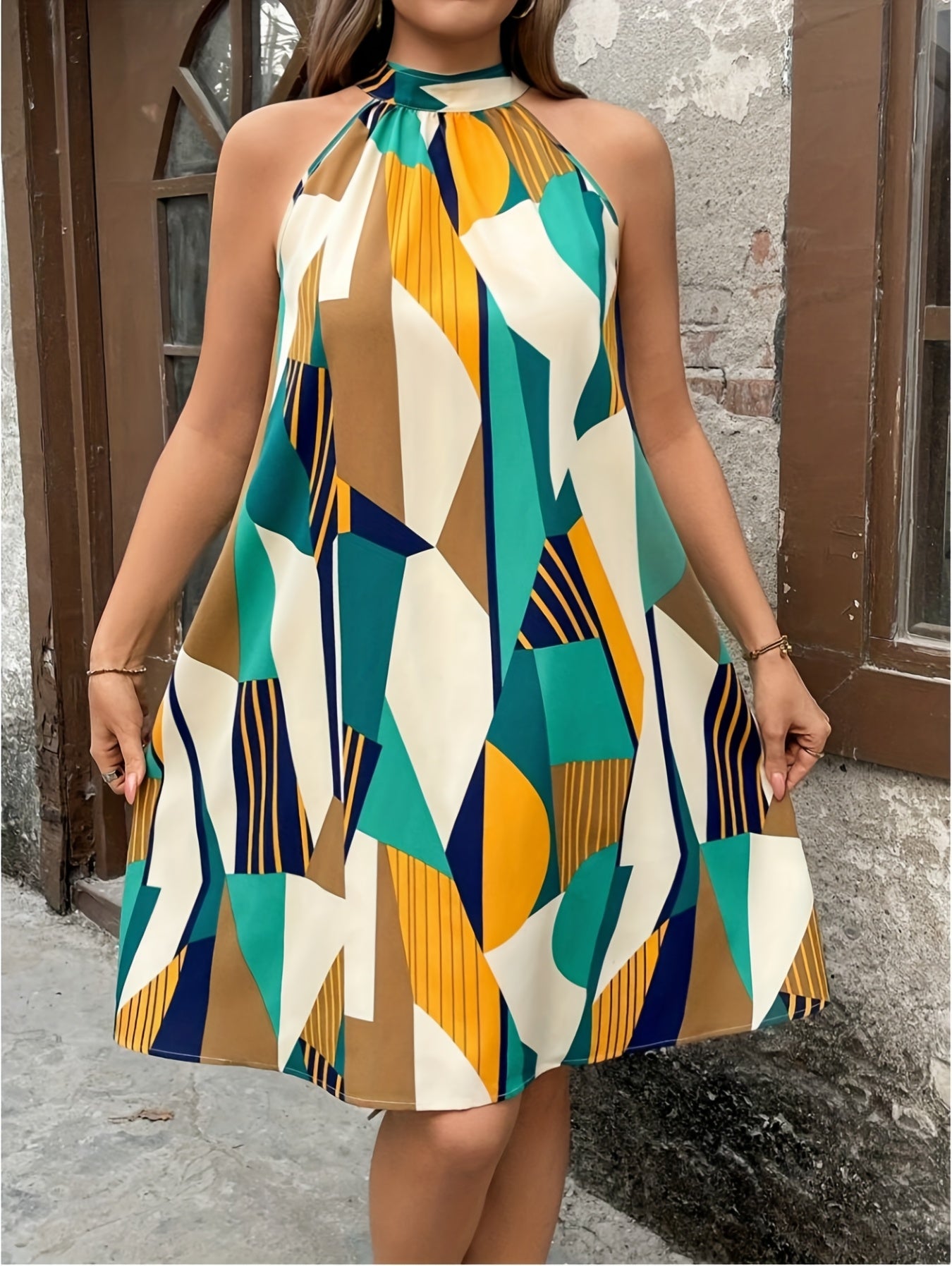 Discover the perfect blend of style and comfort with our Women's A-Line Off-Shoulder Dress featuring a chic geometric print. Made from 100% polyester, this summer-ready dress is knee-high and sleeveless, designed to keep you cool and fashionable during the warm months.