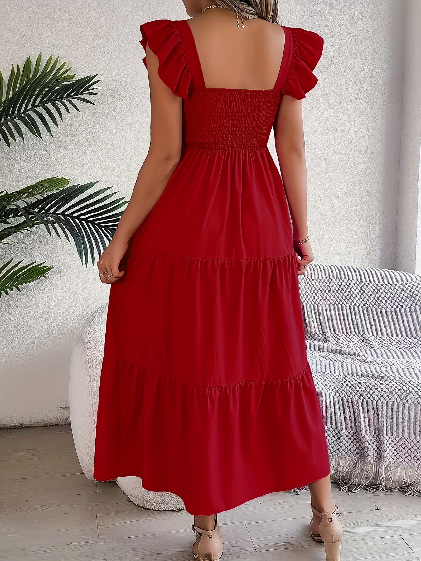 Presentamos nuestro elegante vestido largo para mujer con volantes en los hombros, en un impresionante color rojo sólido. Confeccionado con un 95% de poliéster de alta calidad, este vestido largo de manga larga es perfecto para cualquier ocasión durante la primavera, el verano o el otoño. Con su diseño escalonado y cuello cuadrado, este vestido combina comodidad y estilo sin esfuerzo.