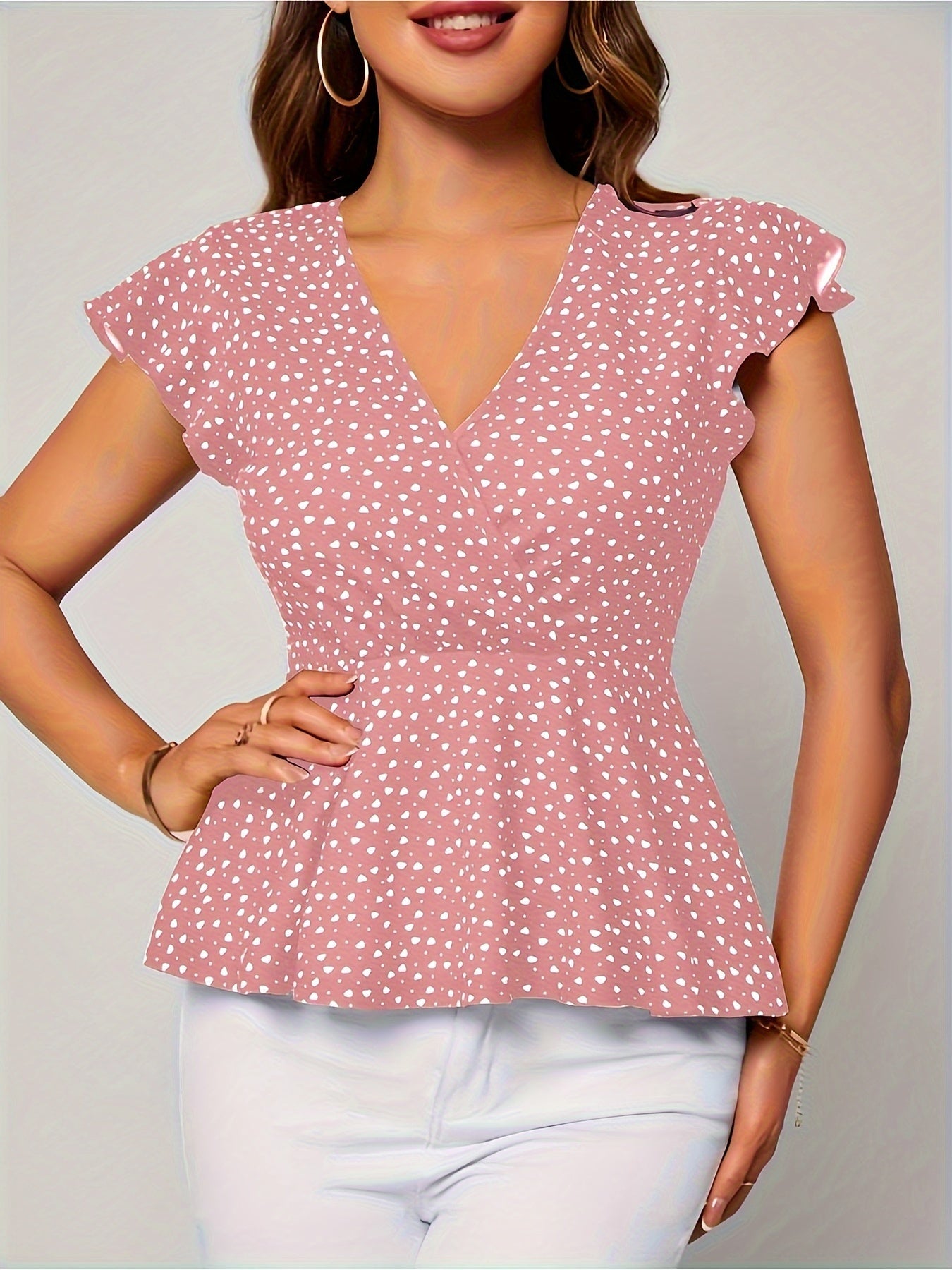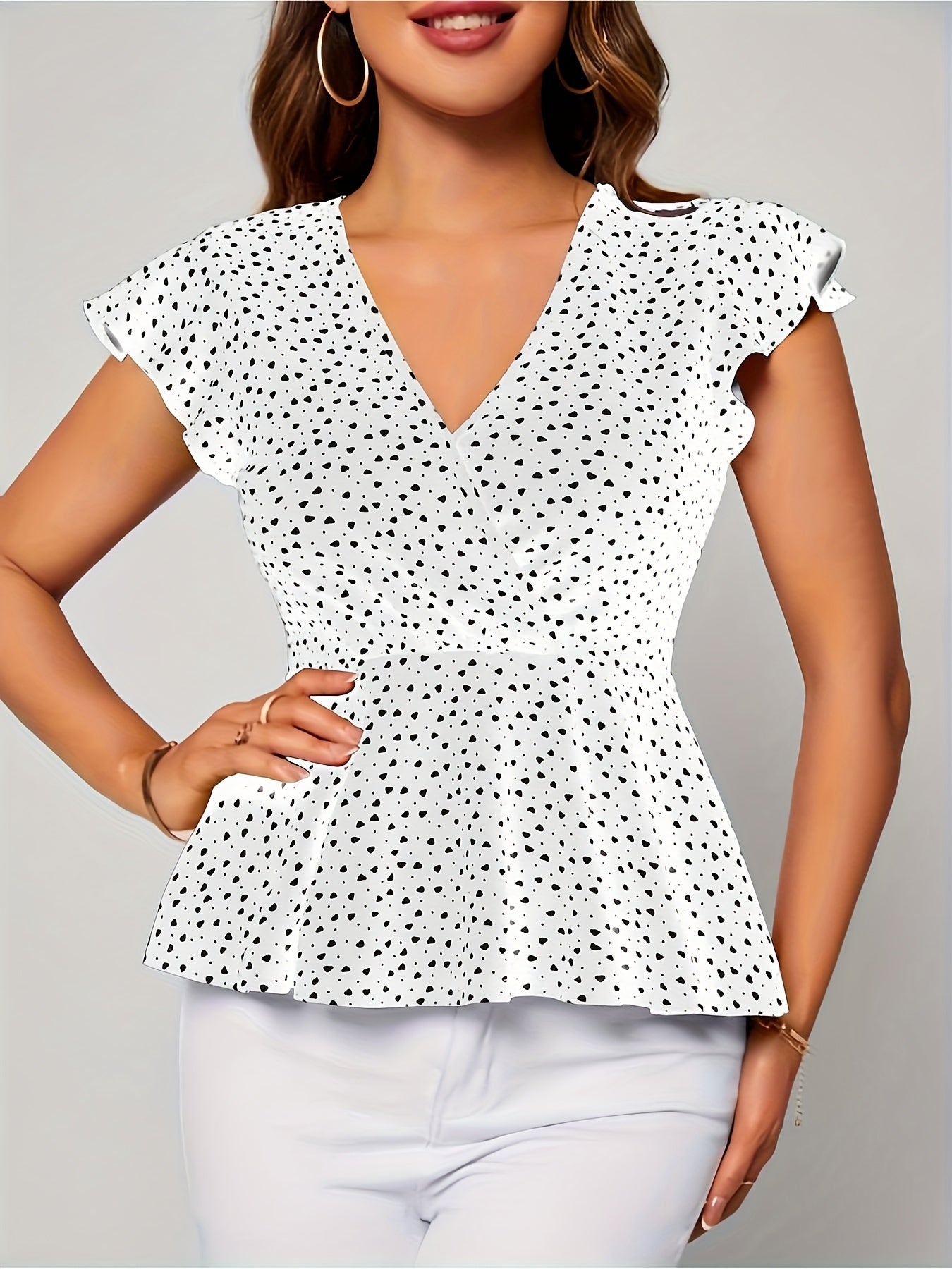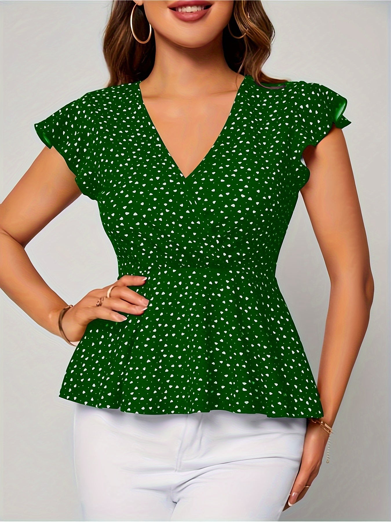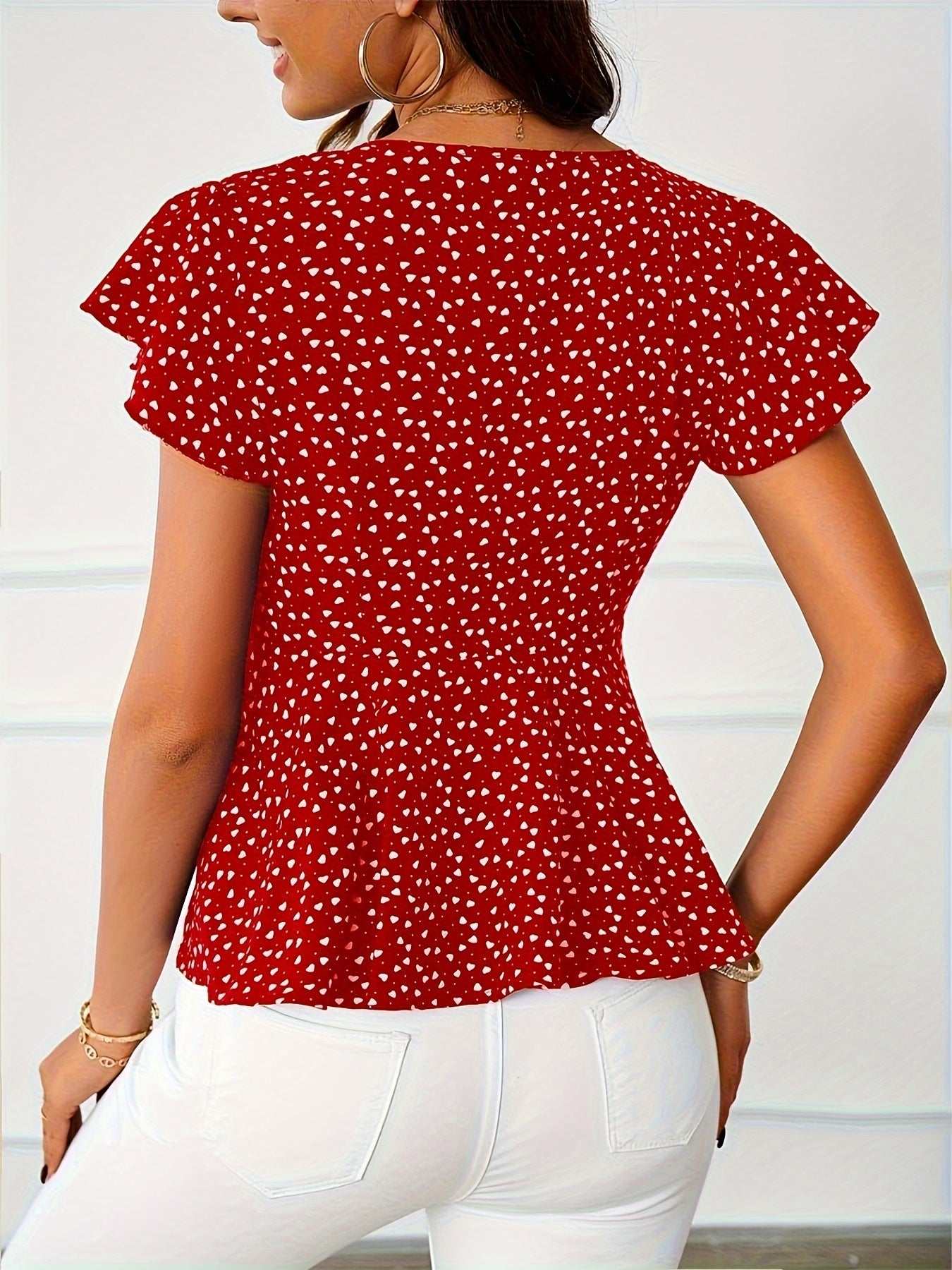 The Women's Allover Print Ruffle Trim Blouse is the perfect blend of style and comfort for the spring and summer seasons. Made from 100% polyester, this elegant V-neck blouse features a charming heart pattern, making it a must-have addition to your wardrobe.