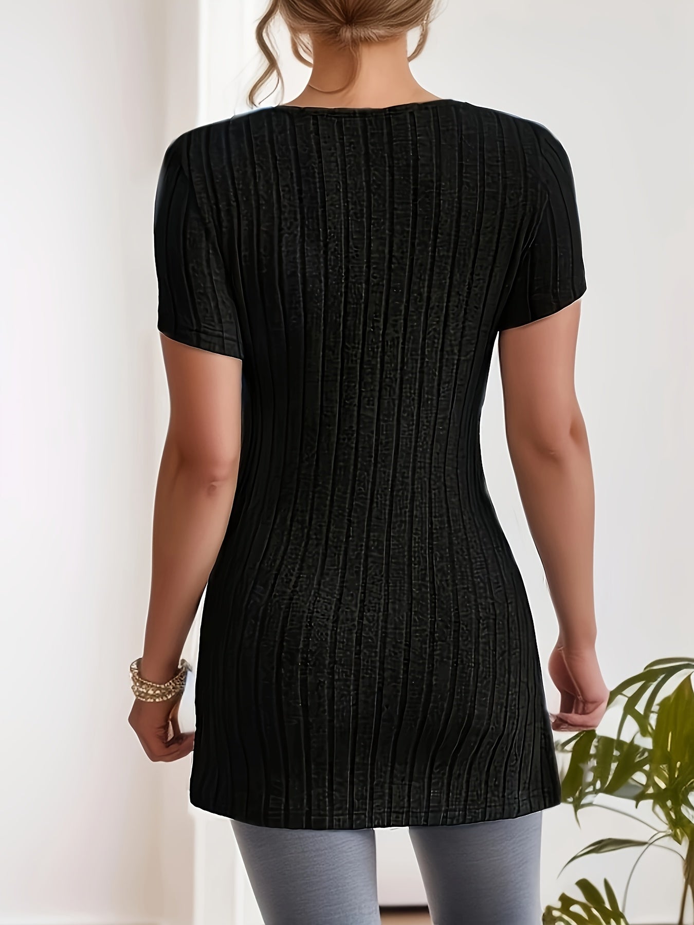 Women's Elegant Zip V-Neck Ribbed T-Shirt - Side-Slit Design