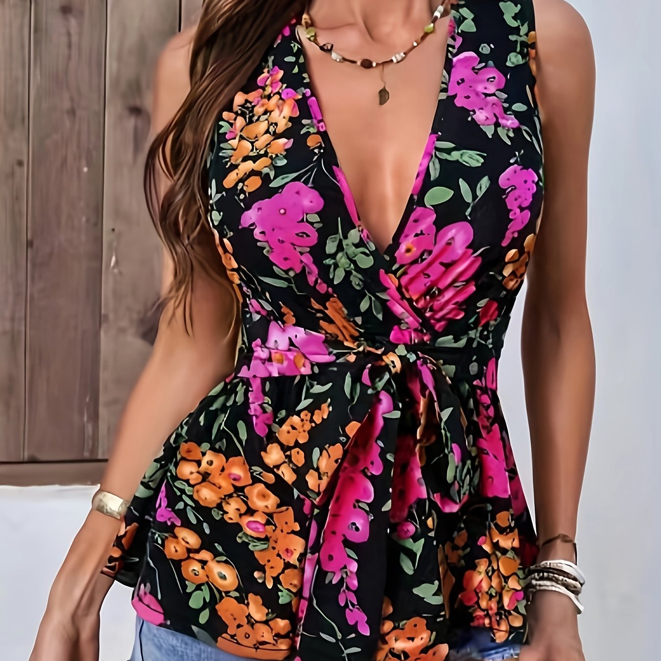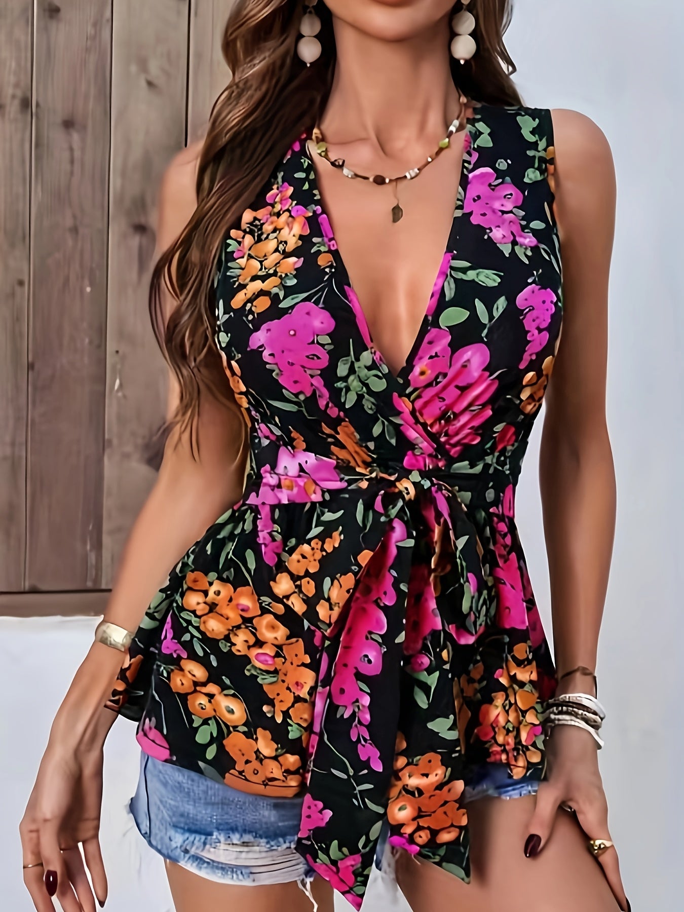 Elevate your summer wardrobe with the Women's Floral Print Sleeveless V-Neck Blouse featuring a stylish tie waist detail. This top is perfect for vacation wear, combining comfort and chic design with its vibrant floral pattern and lightweight polyester fabric.