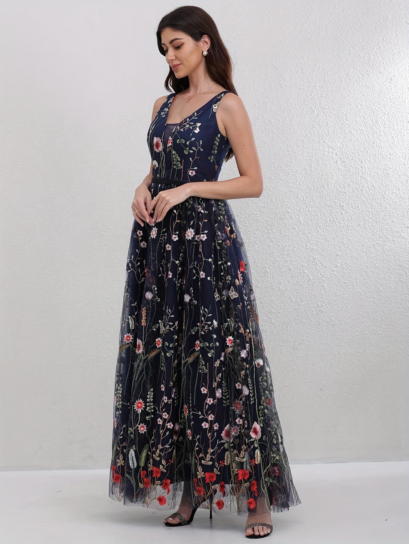 Introducing our Elegant Floral Tulle Prom Dress for Women, a stunning vintage swing gown designed to make you feel exquisite at any formal event. Crafted from 100% polyester mesh, this long-length dress features beautiful embroidered patterns that add a touch of romance and sophistication.