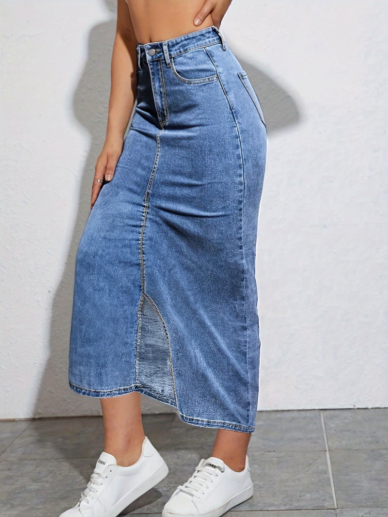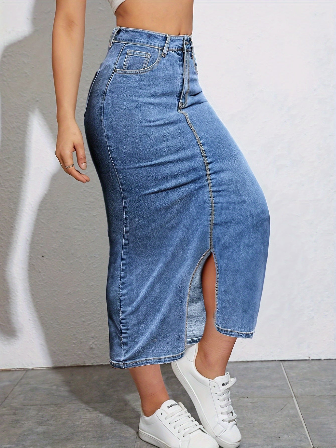 Elevate your fashion game with our Women's High-Waisted Denim Midi Skirt. Its bodycon style complements your curves while the solid light blue color ensures you stand out effortlessly. Whether paired with a casual tee or a dressy blouse, this skirt is your go-to choice for any event. Don't miss the chance to express your unique style with this timeless piece!