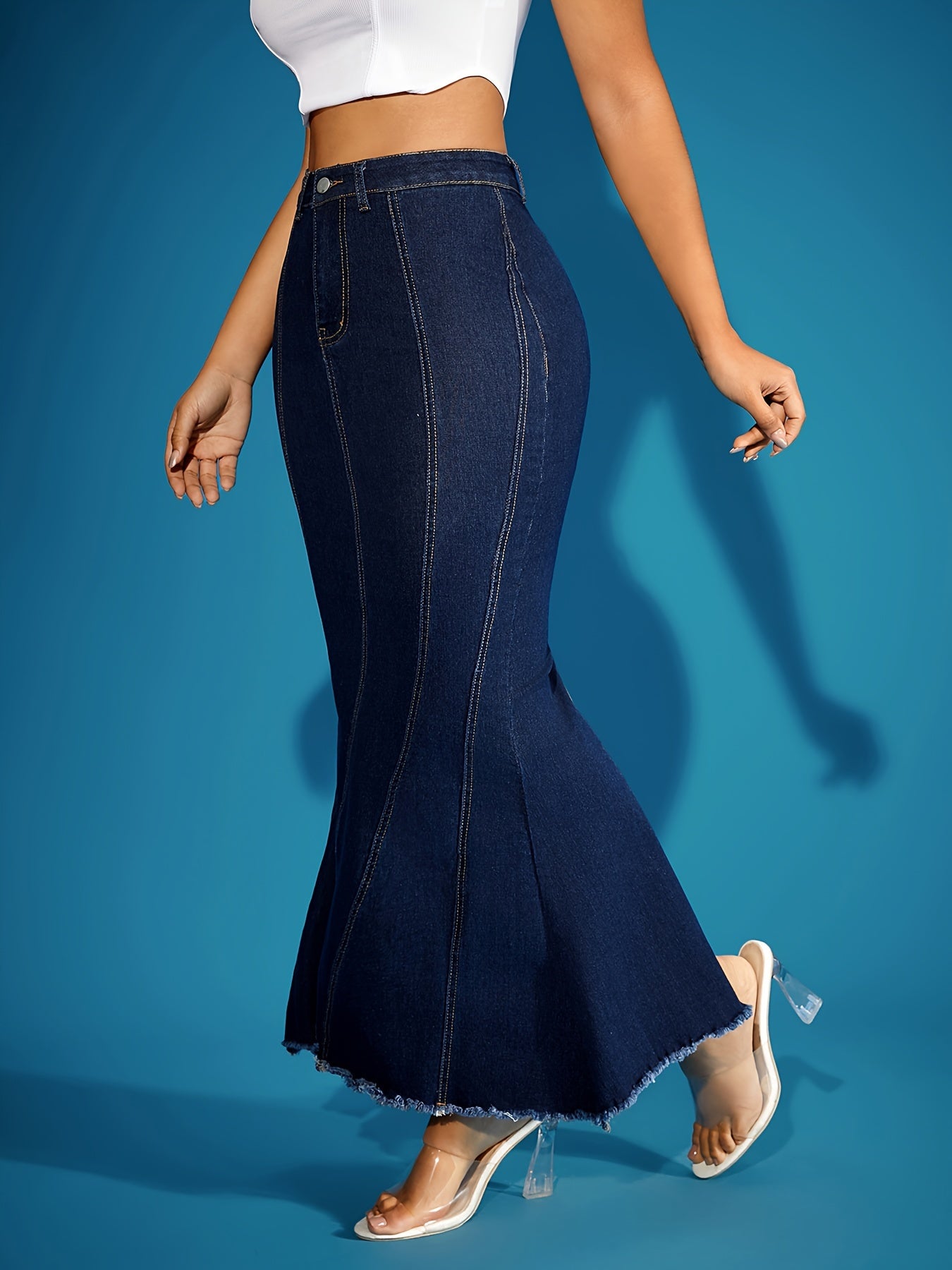 Women's High-Waisted Dark Blue Bodycon Maxi Denim Skirt - Raw Hem