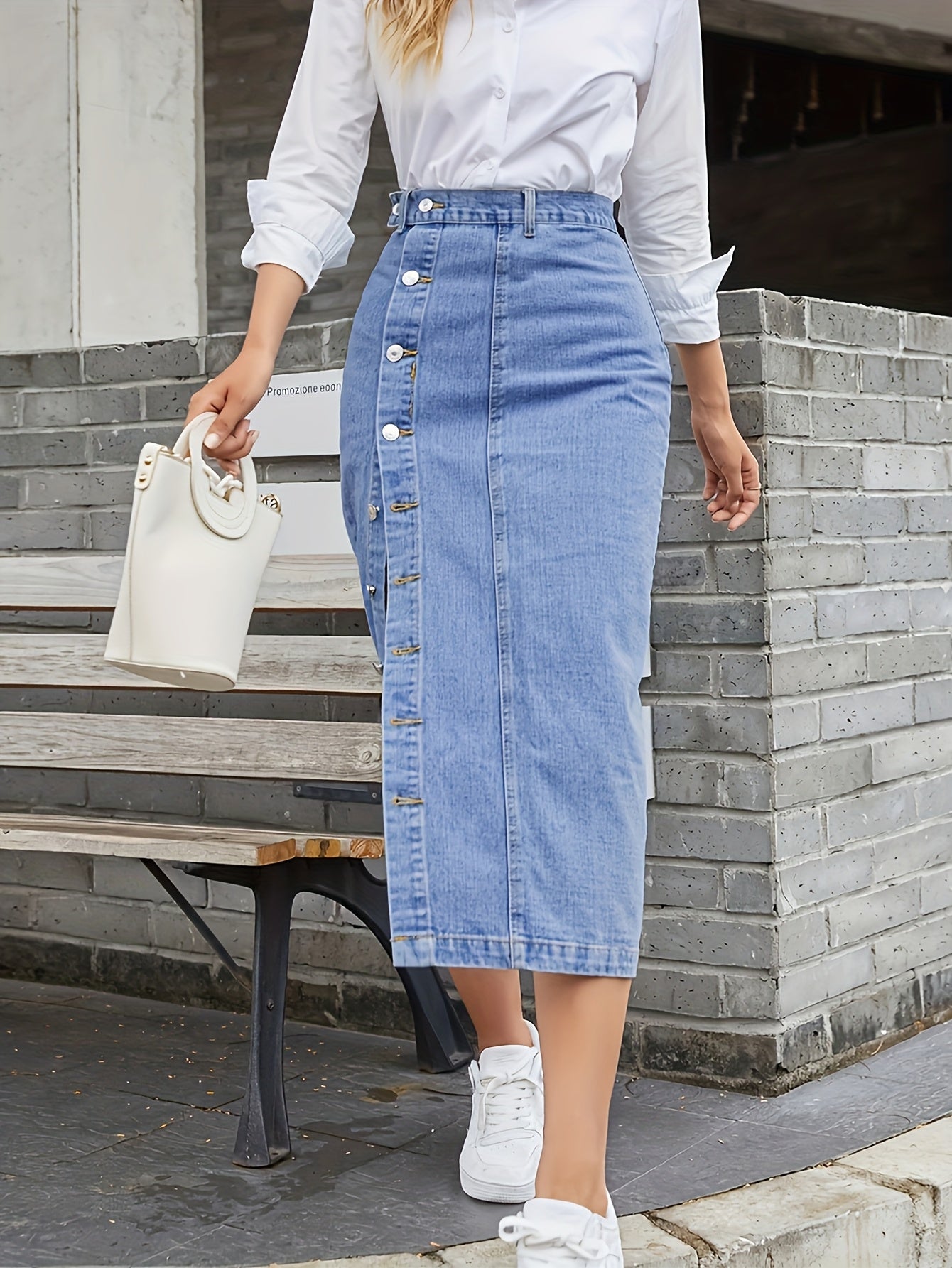Elegant High-Waist Denim Skirt - Front Button & Slit Design