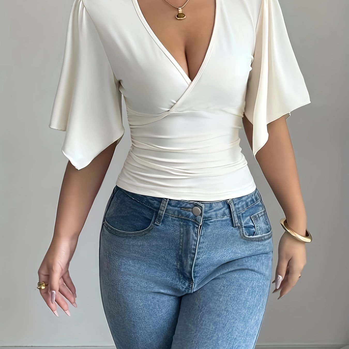 Elevate your wardrobe with this stunning Women's Elegant Deep V-Neck Pleated T-Shirt. Its sweet ruffle sleeves and mid-elasticity fabric ensure a flattering fit, perfect for dressing up or down. Pair it with your favorite jeans or skirt for a chic look that transitions seamlessly from day to night. Don’t miss out on this essential piece that combines fashion and functionality!