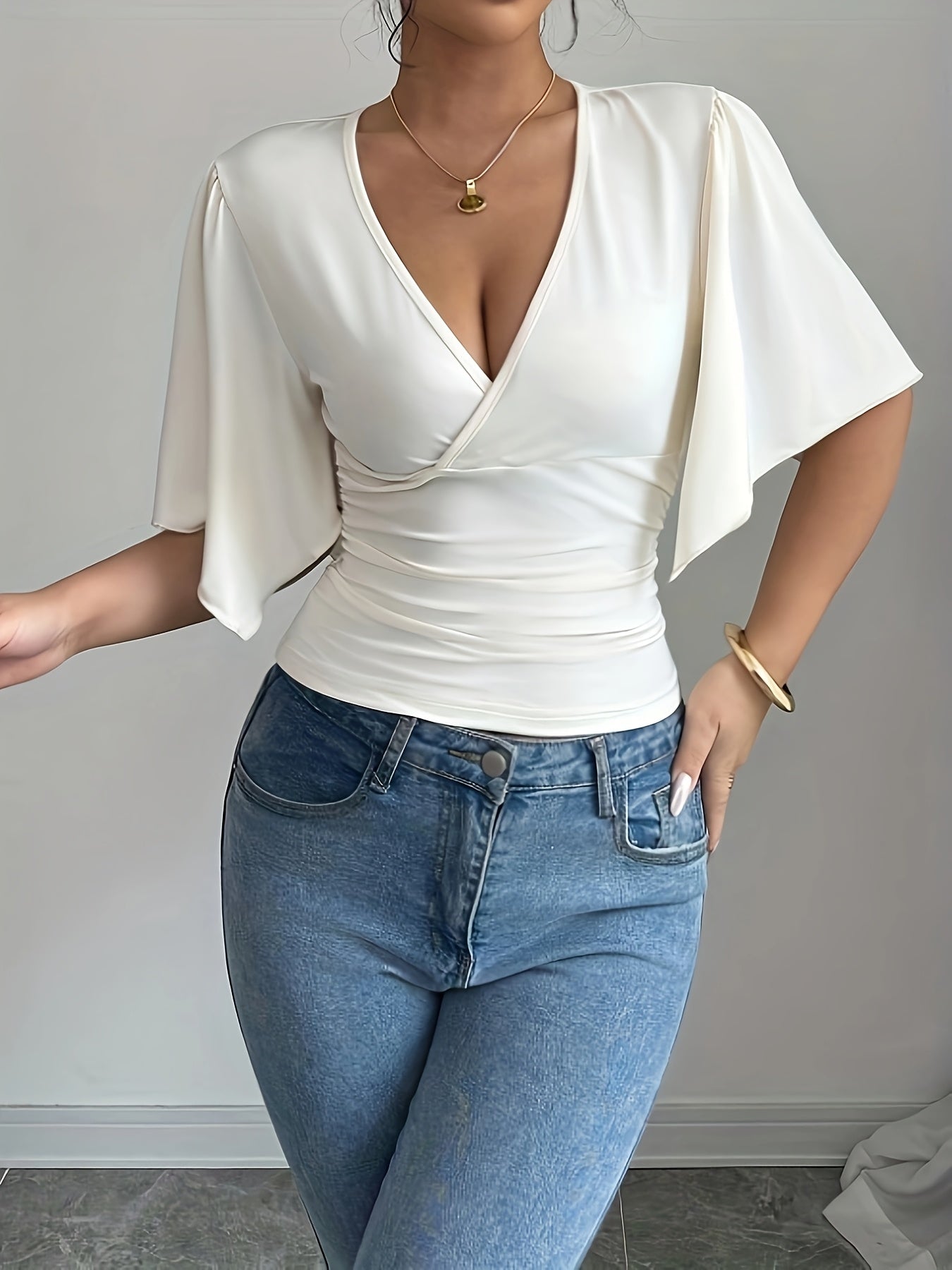Women's Deep V-Neck Pleated T-Shirt - Elegant Slim Fit Top