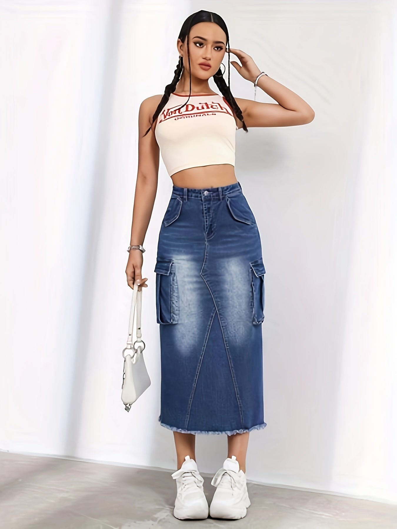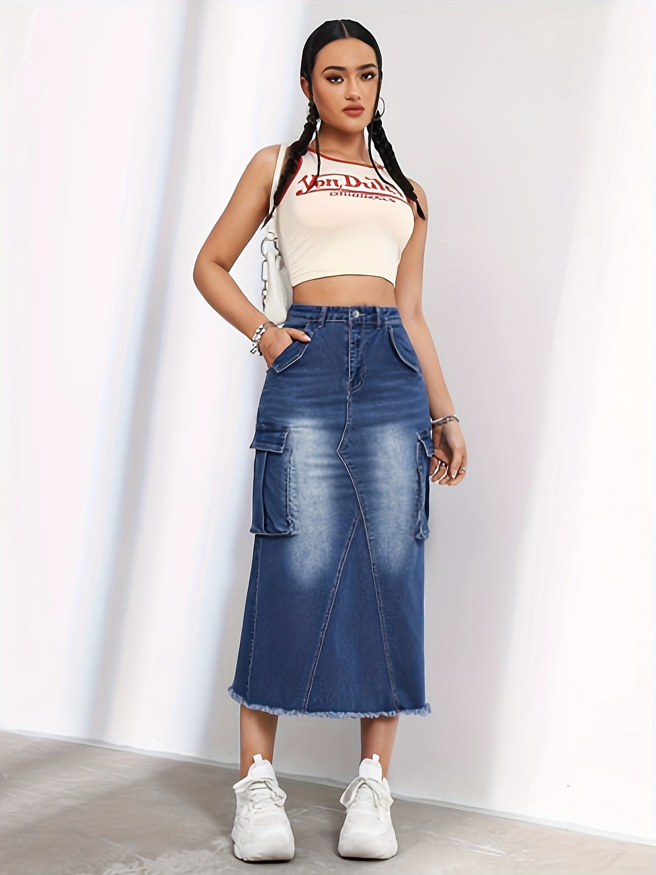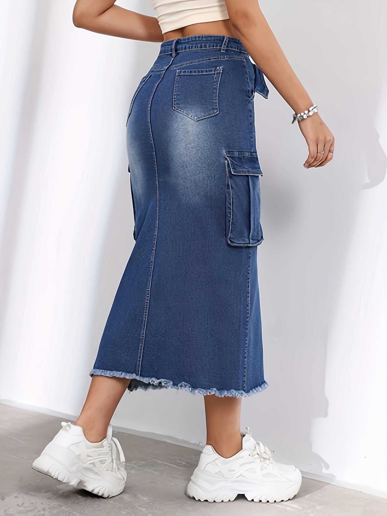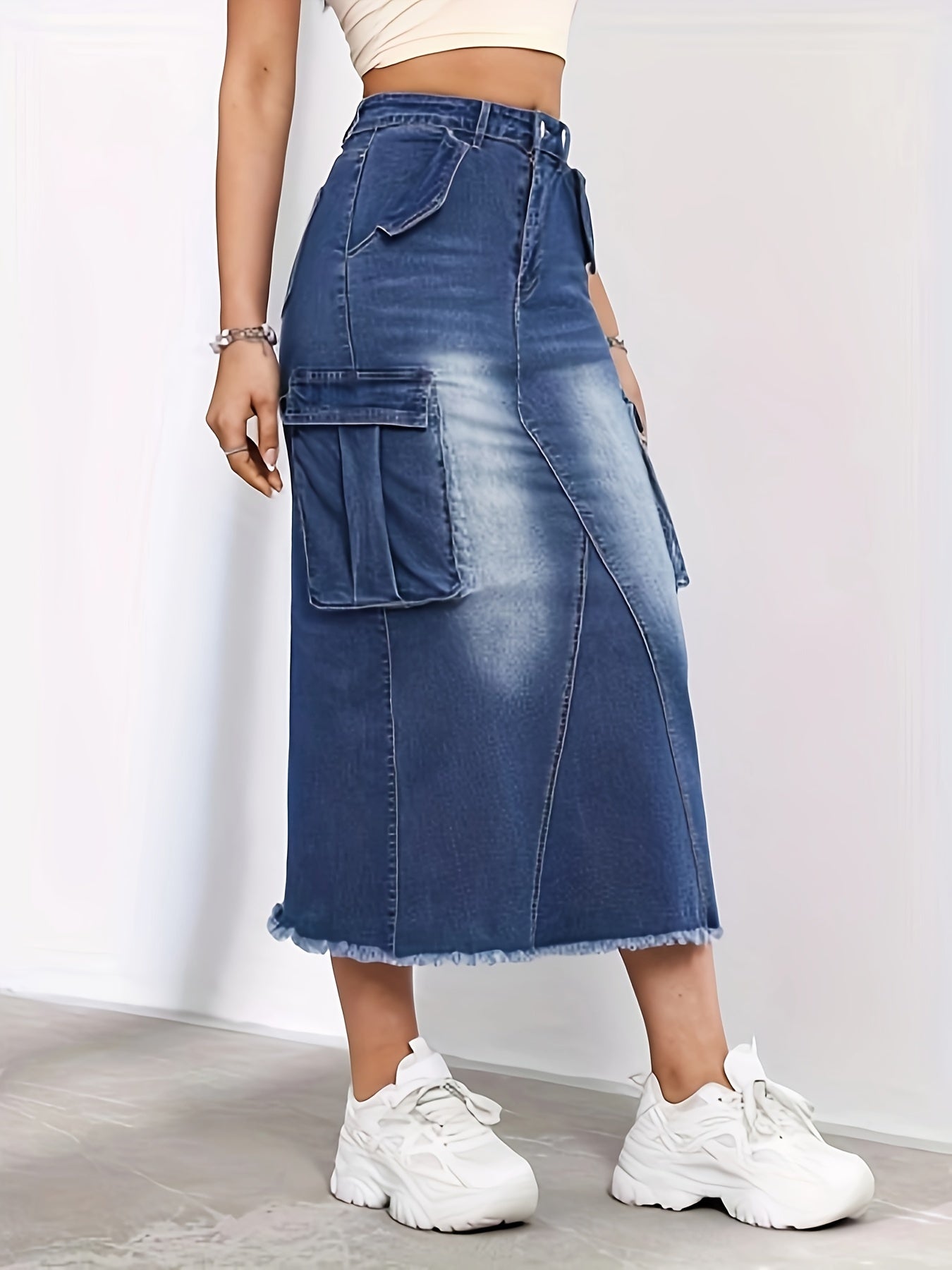 Discover the perfect blend of comfort and style with our Women's Denim Midi Skirt. Whether you're heading out for brunch or enjoying a relaxed afternoon, this skirt is a must-have. With its trendy flared design and practical pockets, it adds a chic touch to your everyday look.