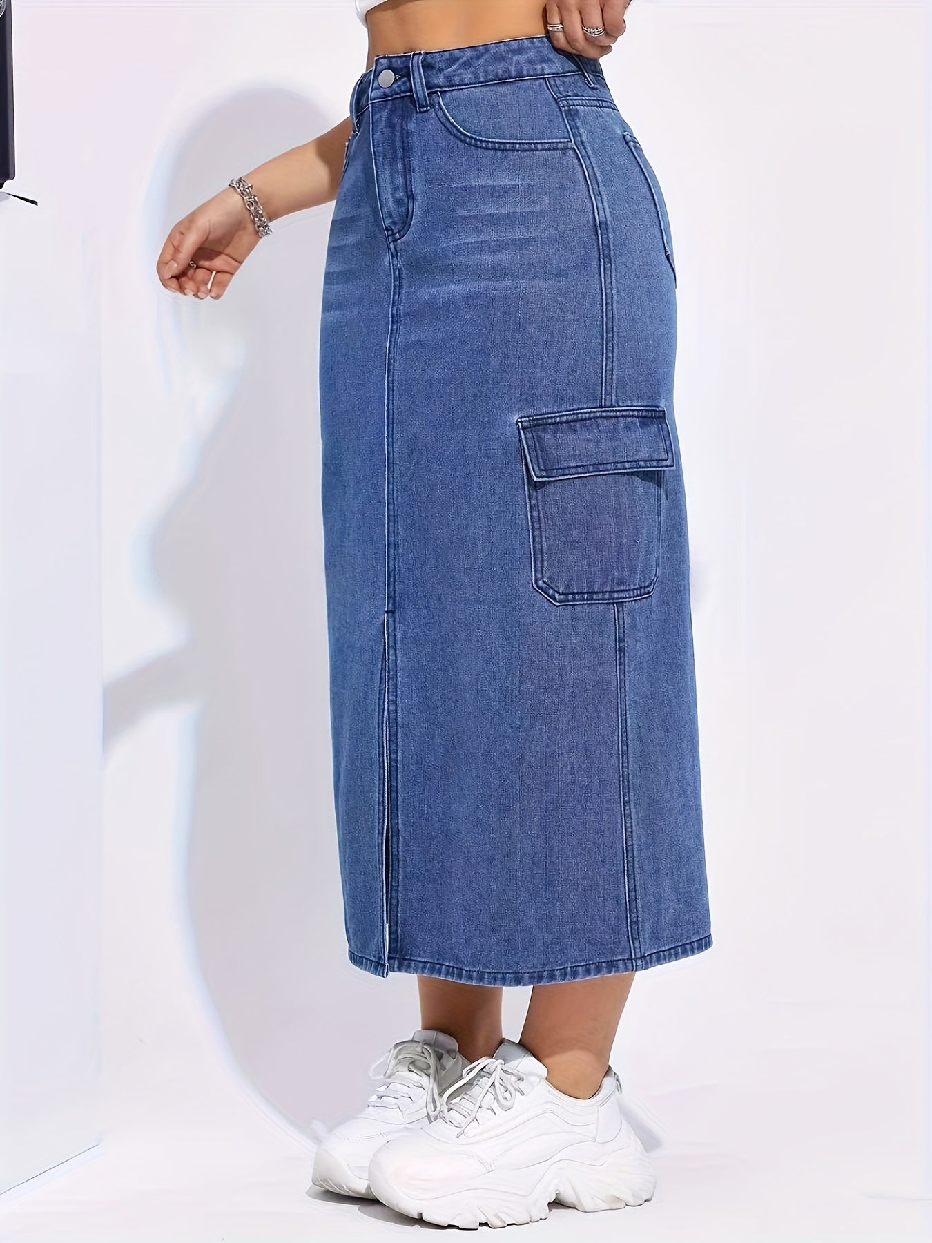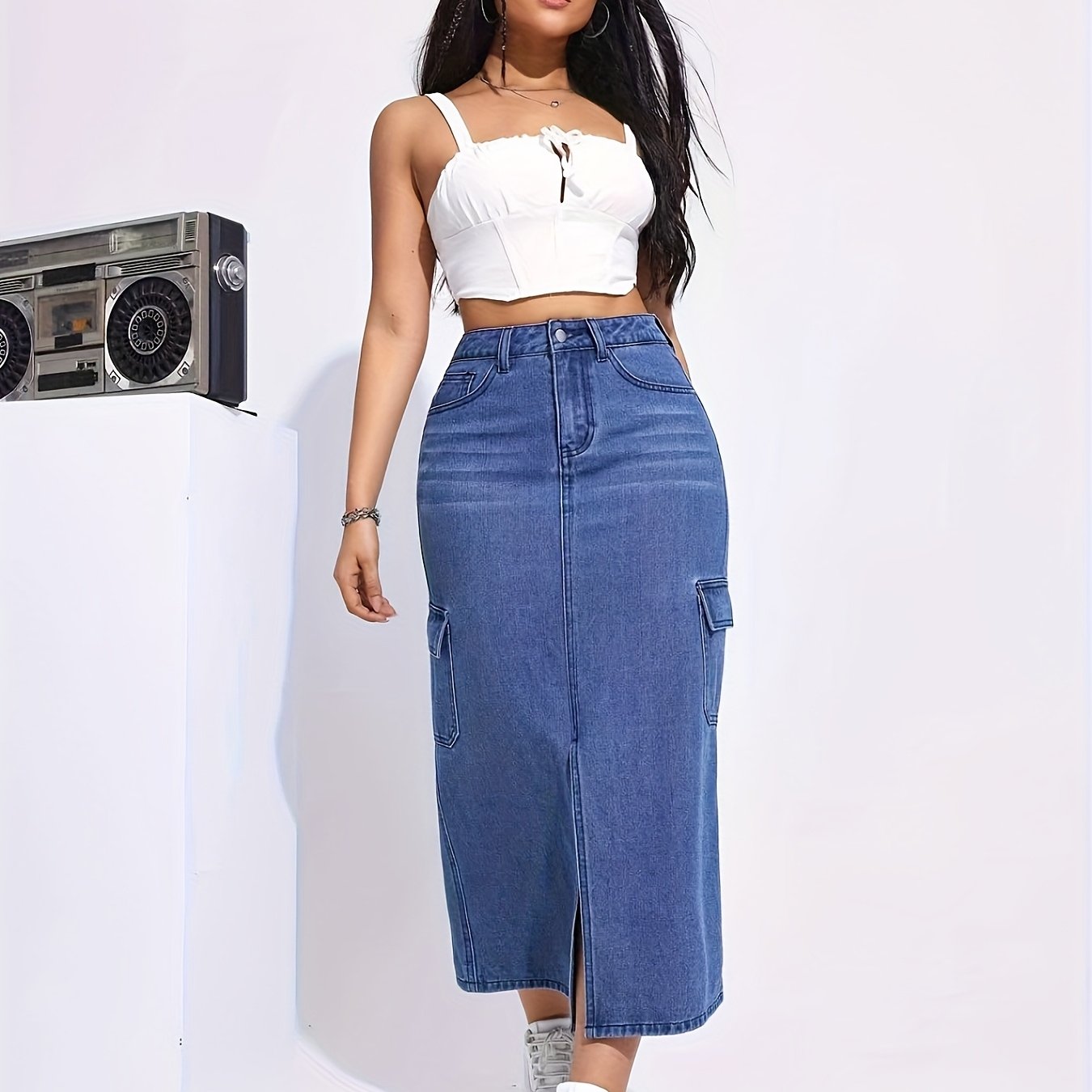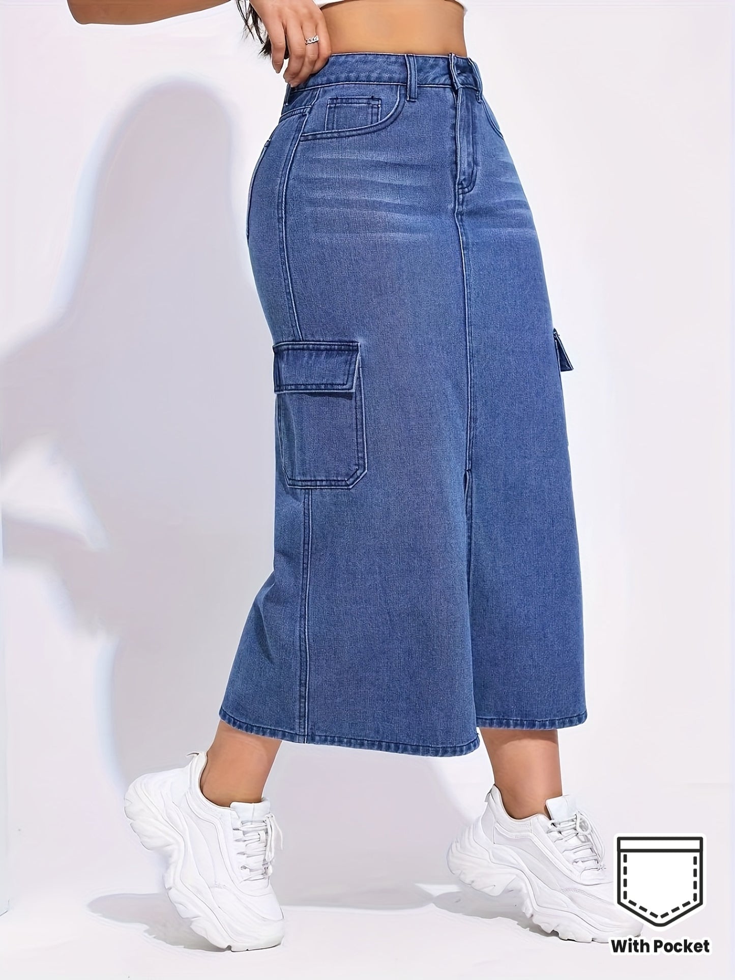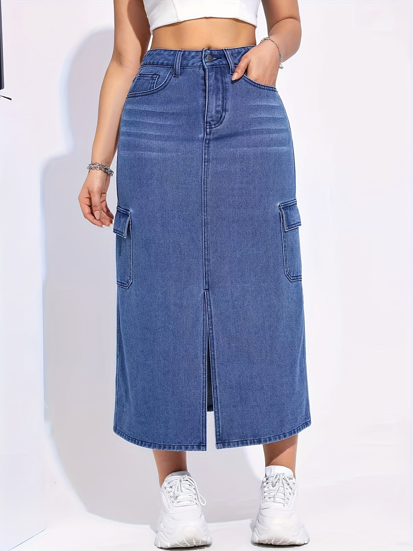 Women's High Waist Stretch Denim Slit Skirt - Casual Cargo Style