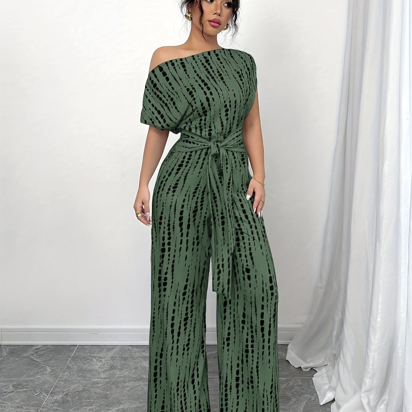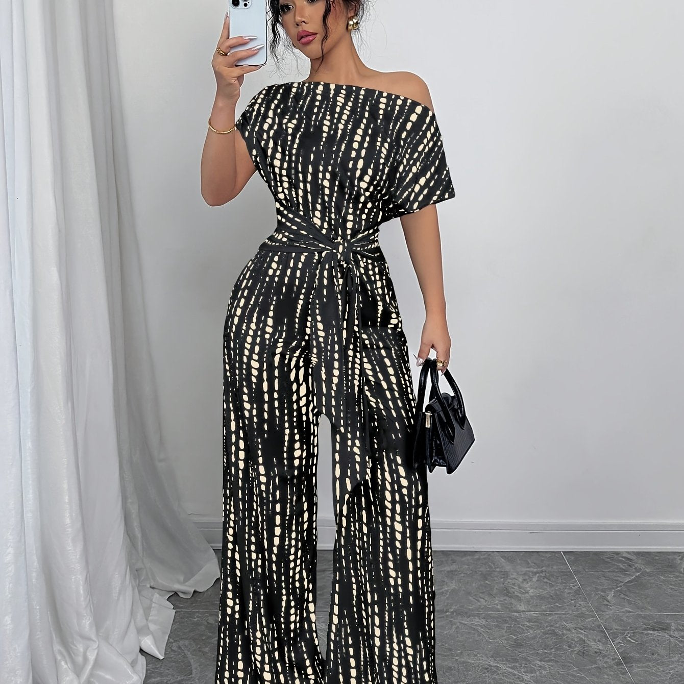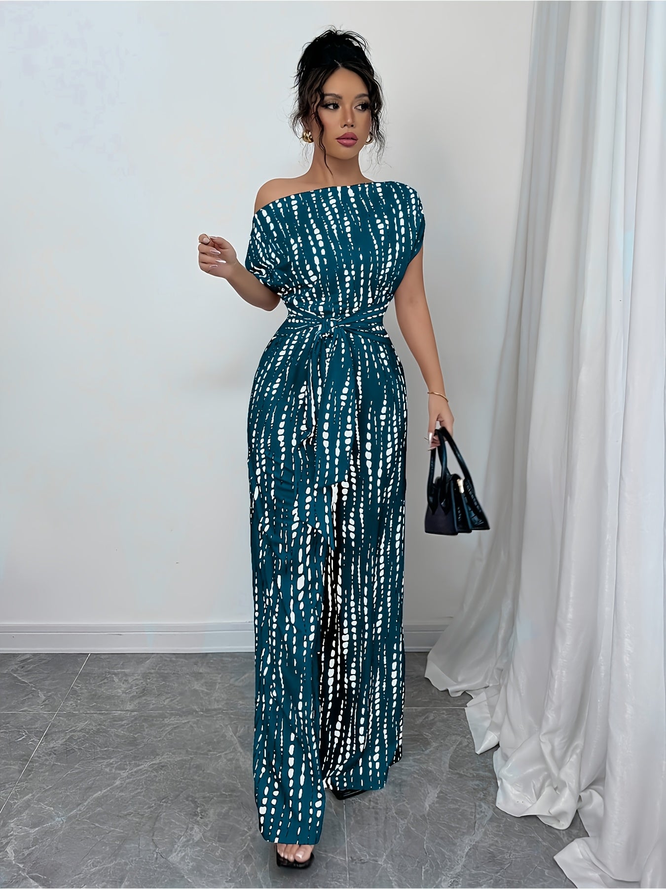 Add a statement piece to your summer wardrobe with our Elegant Off-Shoulder Geometric Jumpsuit. Perfect for casual outings or special events, this jumpsuit combines style and functionality. The machine-washable fabric makes maintenance a breeze, ensuring you always look your best with minimal effort.