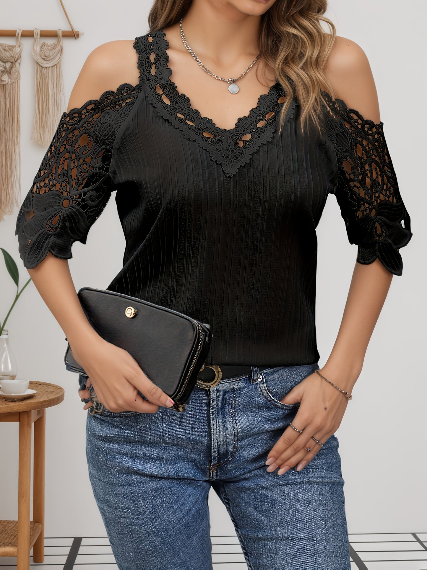 Elegant V-Neck Lace Blouse for Women - Summer Puff Sleeve Top