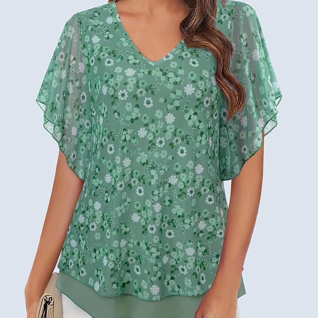 Introducing our Women's Elegant Floral Print V-Neck Blouse, a stunning semi-sheer double-layer mesh waist tie top designed for versatility across spring, summer, and fall. This chic shirt combines comfort with style, making it perfect for both casual outings and formal occasions.