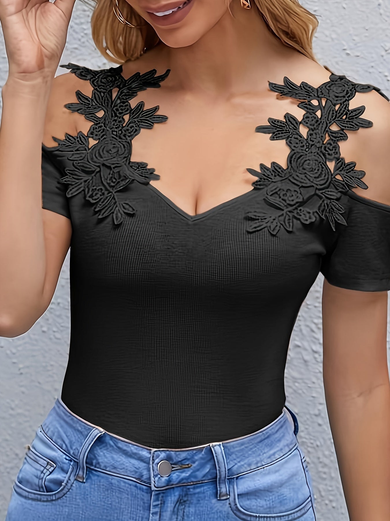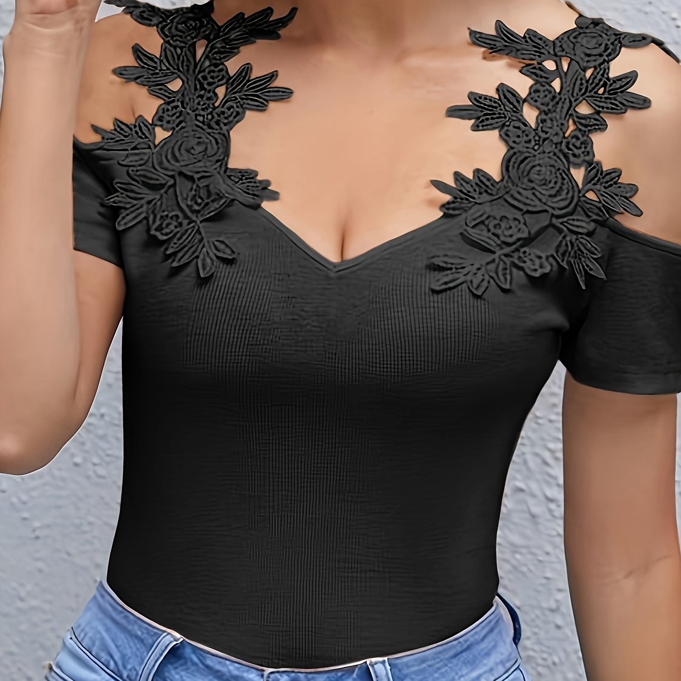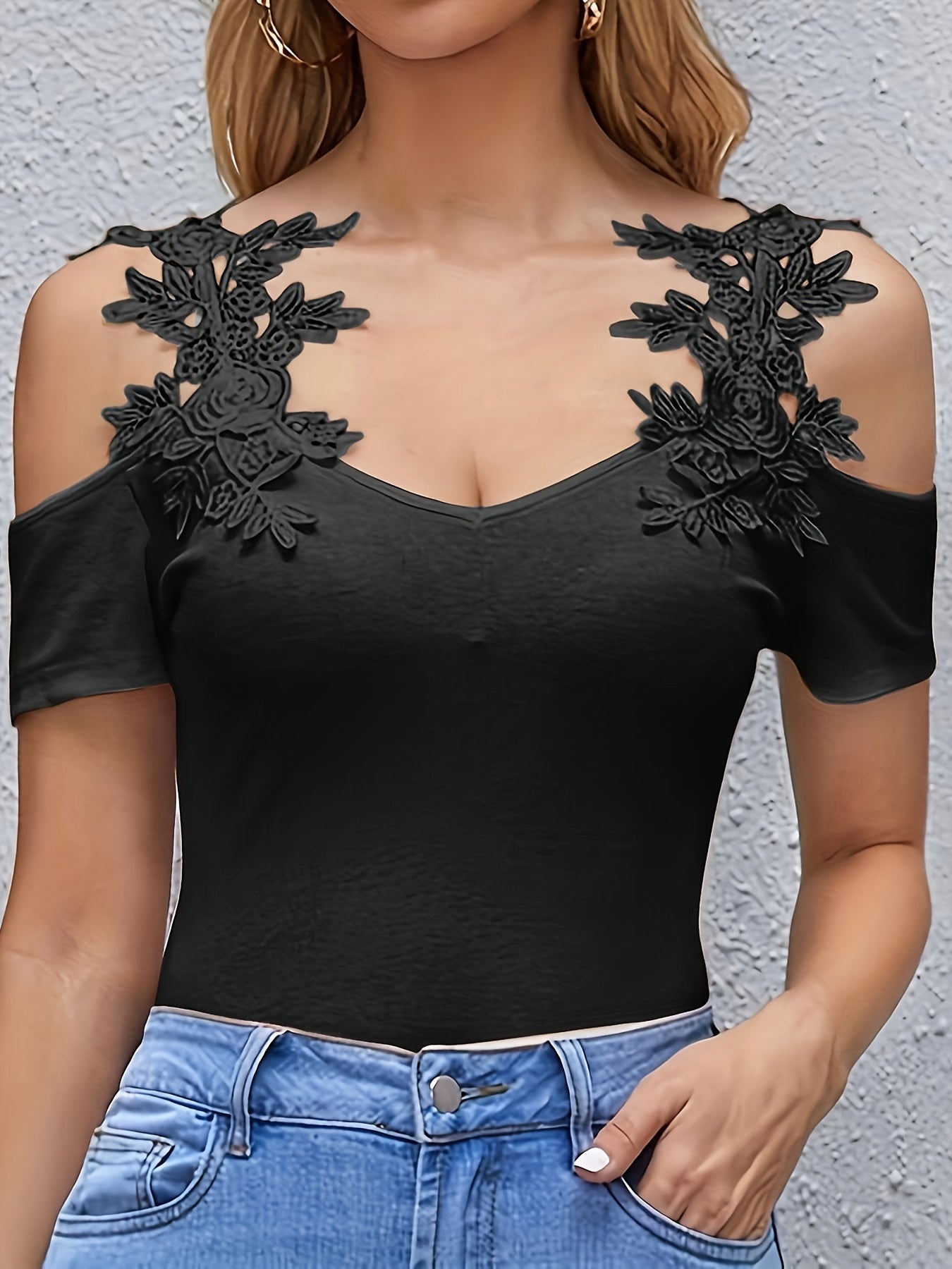 Elevate your casual ensemble with our Women's Chic V-Neck Lace T-Shirt. Its timeless style and comfortable fit make it a versatile piece that pairs seamlessly with jeans, shorts, or skirts. Embrace a chic yet relaxed look with this essential top that showcases your unique style and sophistication.