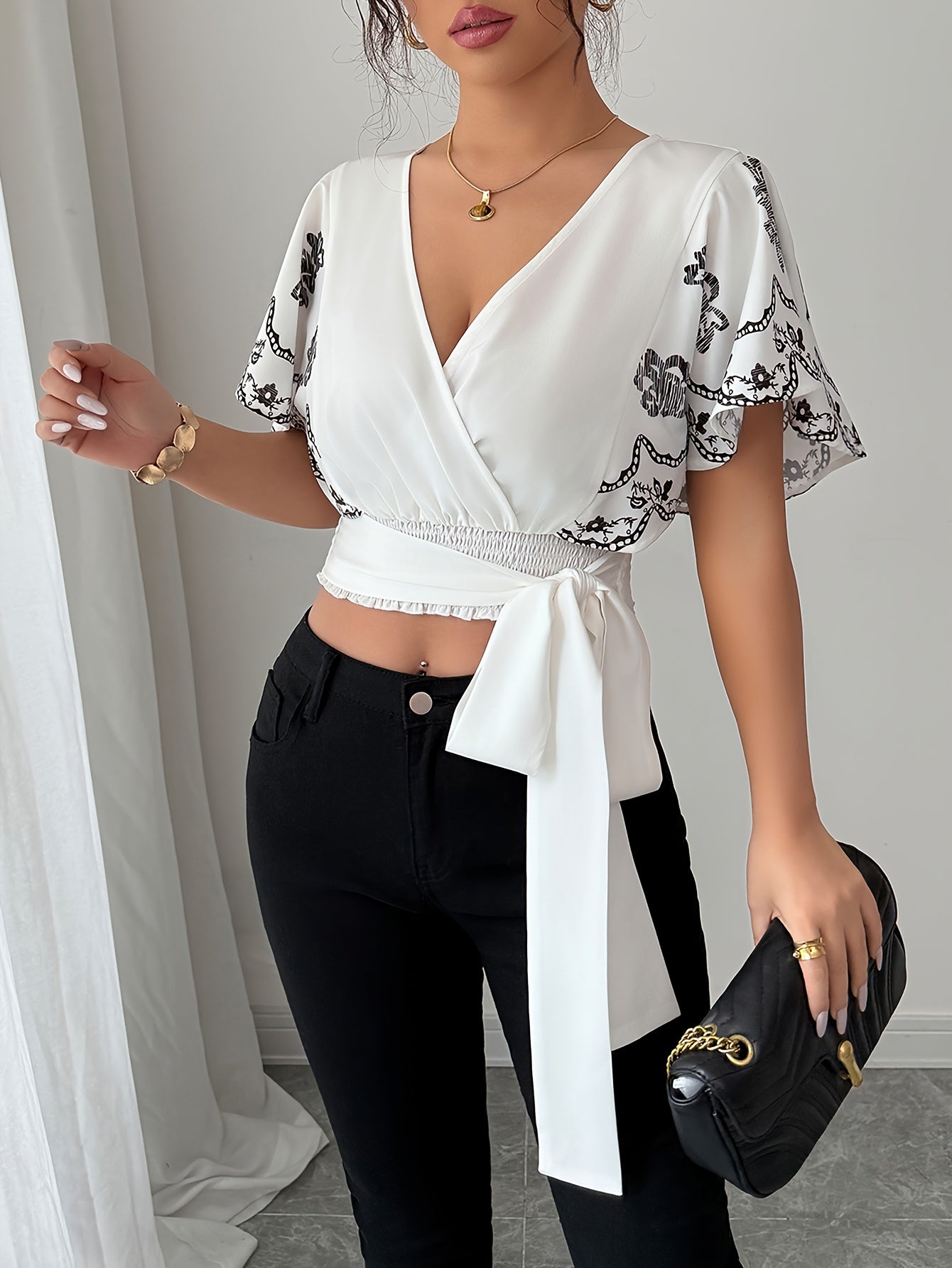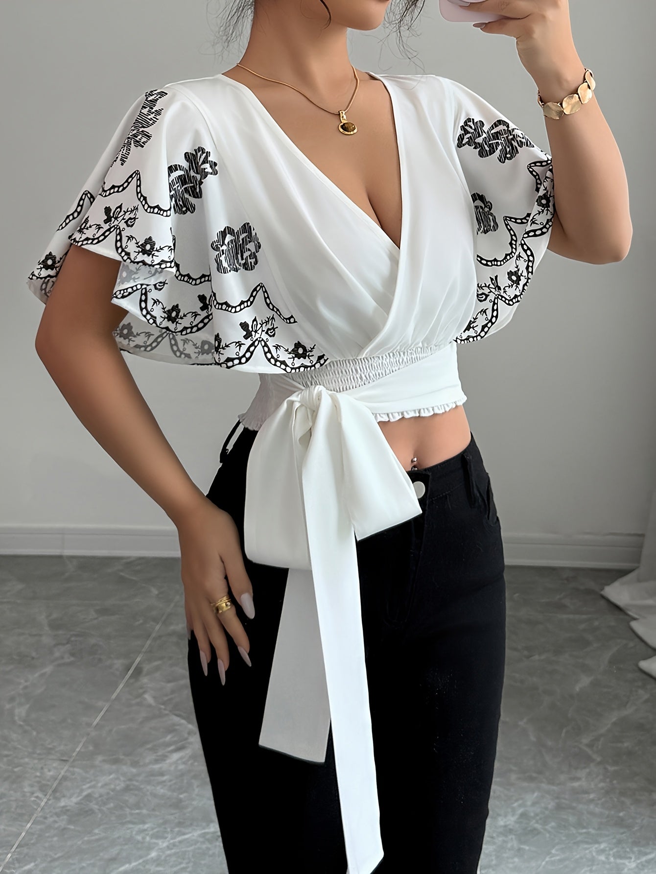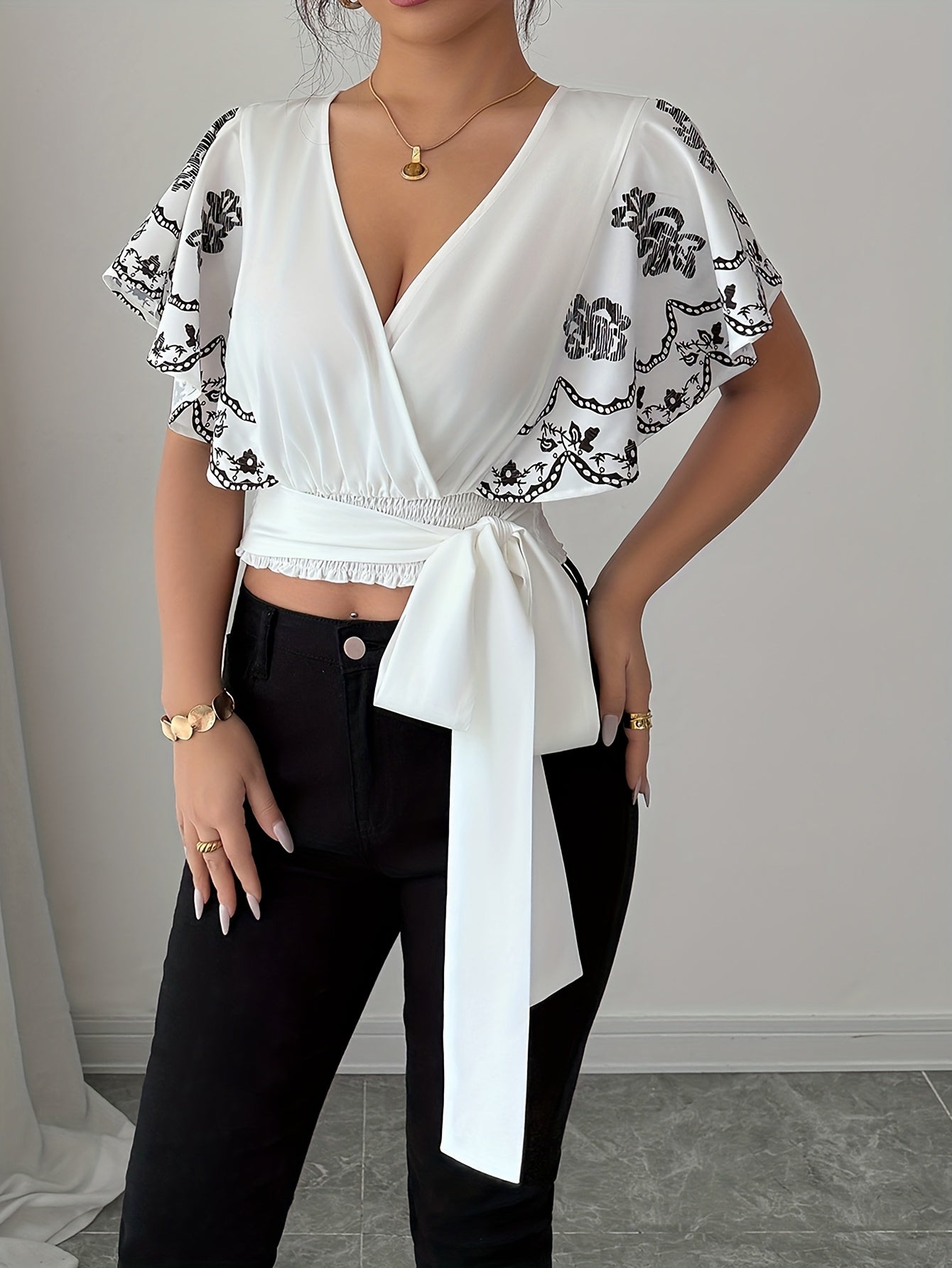 Introducing our Elegant White V-Neck Blouse, designed with ruffle sleeves and a stunning geometric pattern. Made from 100% high-quality polyester, this blouse combines comfort with elegance, making it perfect for your summer night out wardrobe.