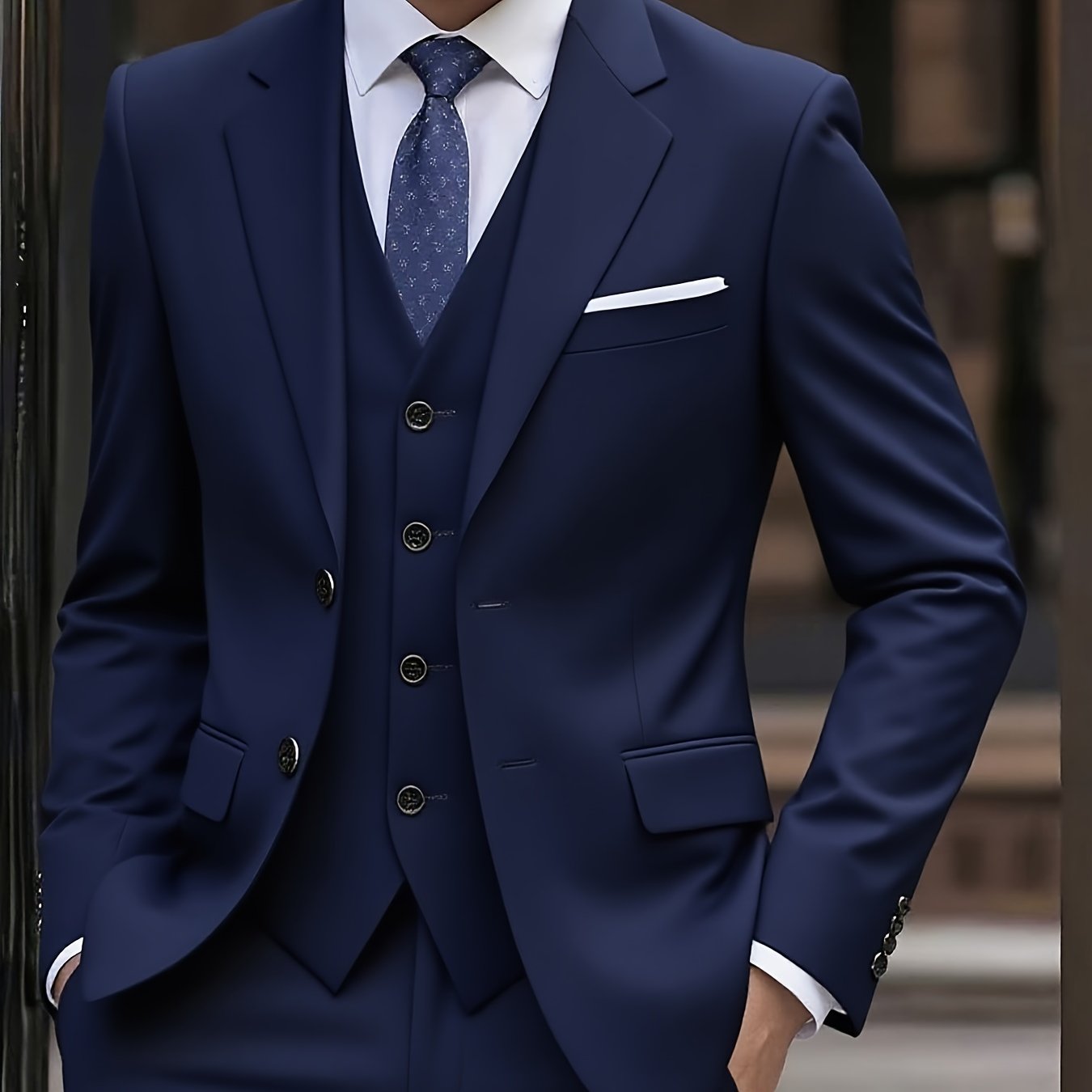 Elevate your wardrobe with our Men's Premium Three-Piece Suit Set, featuring a sophisticated jacket, pants, and vest in a solid color. Perfect for formal wear, weddings, and professional events, this regular fit suit showcases a timeless button-up design with a classic lapel collar and long sleeves.