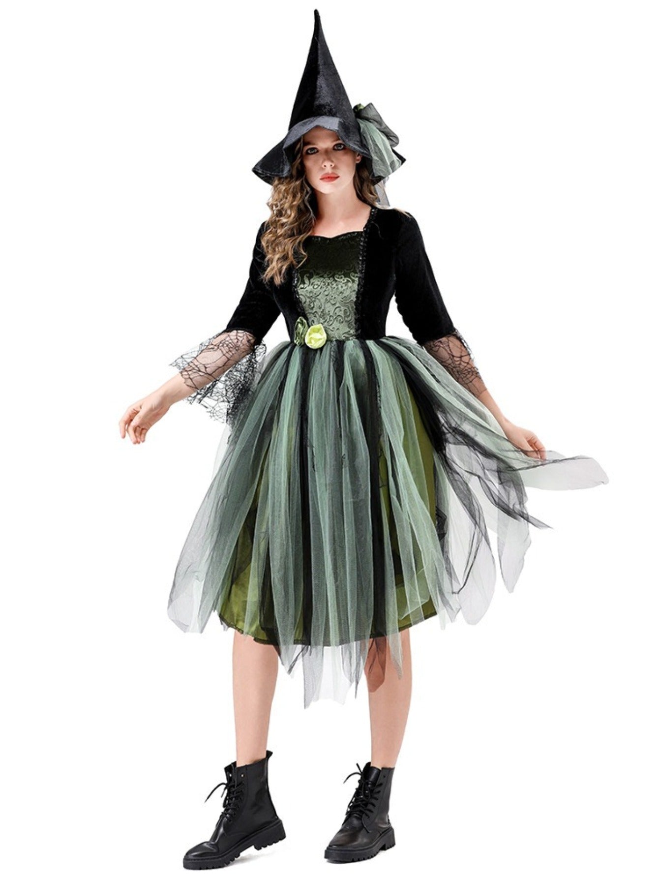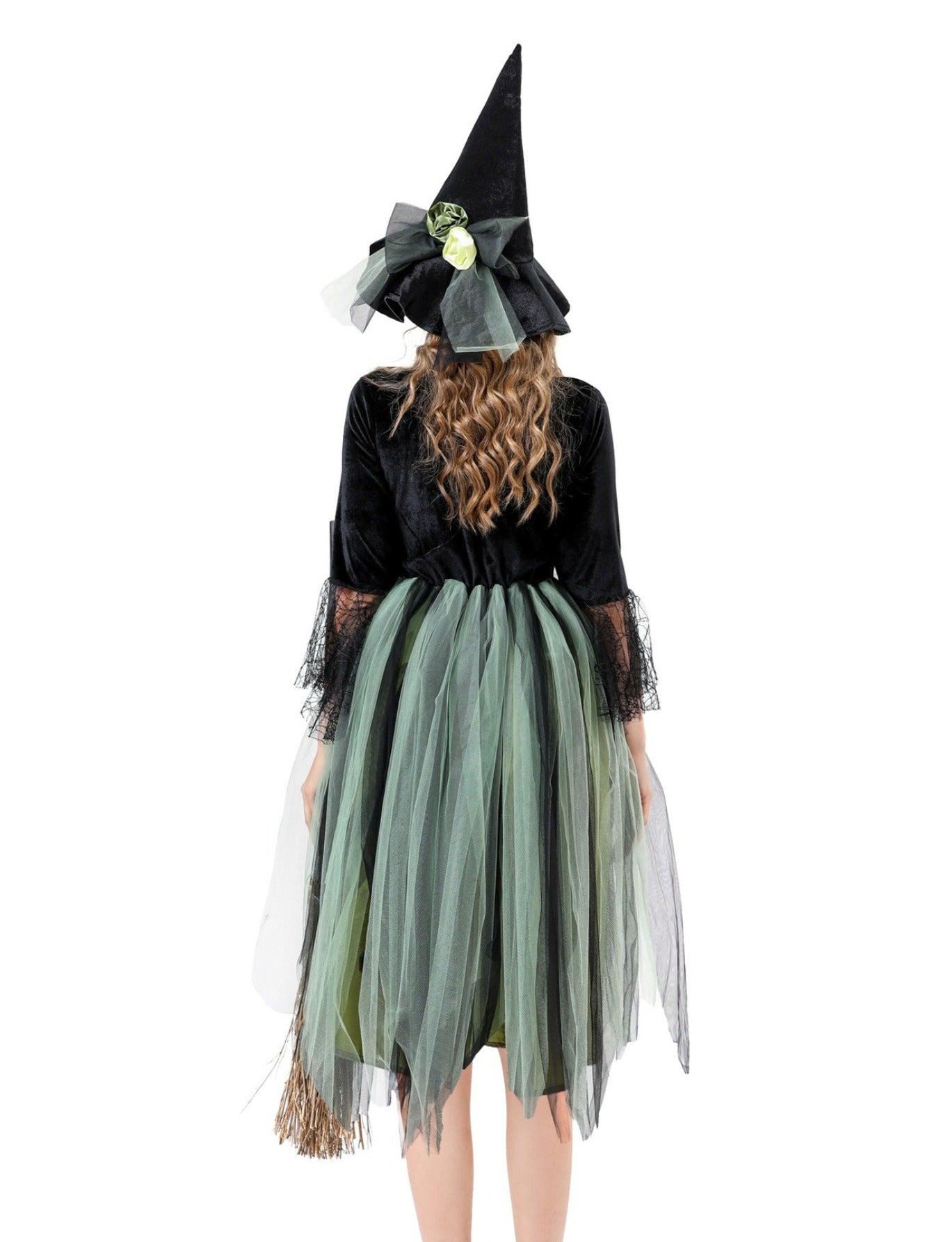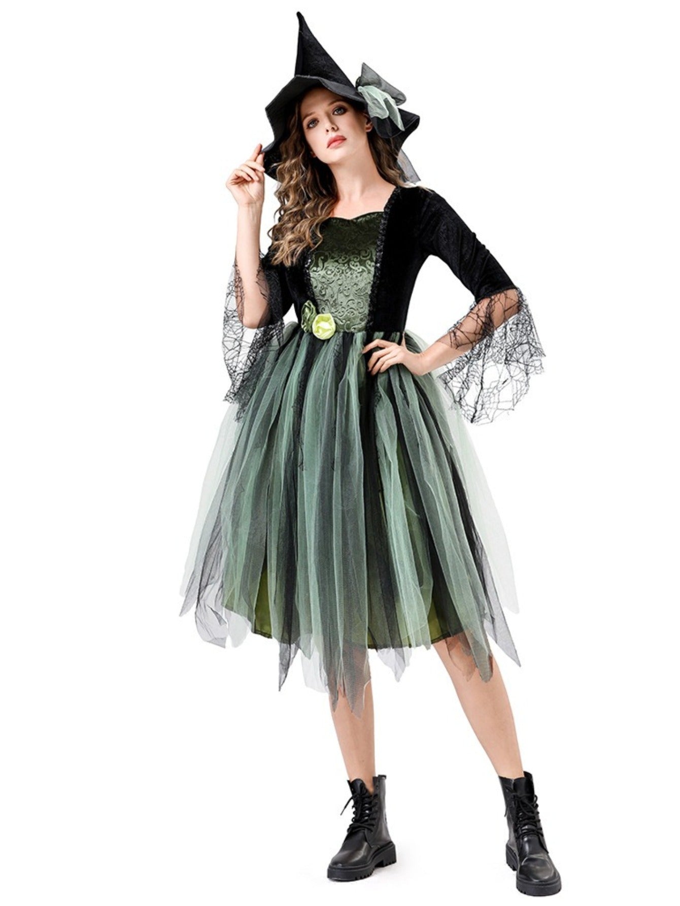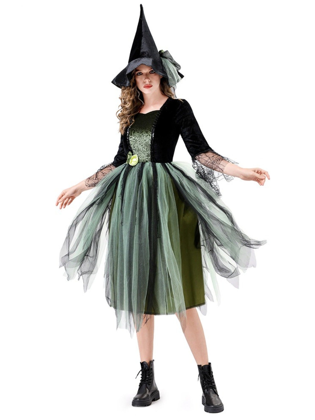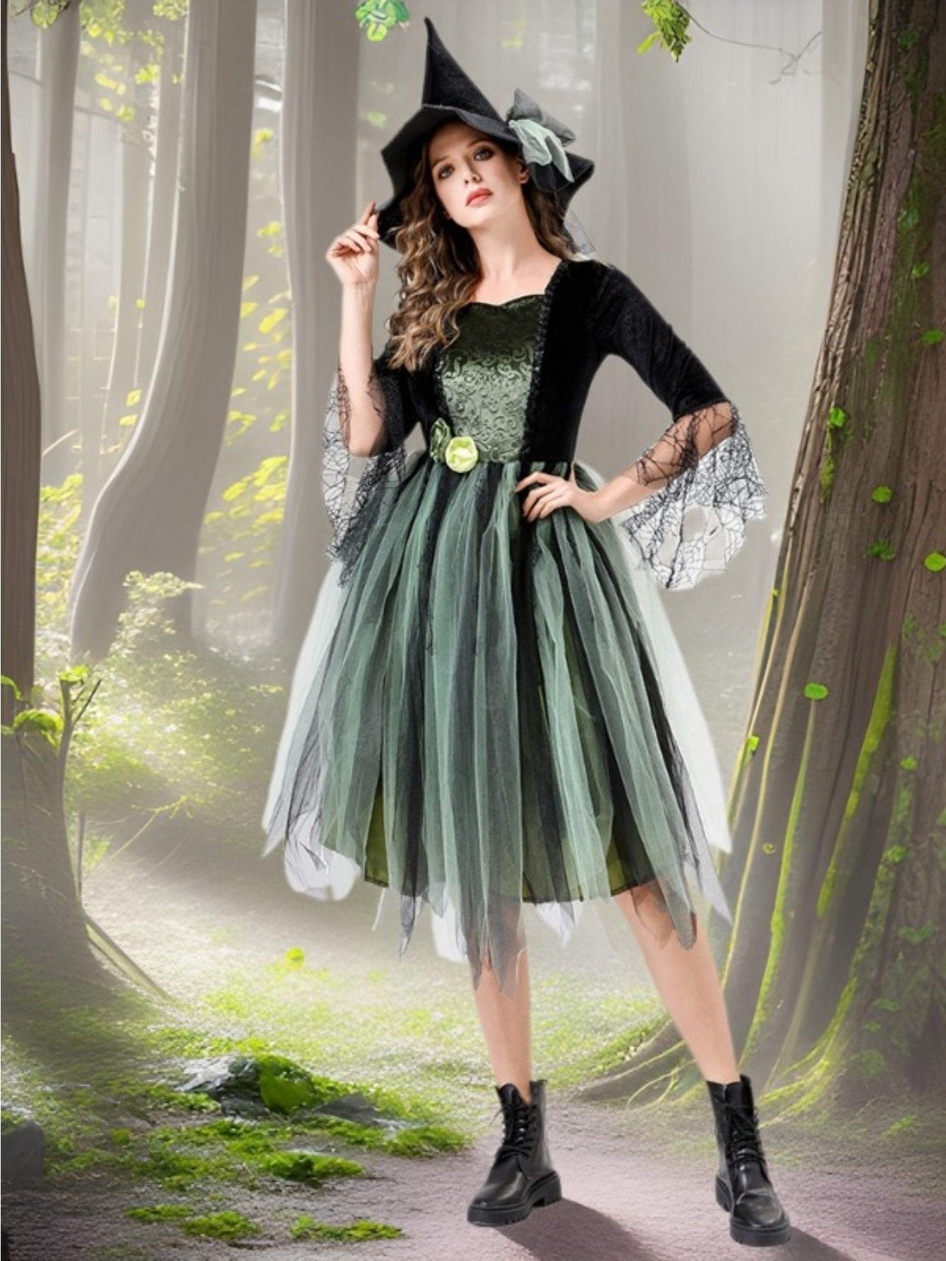 Unveil your inner enchantress this Halloween with the Lianyaoshi Elegant Halloween Witch Costume for Adults. Featuring a stunning square neck design and long sleeves, this costume showcases a chic tiered skirt complemented by exquisite lace detailing in black and green, making it the perfect choice for cosplay, stage performances, and themed parties.