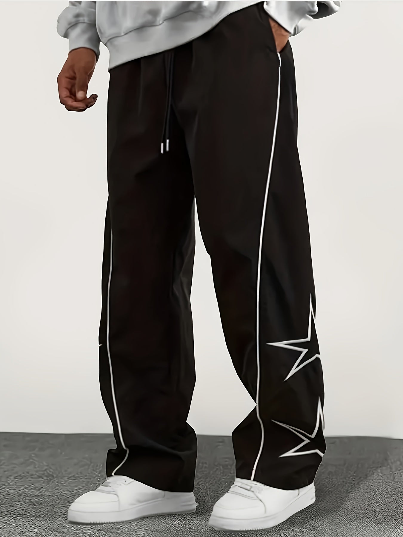 Pantalones casuales de hombre de tejido grueso - Pernera ancha con cordón ajustable y bordado de estrella.