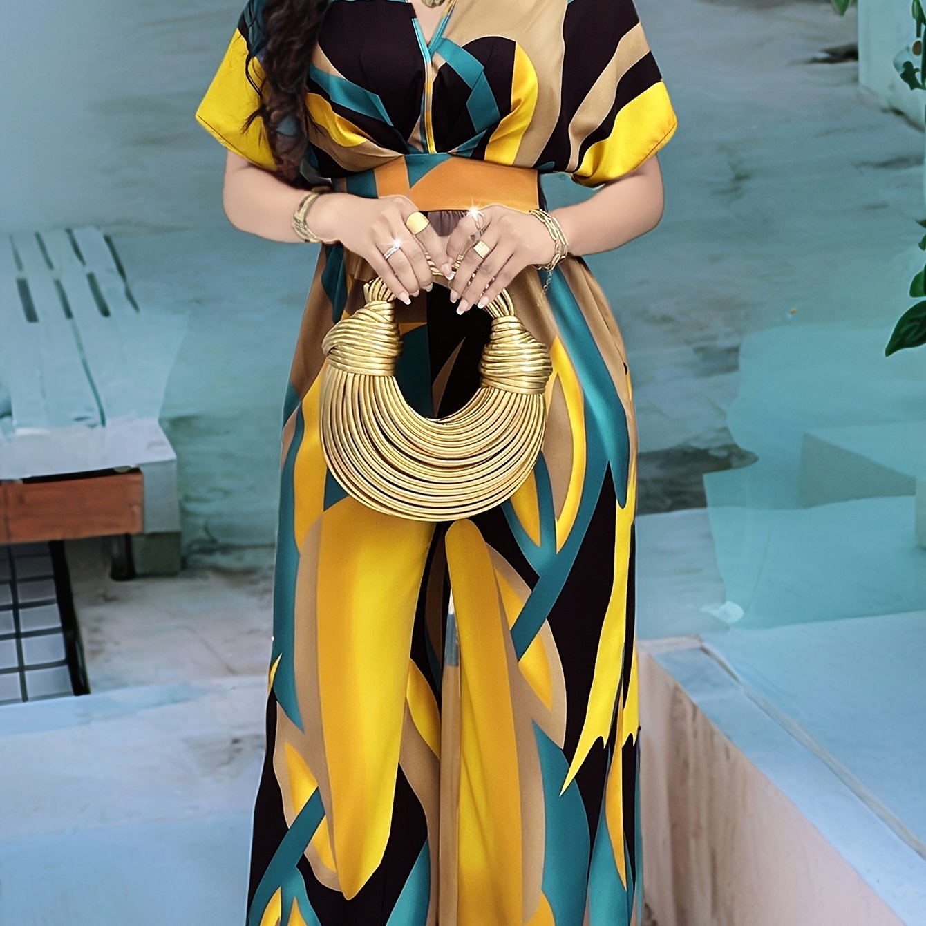 Discover the perfect blend of style and comfort with our Women's Elegant Batwing Sleeve Jumpsuit. This chic V-neck jumpsuit features an eye-catching abstract print, crafted from high-quality polyester for a luxurious feel. Ideal for summer occasions, it showcases a contemporary silhouette that flatters every figure.