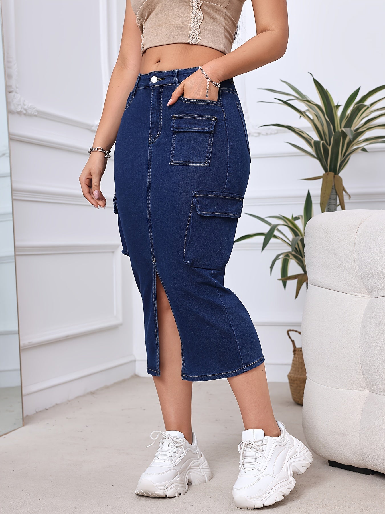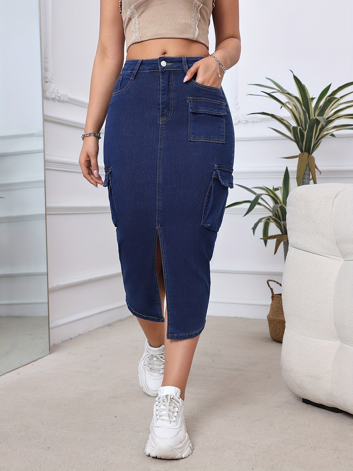 High-Waisted Midi Denim Skirt for Women - Slim Fit with Cargo Pockets