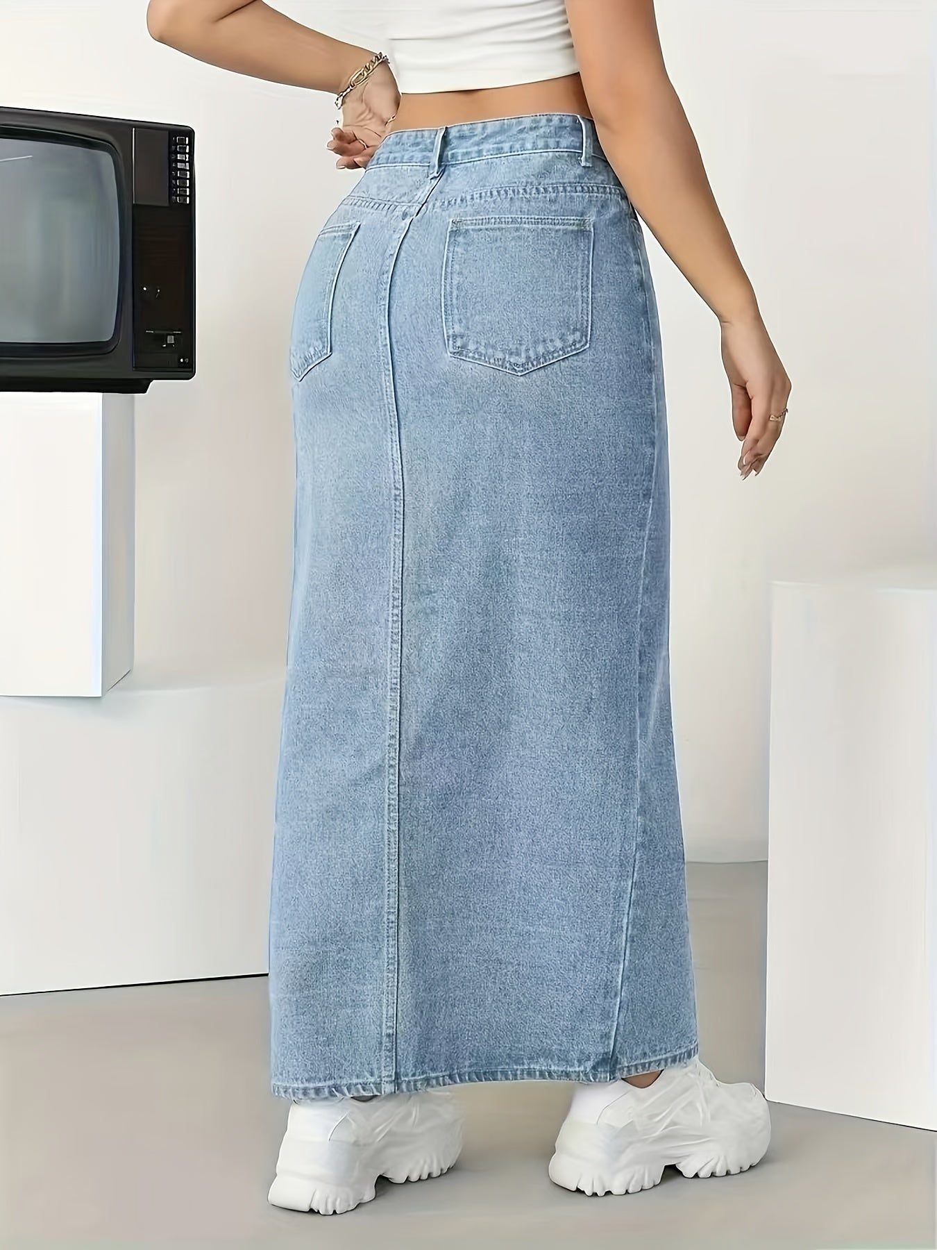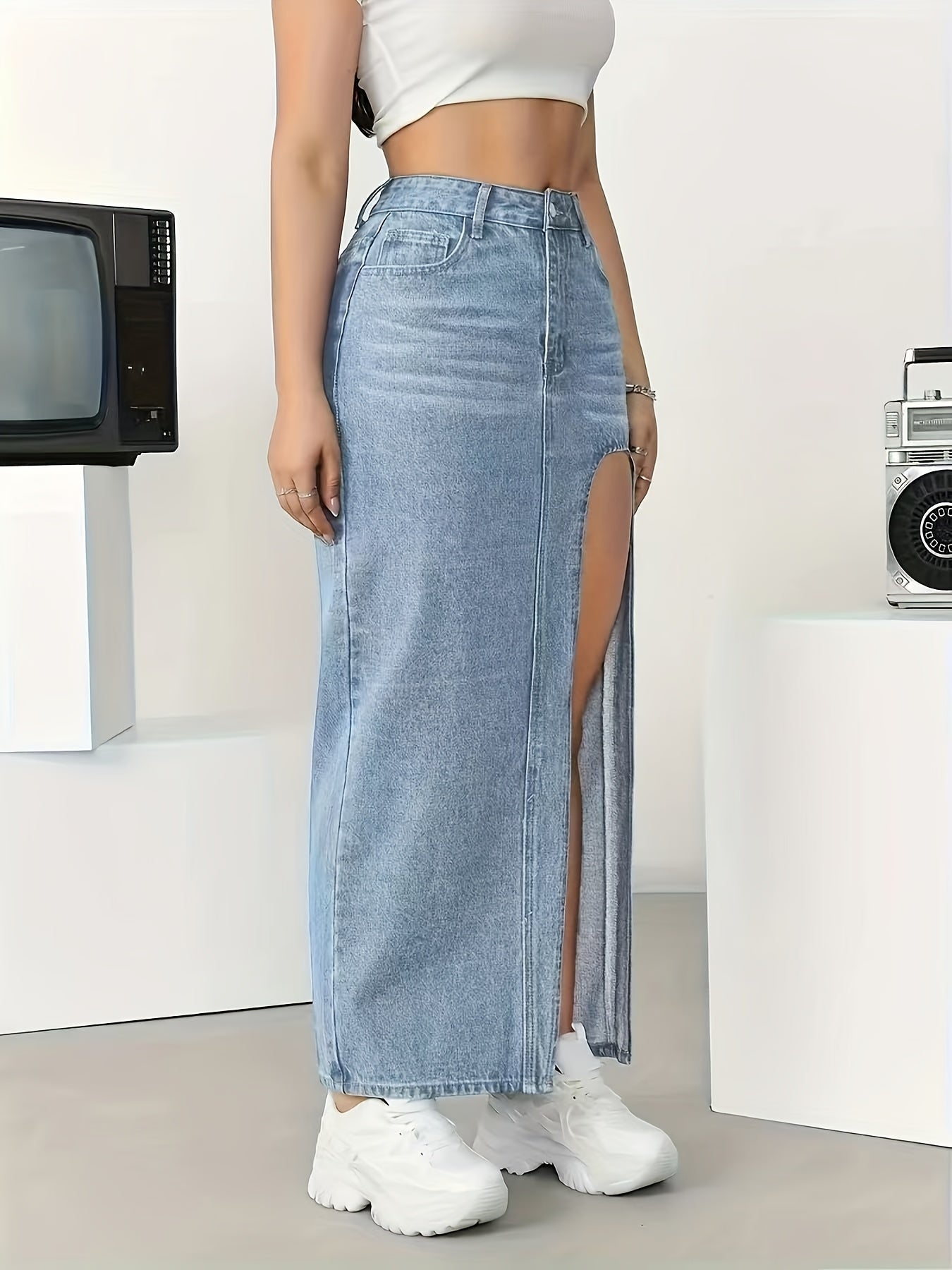 Elegant High-Slit Denim Skirt - Women's Stylish Mid-Length Jean