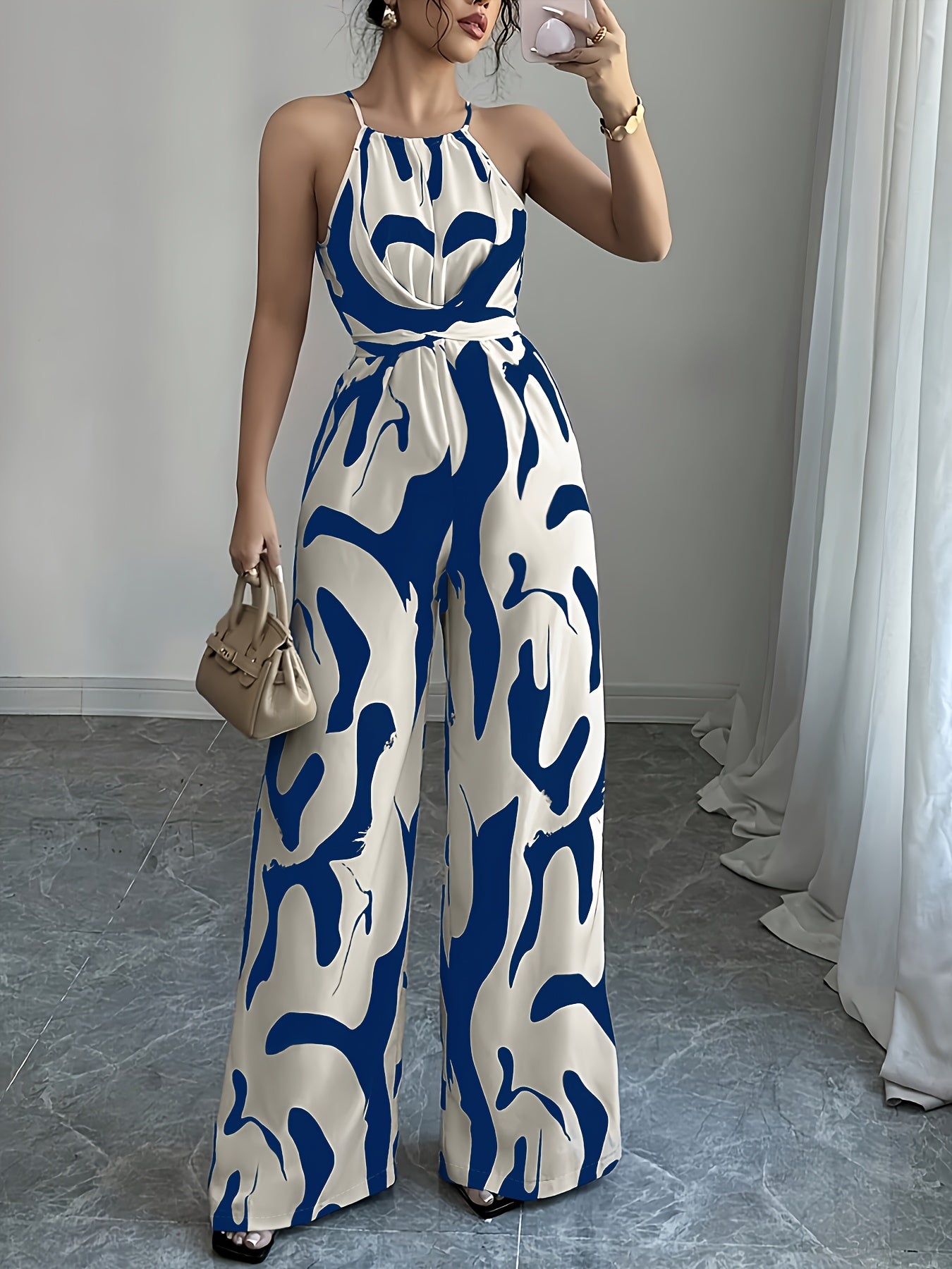 Discover the Women's Elegant Halter Neck Jumpsuit in a stunning geometric blue and white print, perfect for every season. Made from 95% polyester, this long-length jumpsuit features a chic design that combines style and comfort, making it an essential addition to your wardrobe.