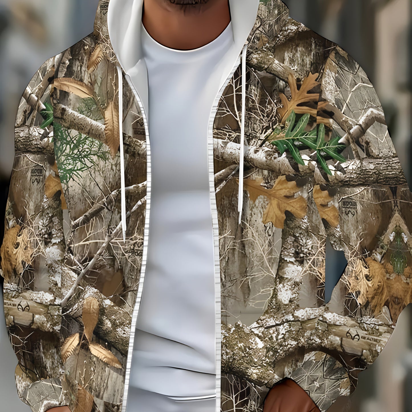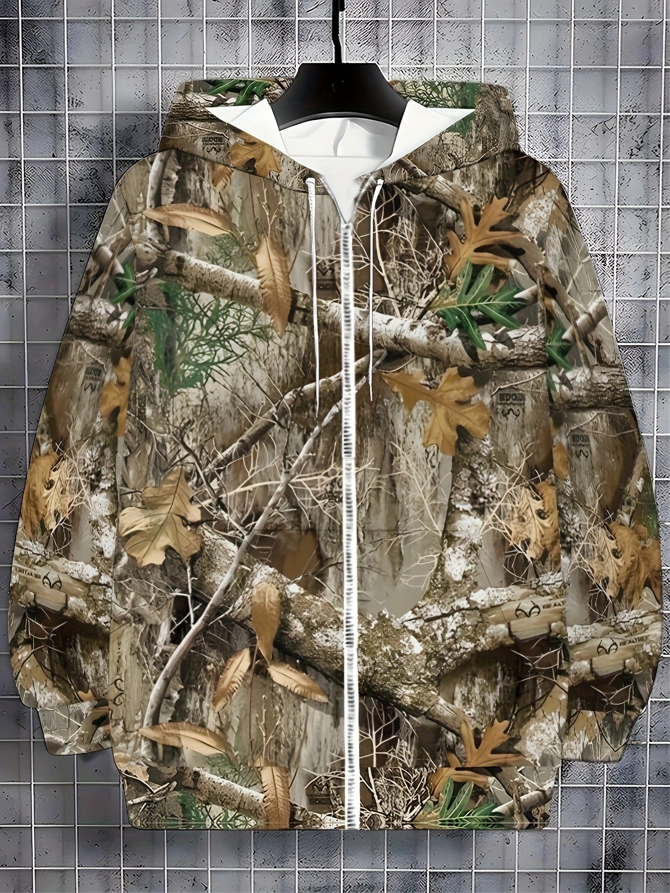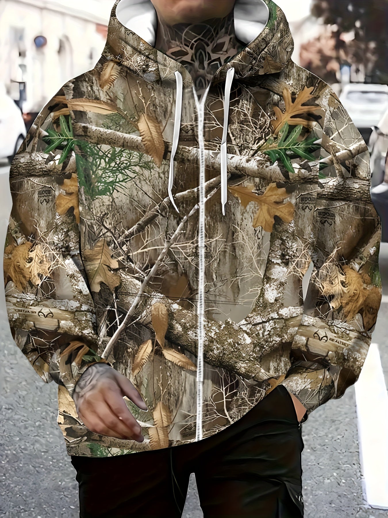 Men's Full-Zip Camouflage Tree Print Hooded Sweatshirt Jacket - Adjustable Drawstring Hood, Front Pockets, Machine Washable Spring/Fall Casual Outdoor Coat, Outdoor Casual Wear | Tree Print Design | Durable Fabric Jacket, Camouflage Hoodie