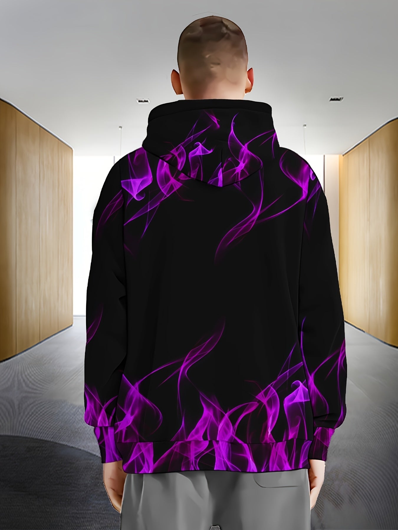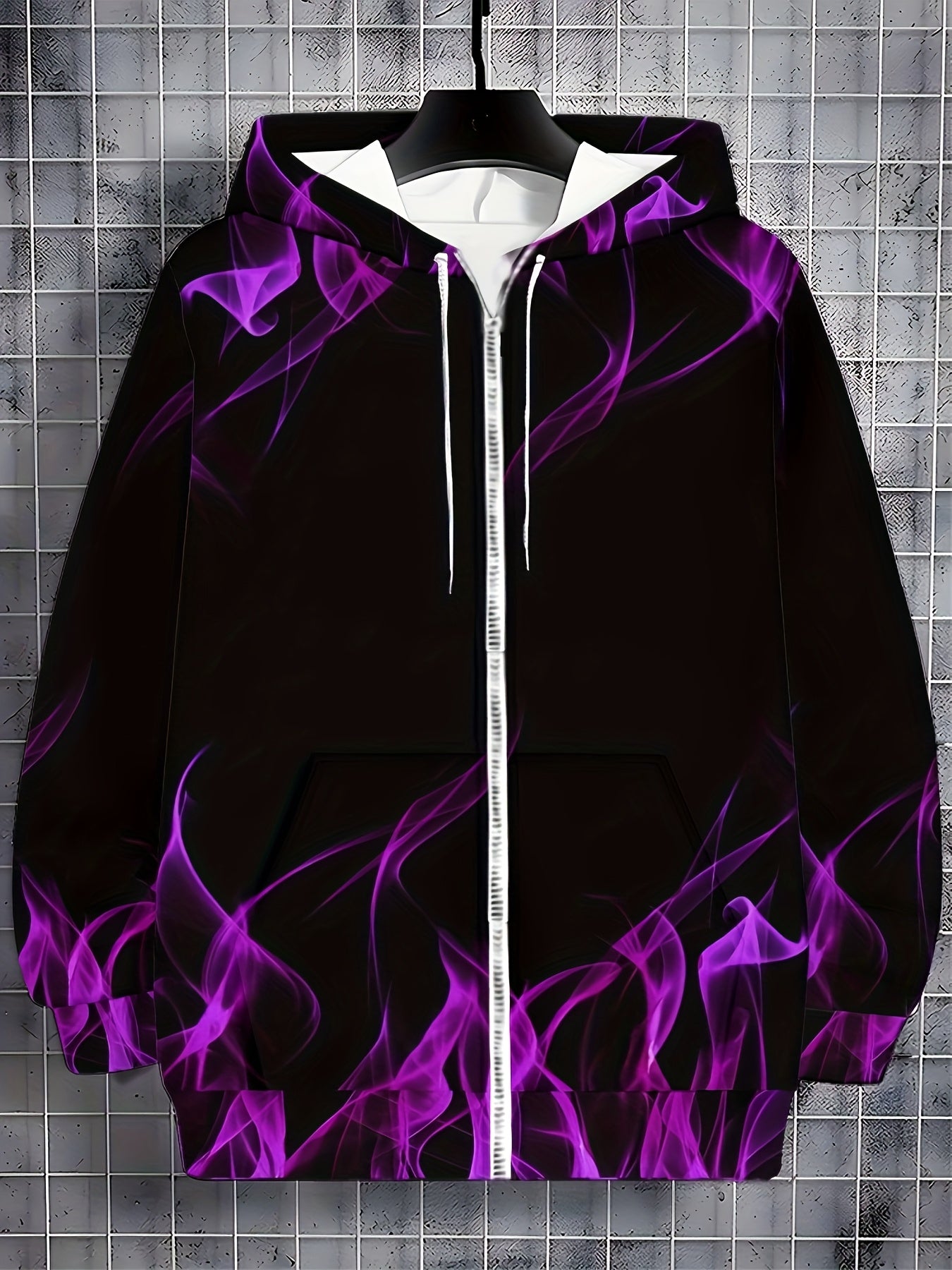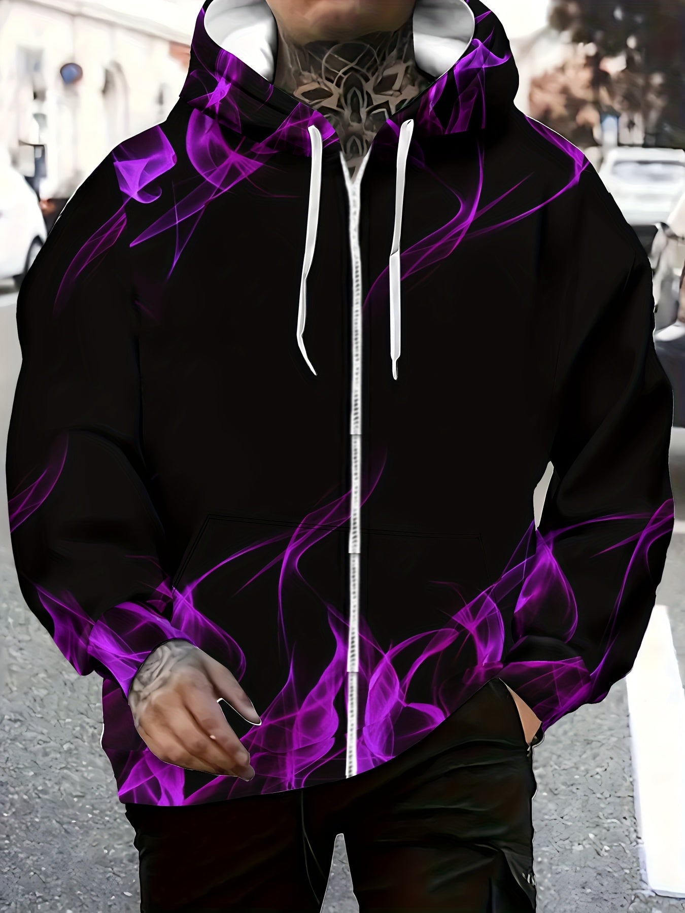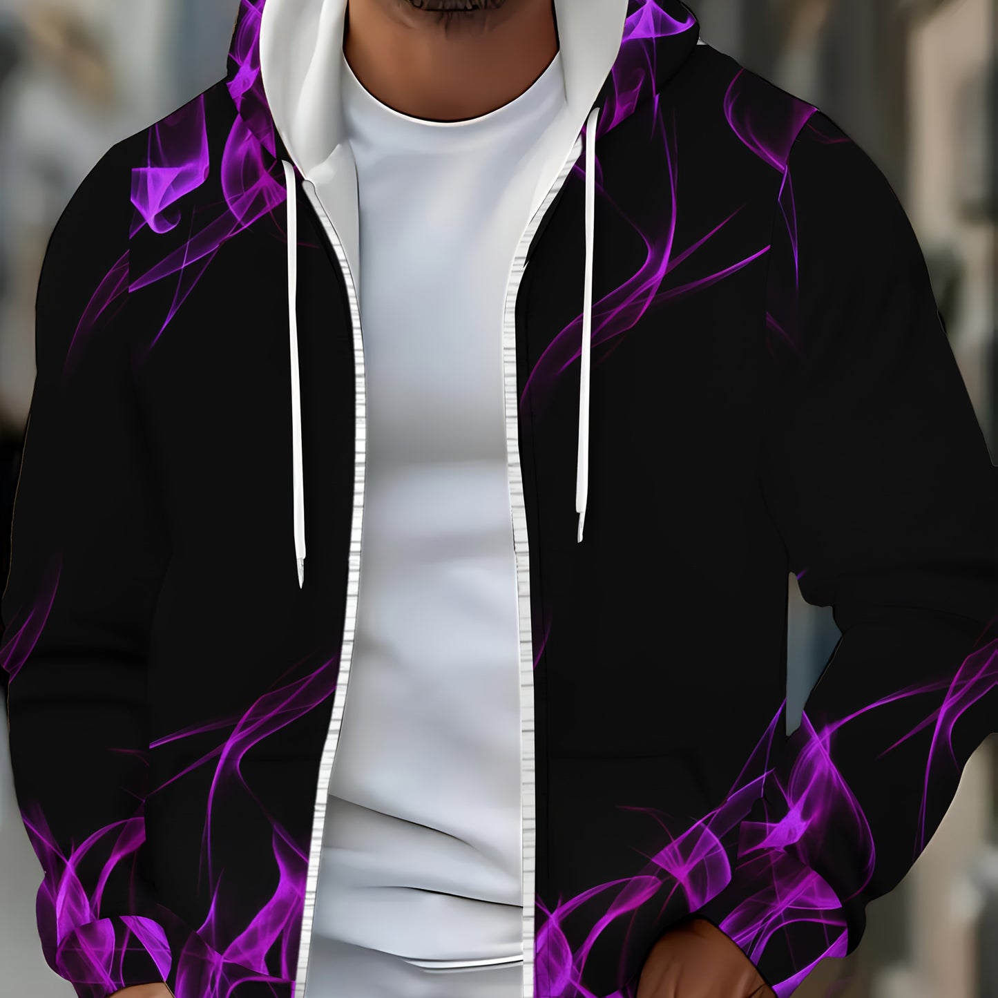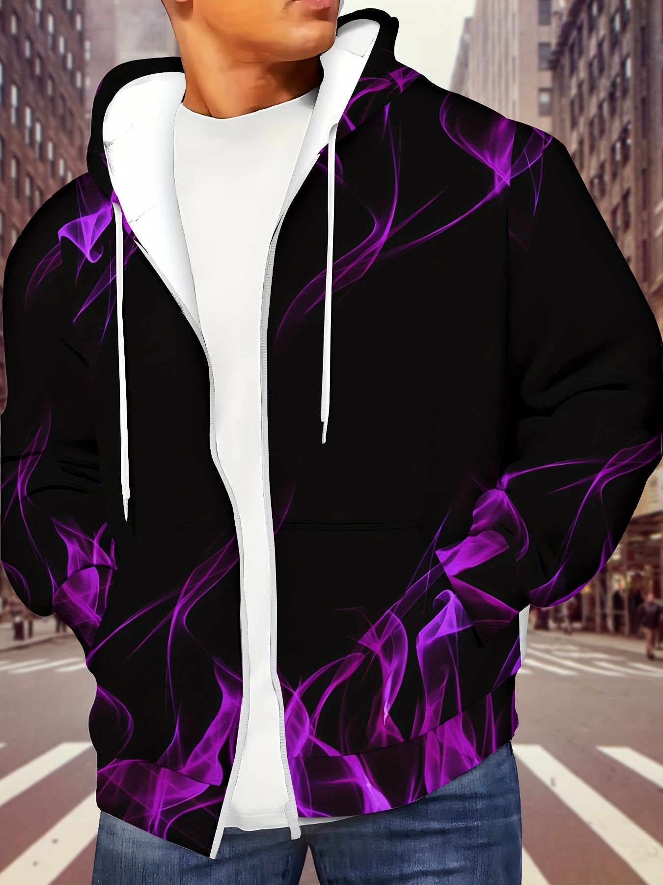 Men's Purple Smoke Print Full-Zip Hooded Sweatshirt - Casual Outdoor Jacket with Adjustable Drawstring & Pockets, Machine Washable Spring/Fall Streetwear, Casual Outdoor Wear | Trendy Hooded Sweatshirt | Digital Print Design