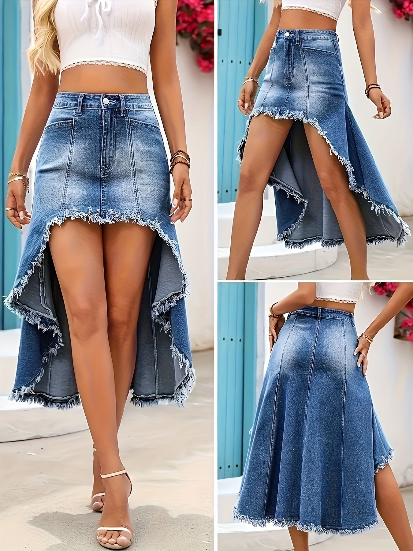 Elegant Mid-Waist Denim Skirt for Women - Asymmetrical Fringe Hem
