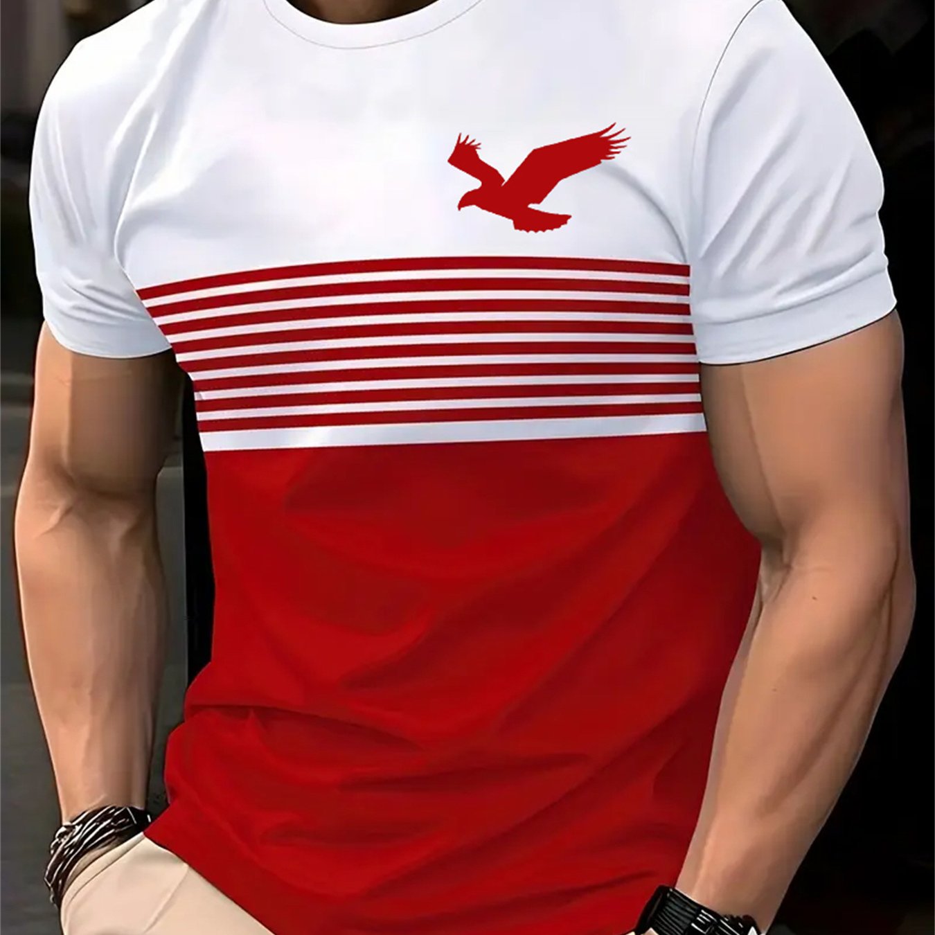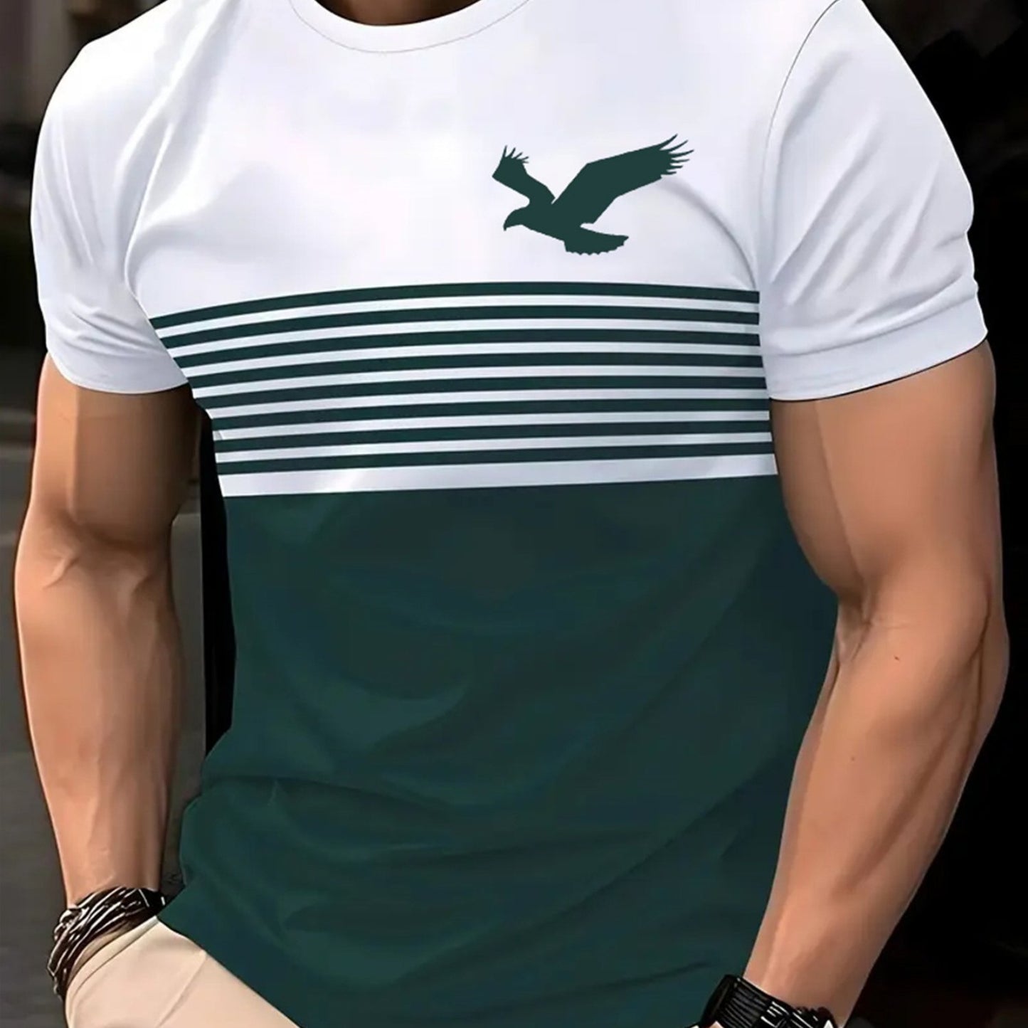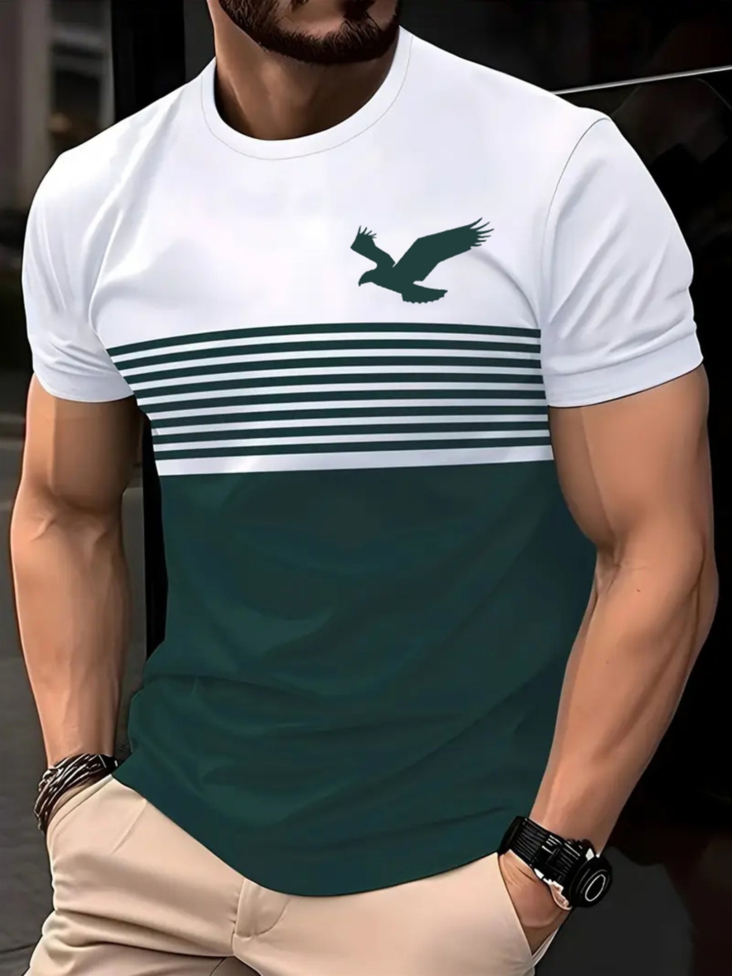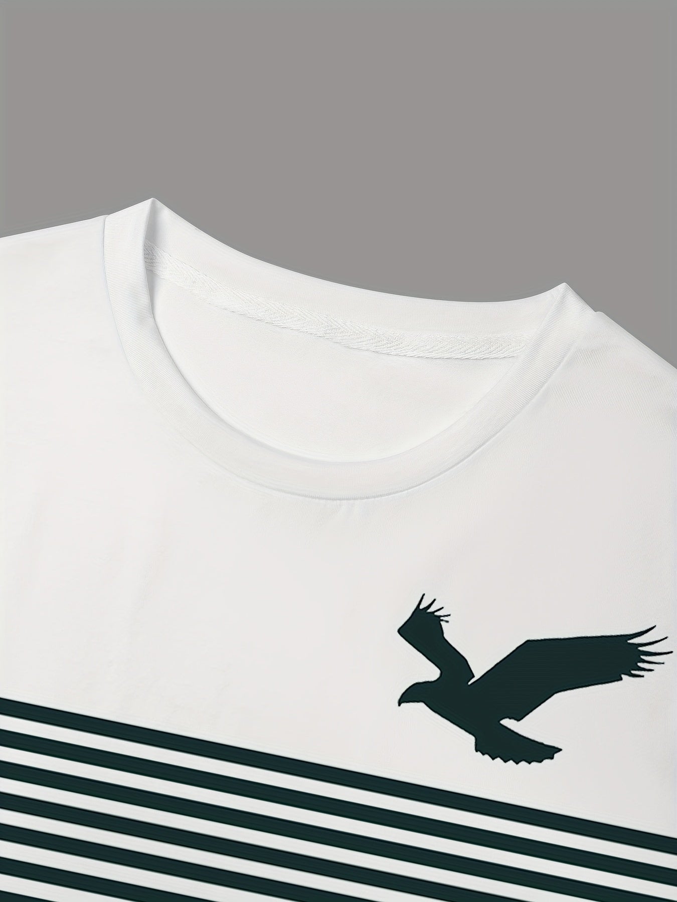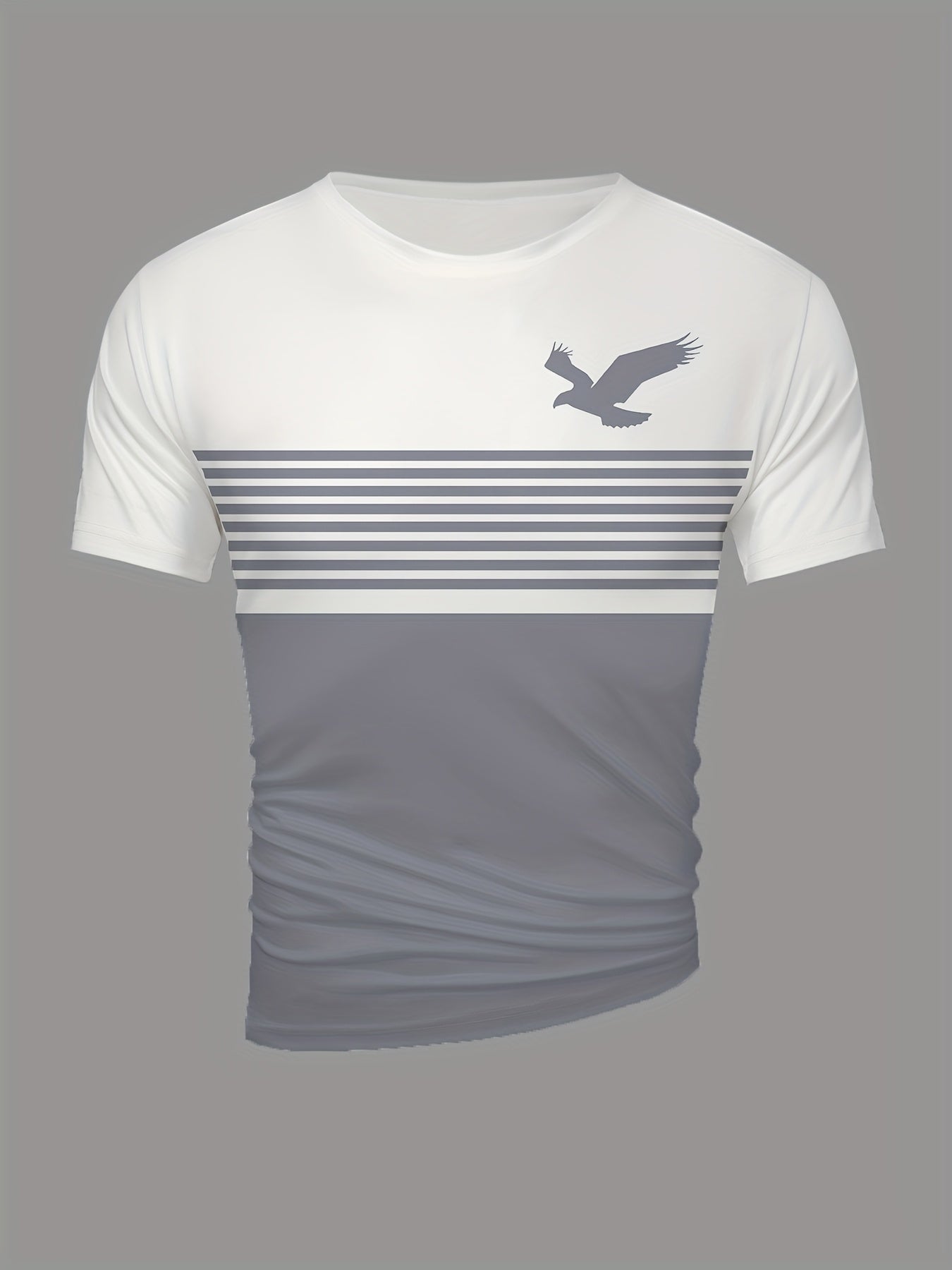 Introducing our Men's Vintage Crew Neck Short Sleeve Polyester T-Shirt, designed for comfort and style. This unique tee features a stunning 3D eagle pattern, an asymmetrical design, and a regular fit, perfect for casual summer outings or sports activities.