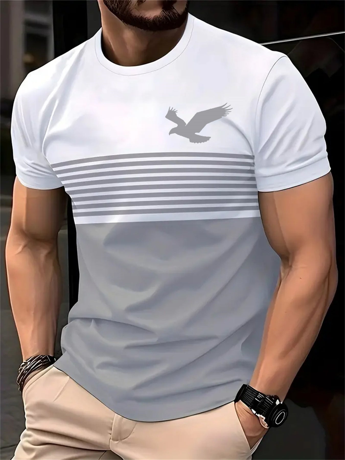 Men's Vintage Crew Neck T-Shirt - 3D Eagle Pattern, Regular Fit
