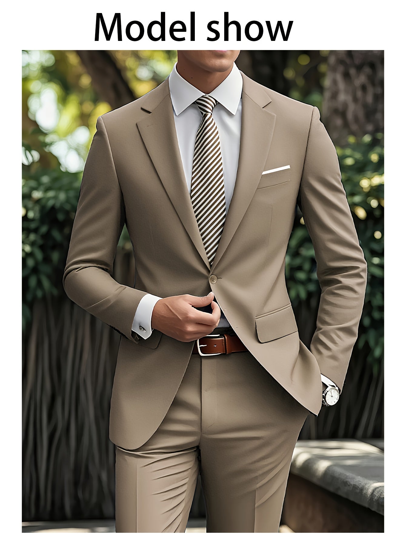 Elevate your style with the Men's Casual Business Two-Piece Suit Set. This sophisticated beige blazer and dress pants ensemble combines comfort with elegance, making it perfect for any occasion. Featuring a classic lapel collar and pockets, this suit is tailored for a regular fit and is designed for all-season wear.