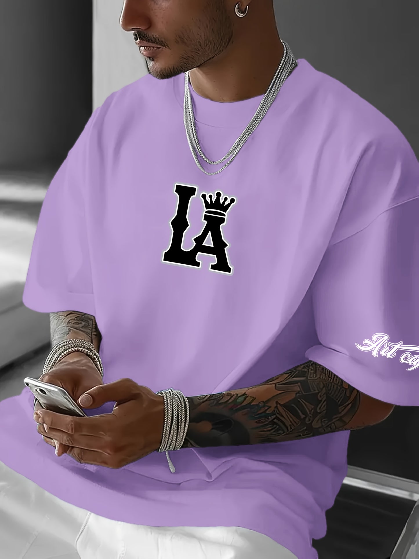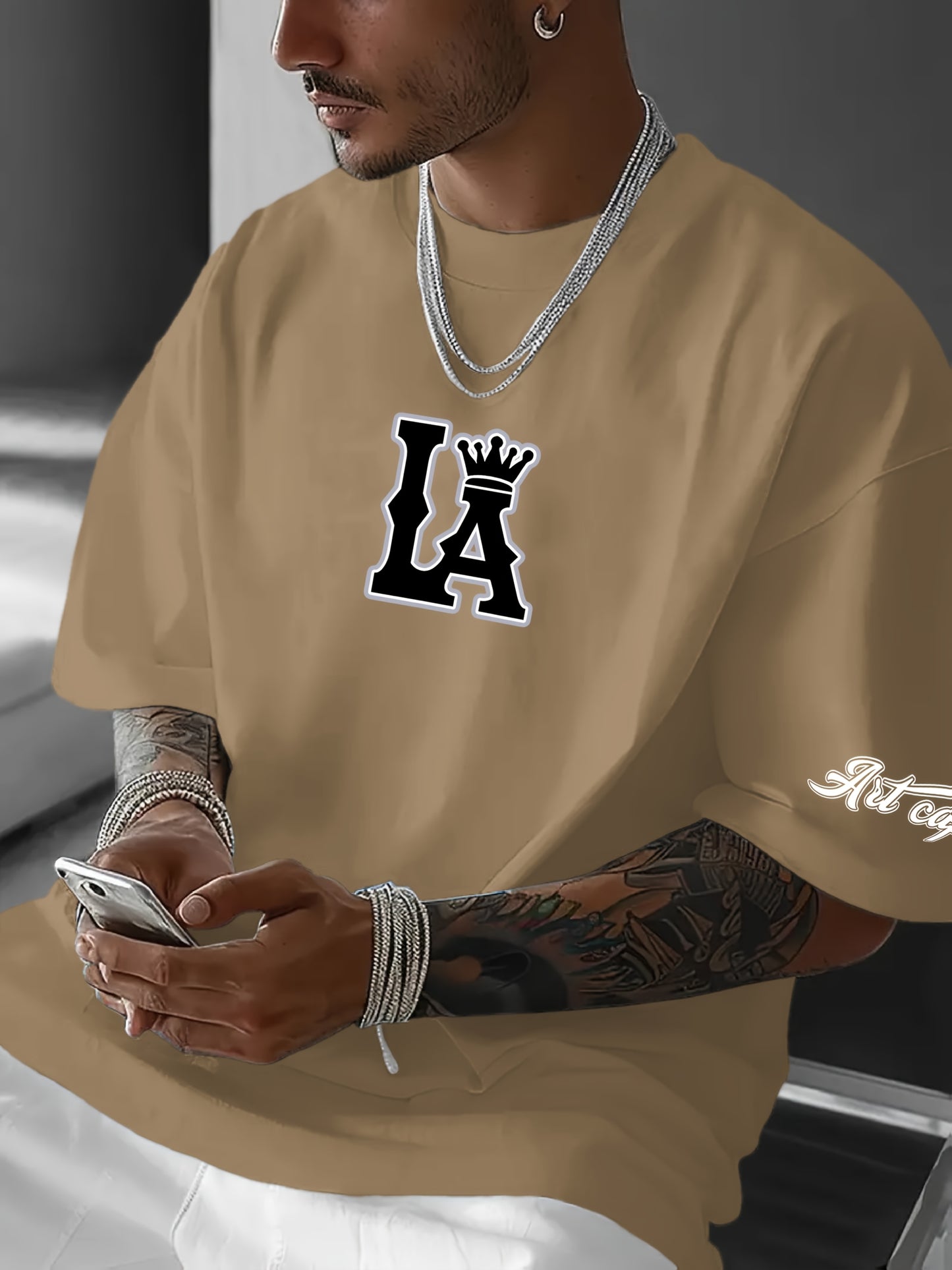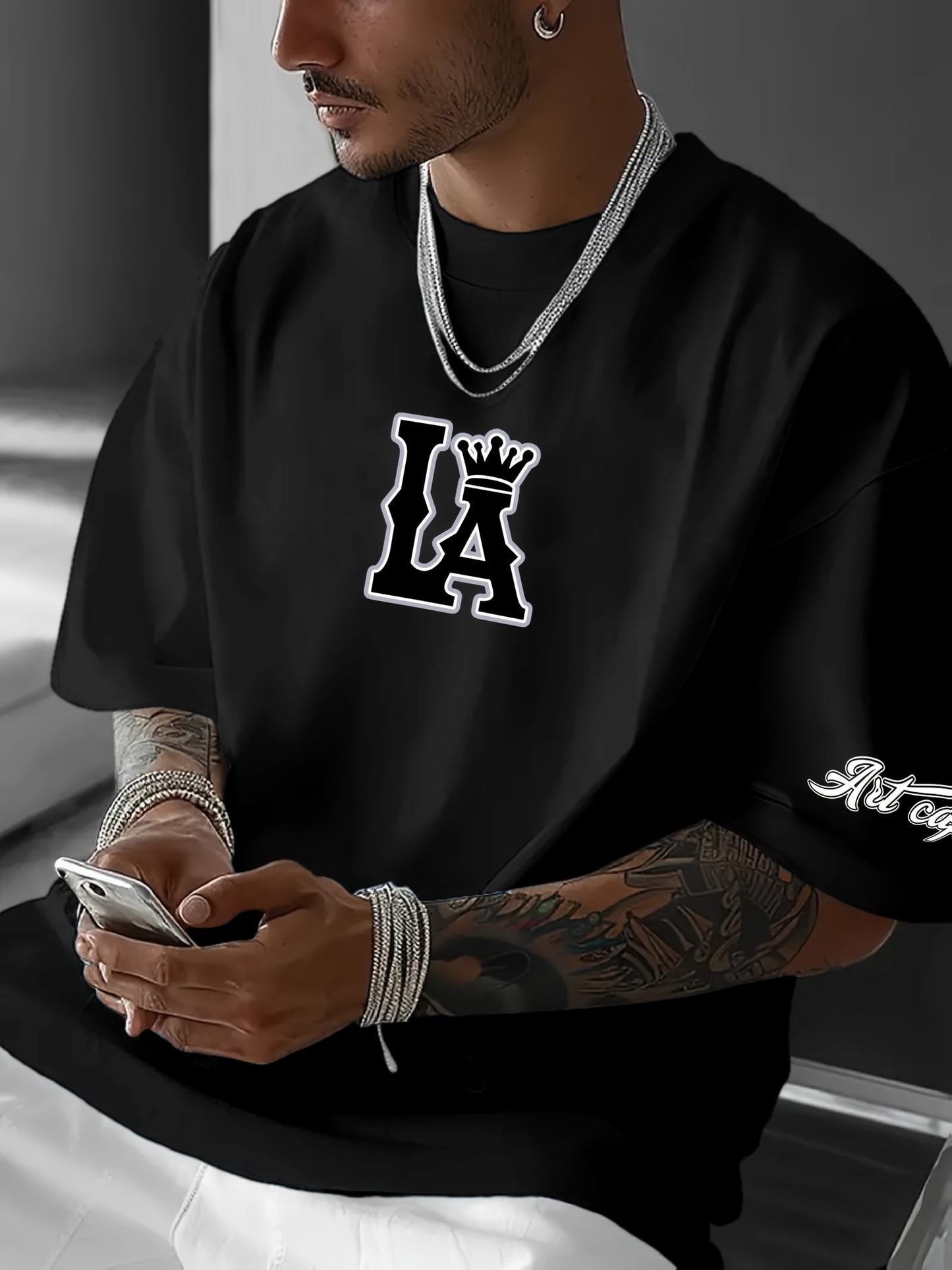 Discover the ultimate comfort and style with our Men's Casual LA Graphic T-Shirt. Crafted from breathable stretch fabric, this oversized fit tee features a trendy crown and script lettering design, making it perfect for outdoor activities or casual wear during the summer months.