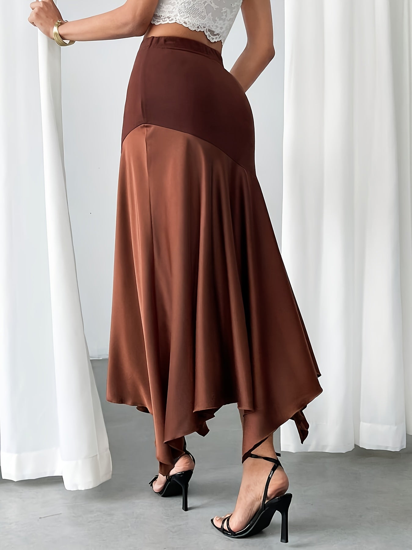 Step into elegance with our Women's Elegant Color Block Satin Mermaid Skirt, featuring a high-waisted design that gracefully flows for a flattering silhouette. Ideal for both casual and formal occasions, this skirt combines sophistication with comfort in a beautiful brown and beige palette.