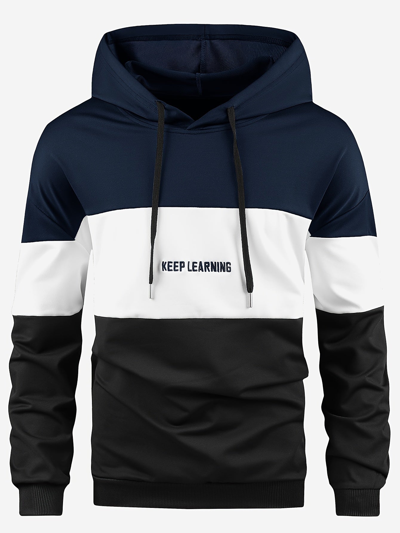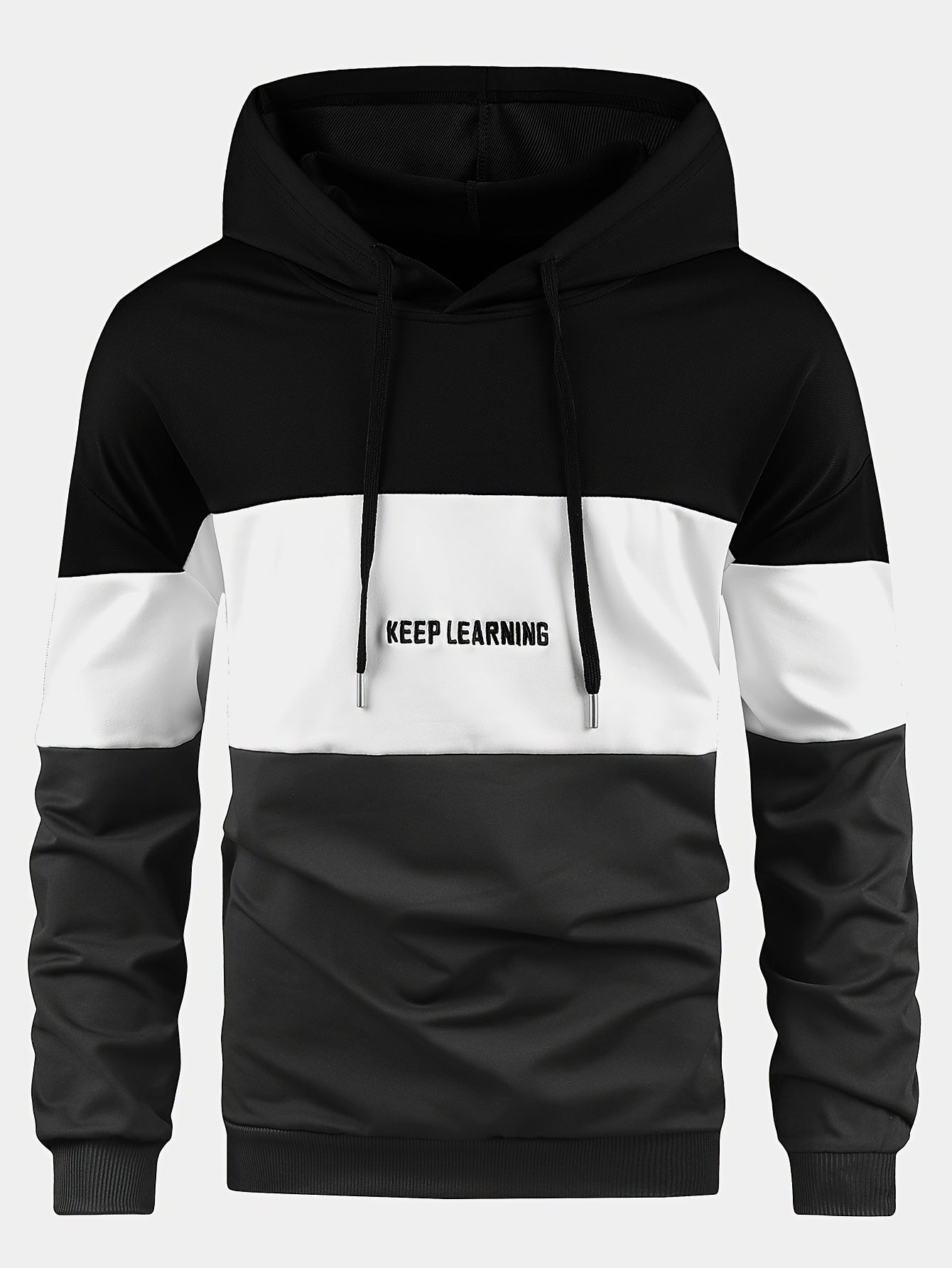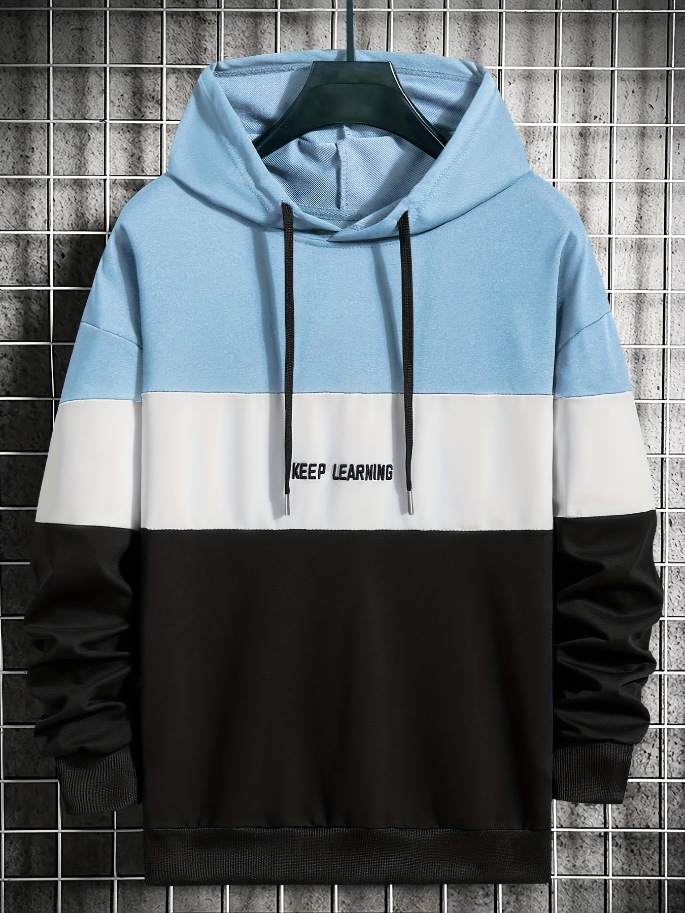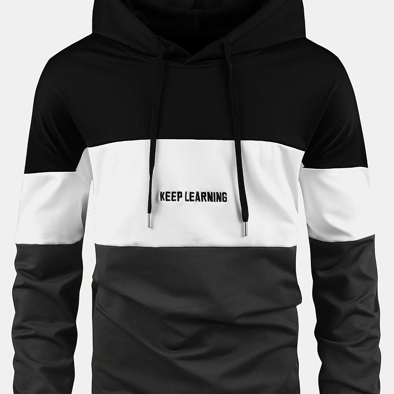 ‘Keep Learning’ Print Patchwork Hoodie, Hoodies For Men, Men’s Casual Pullover Hooded Thin Sweatshirt With Kangaroo Pocket For Spring Fall, As Gifts
