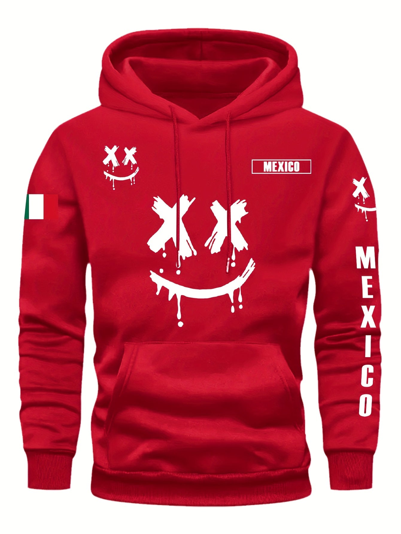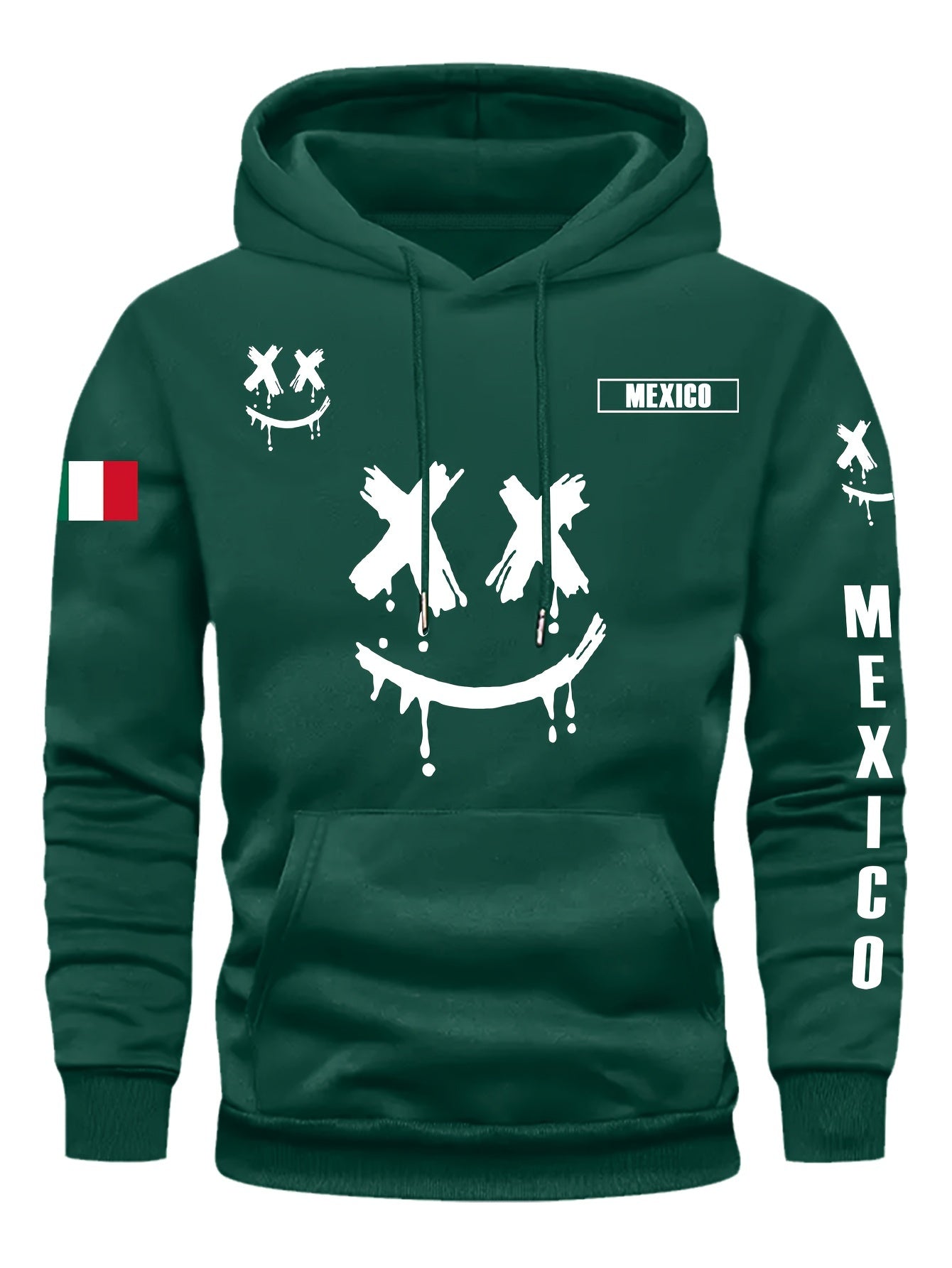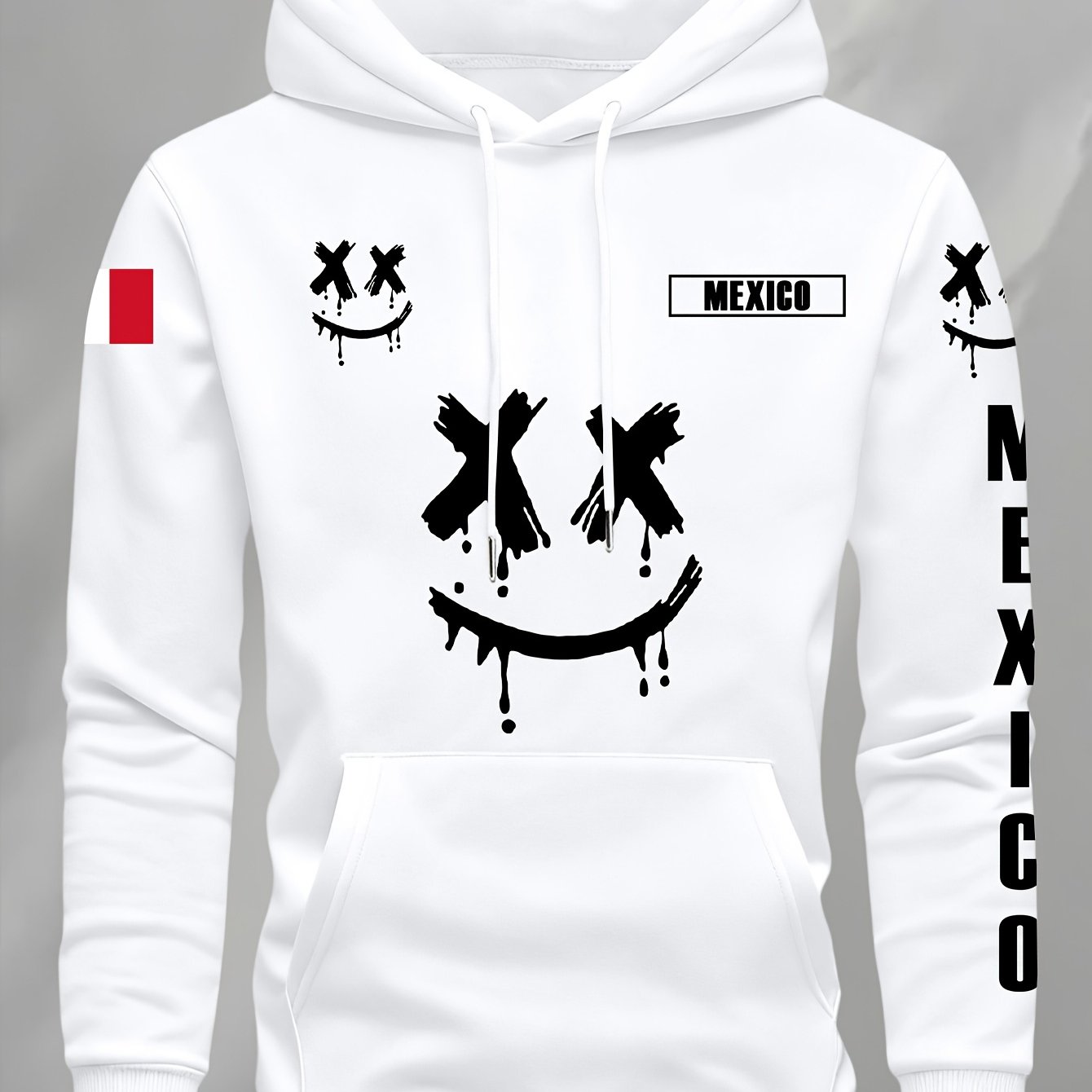 Men's Casual Fleece-Lined Hoodie with Mexico Flag & Grinning Face Design - Cozy Polyester Pullover with Kangaroo Pocket, Long Sleeves for Casual Attire