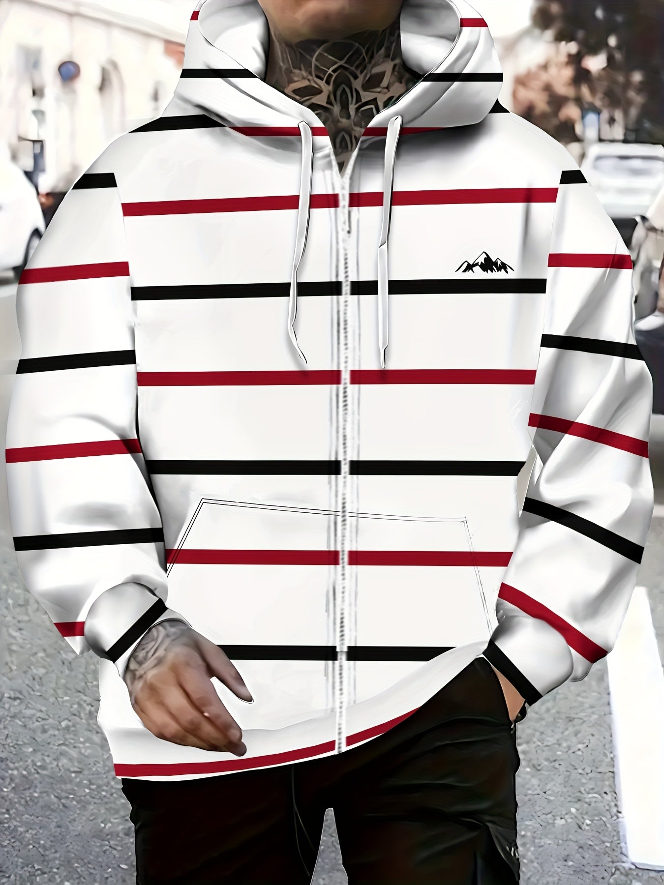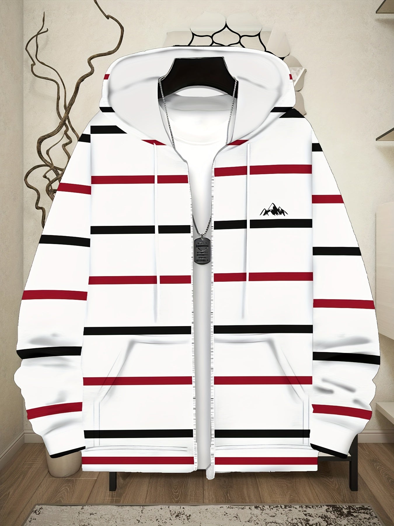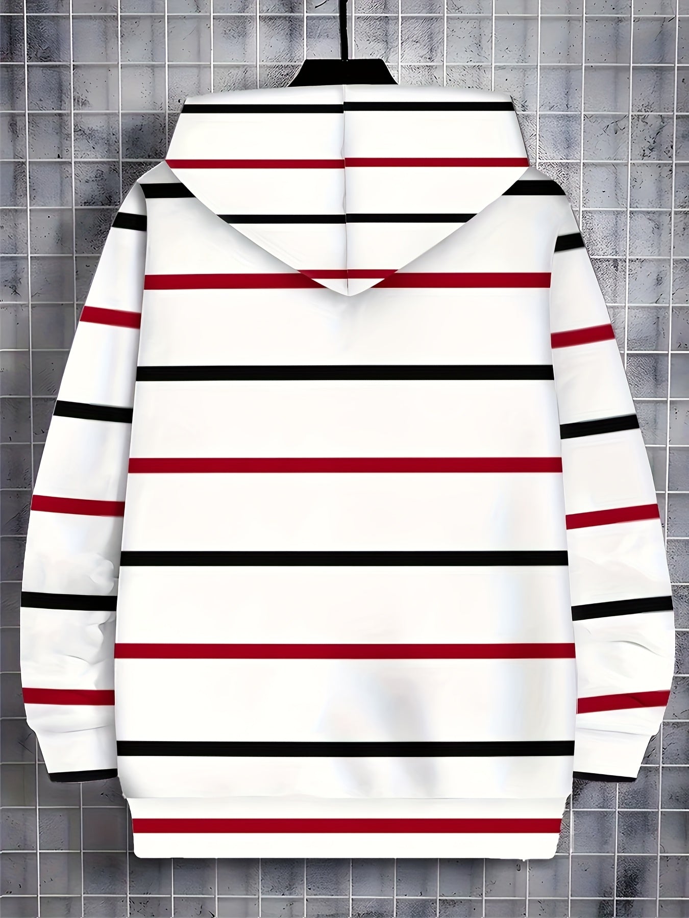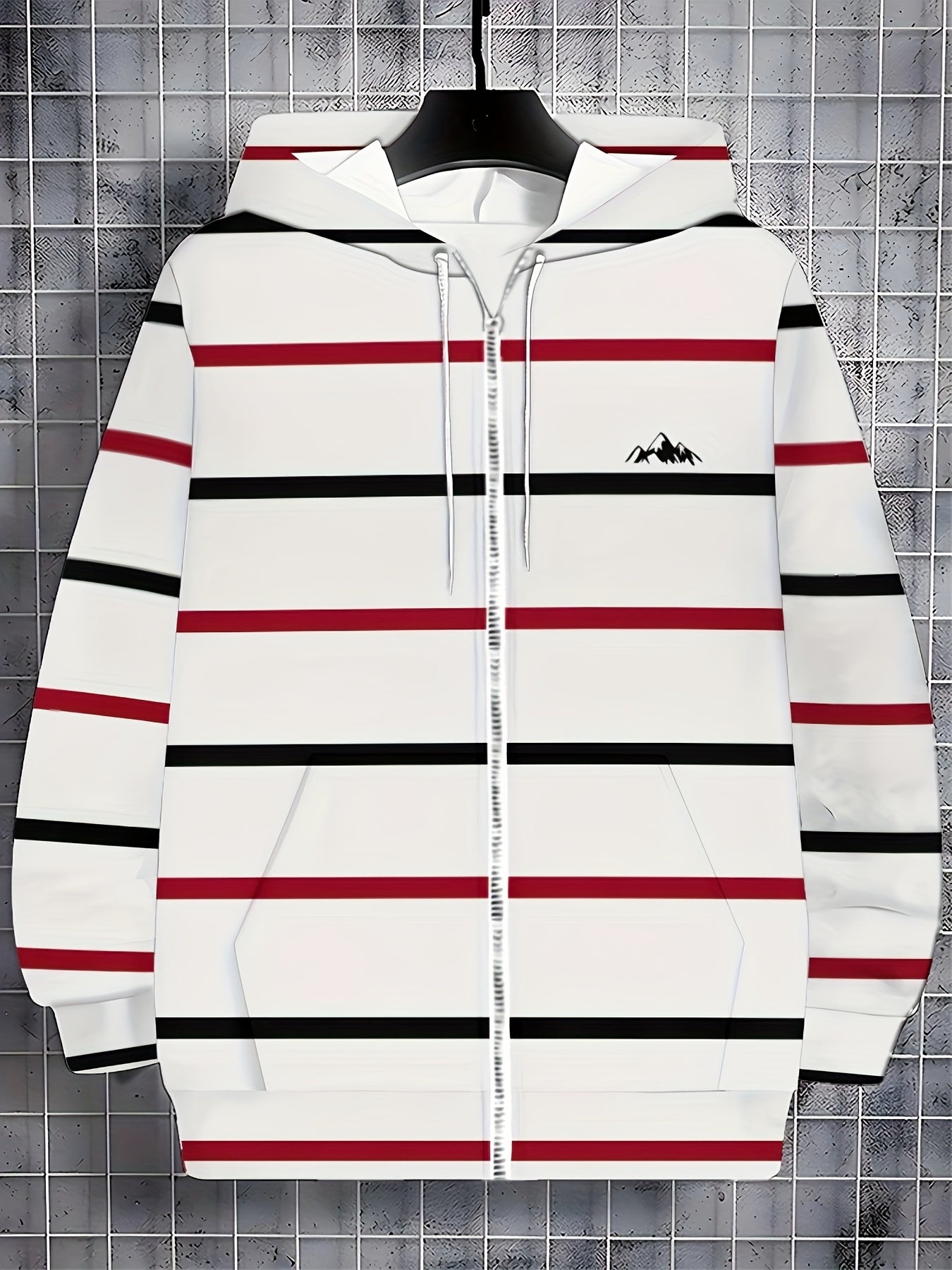 Men's Full-Zip Hooded Jacket - Lightweight Red & White Horizontal Stripe Sweatshirt, Front Zipper Closure, Side Pockets - Casual Outdoor Gym Coat for Fall/Spring - Machine Washable Hoodie, Full Zip Up Hoodie, Sleek Appearance, Drawstring Hood Adjustment,