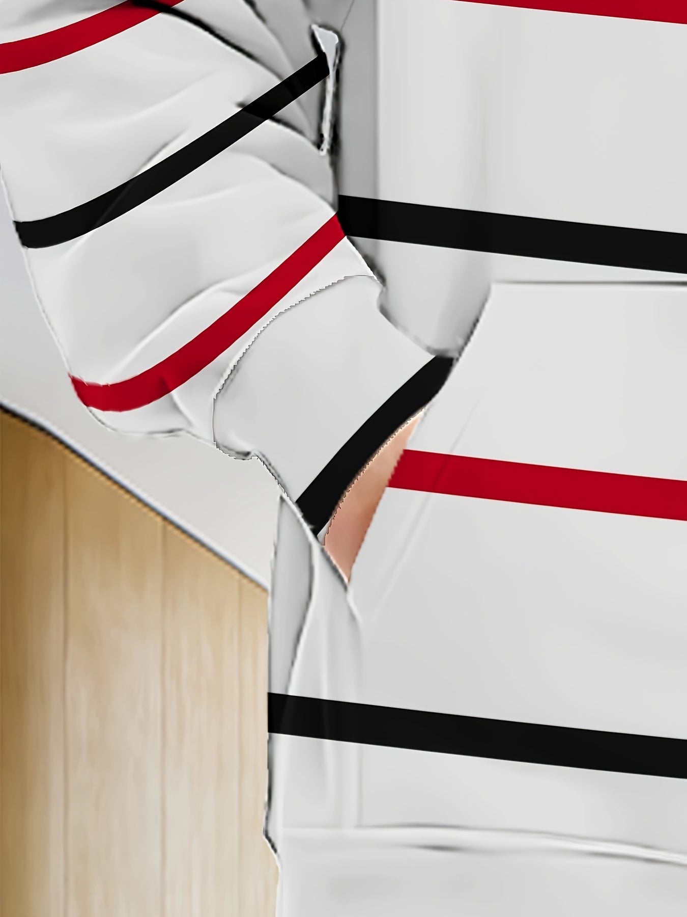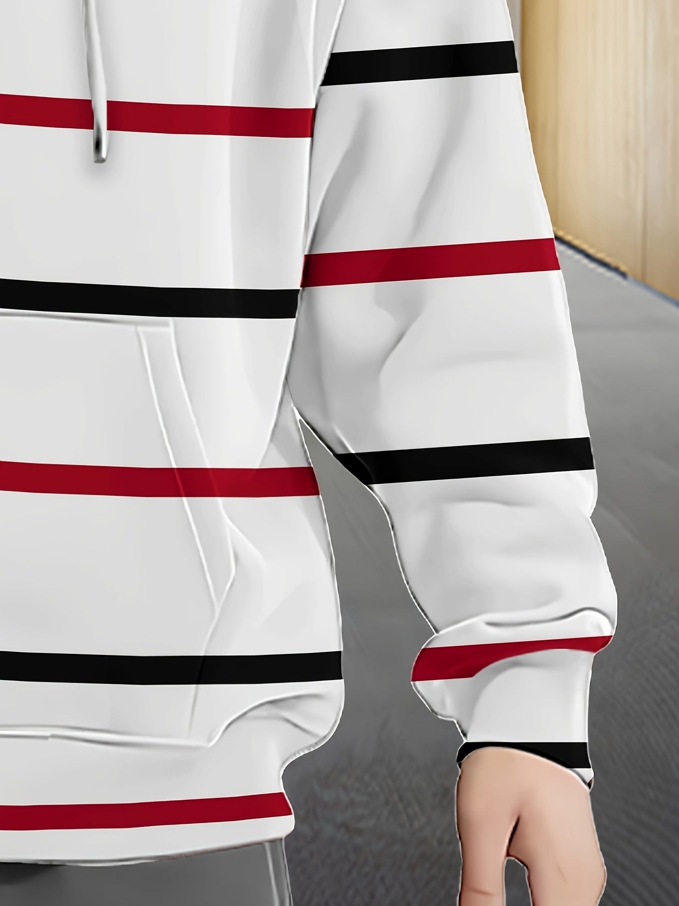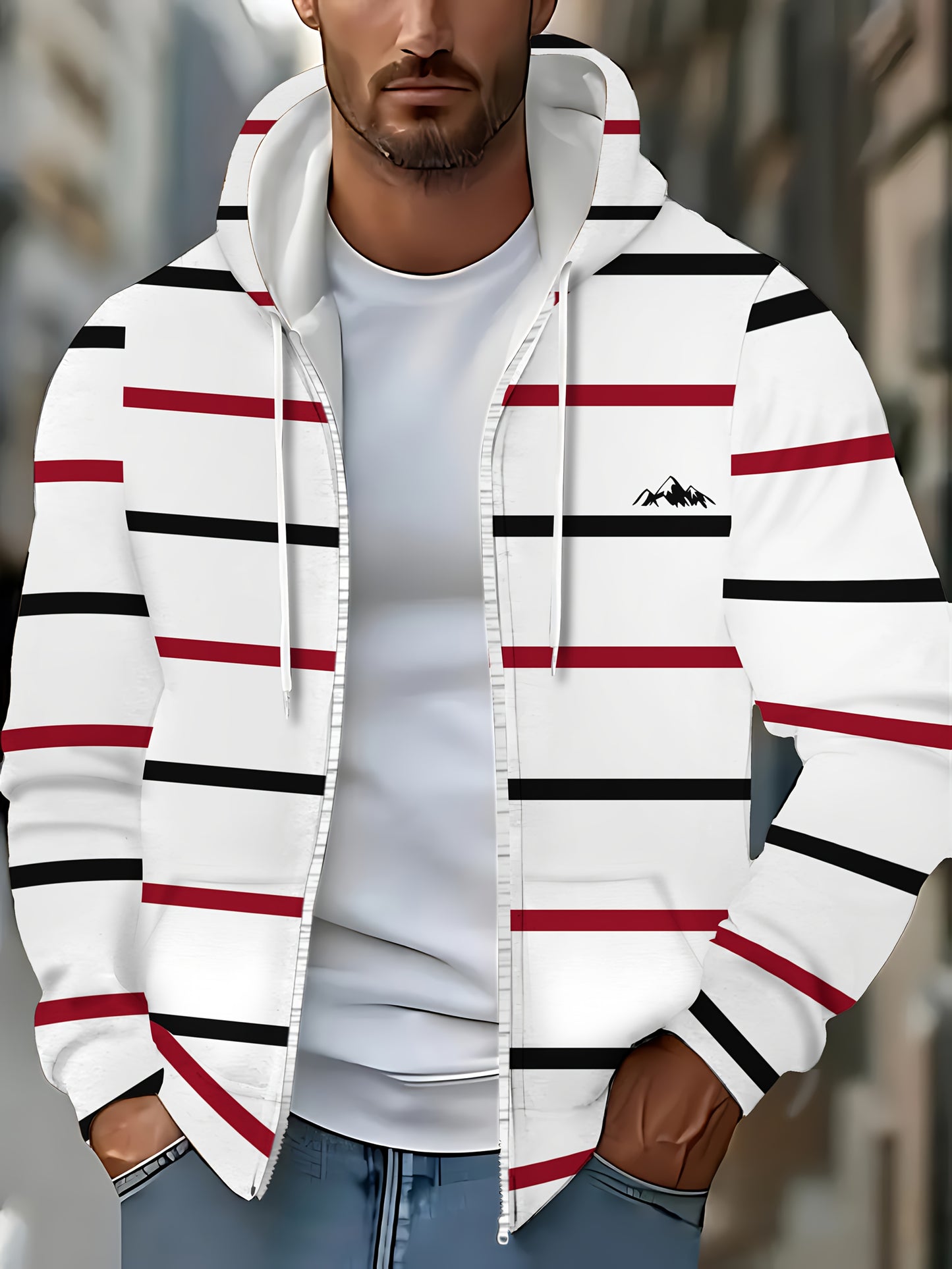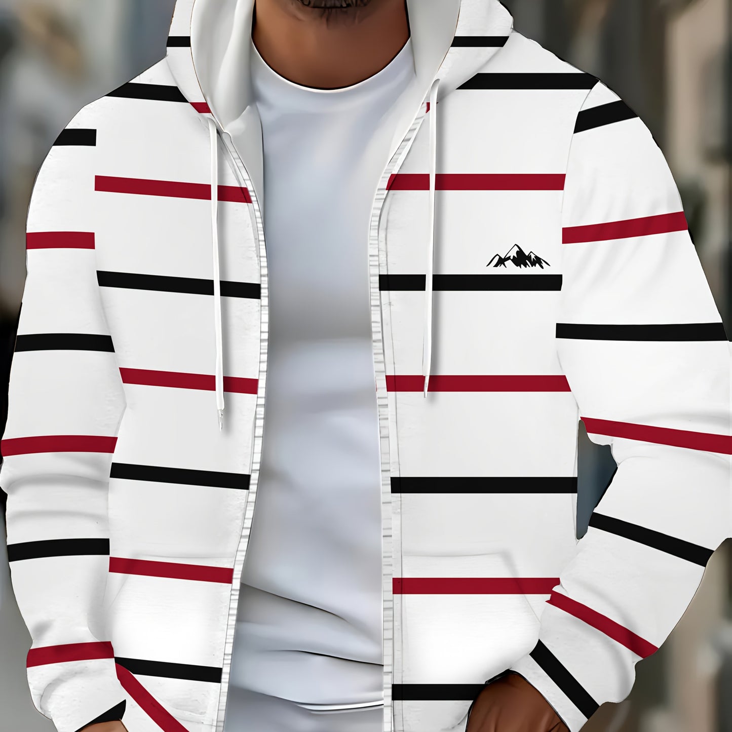 Men's Full-Zip Hooded Jacket - Lightweight Red & White Horizontal Stripe Sweatshirt, Front Zipper Closure, Side Pockets - Casual Outdoor Gym Coat for Fall/Spring - Machine Washable Hoodie, Full Zip Up Hoodie, Sleek Appearance, Drawstring Hood Adjustment,