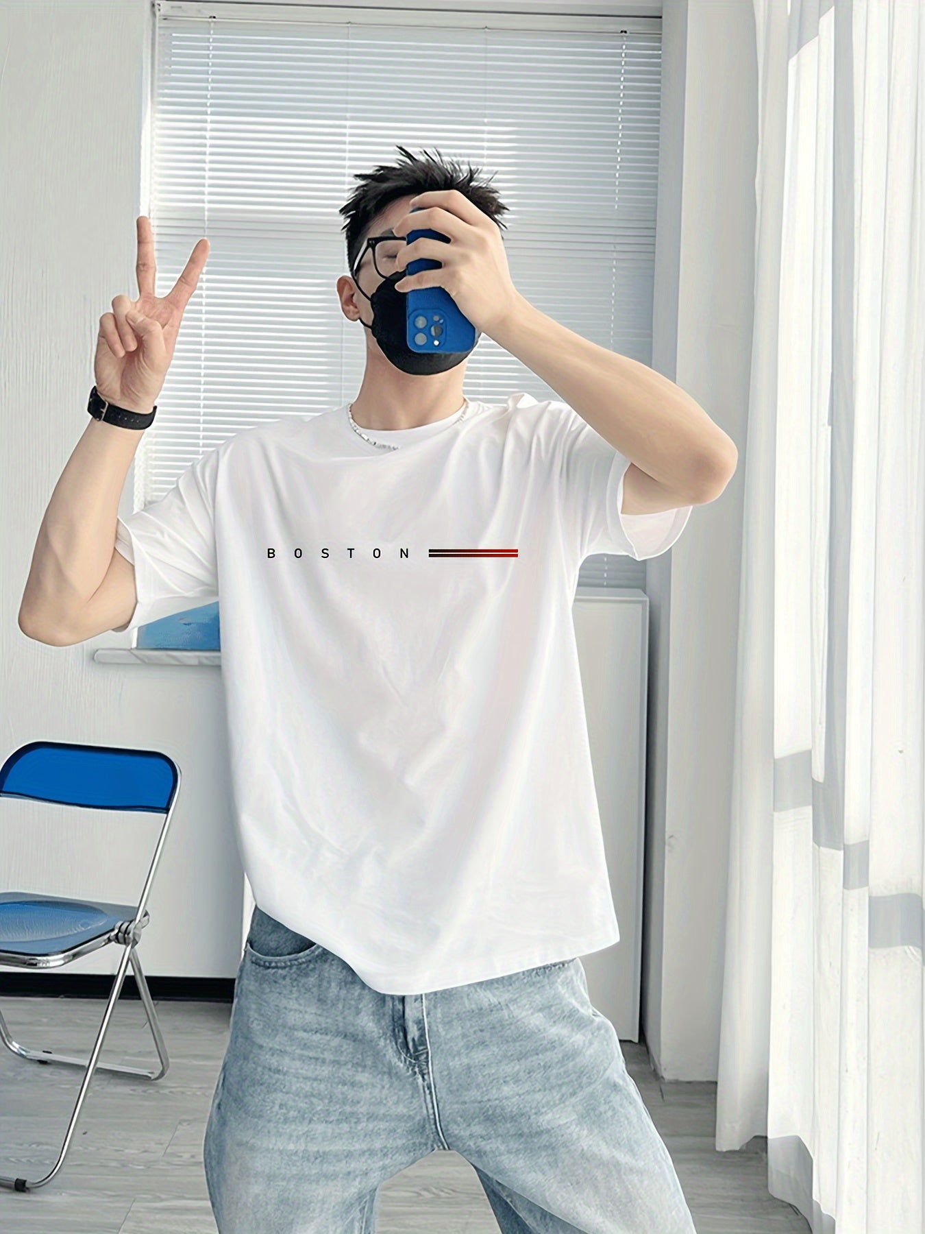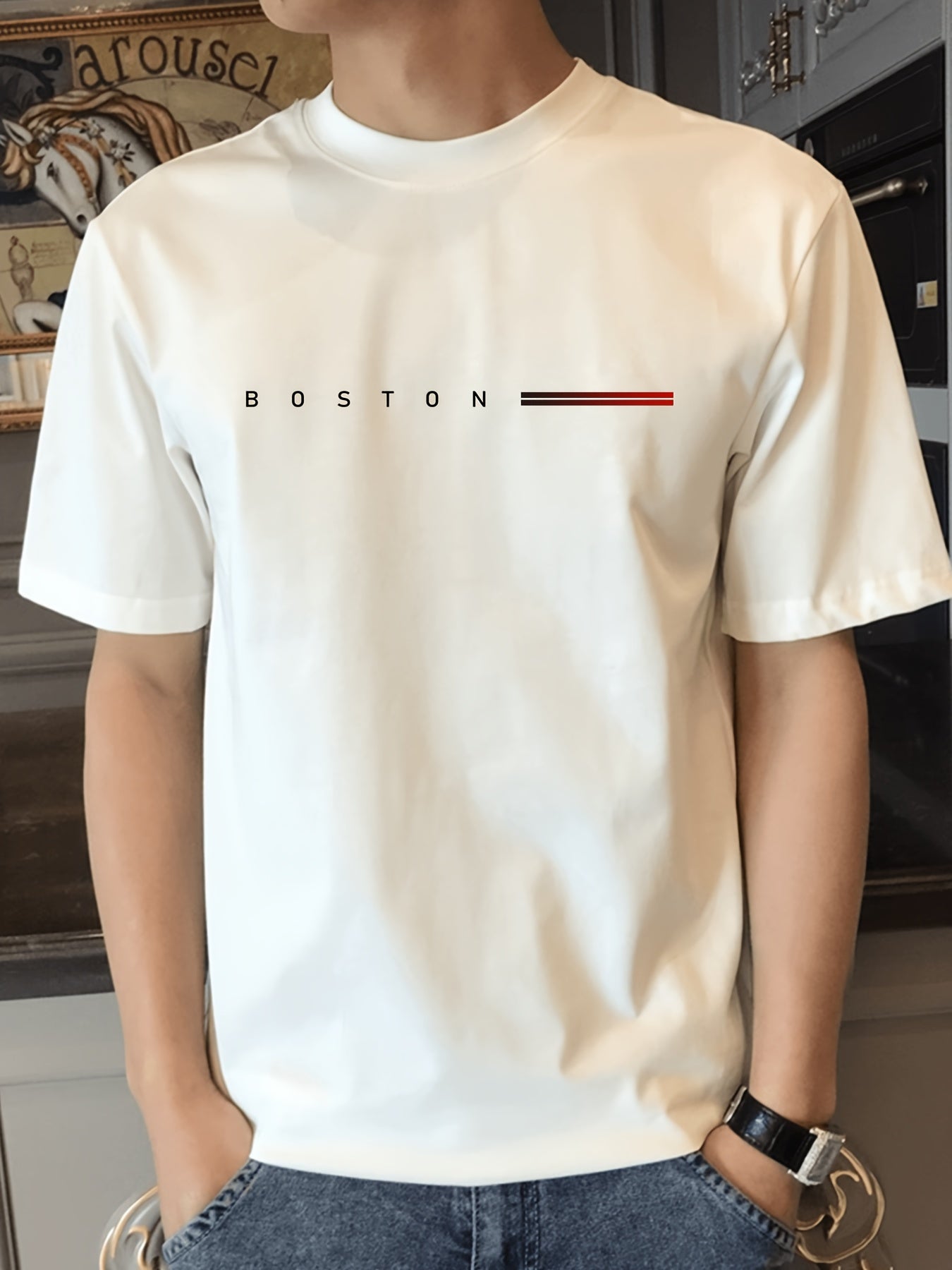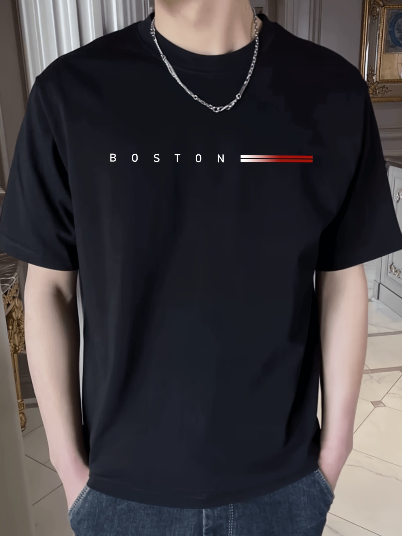 Discover the ultimate blend of comfort and style with our Men's 210g 100% Cotton Casual T-Shirt featuring a striking Boston graphic print. This round neck regular fit tee is not only perfect for casual outings but is also machine washable and dry cleanable, making it a practical addition to any wardrobe.