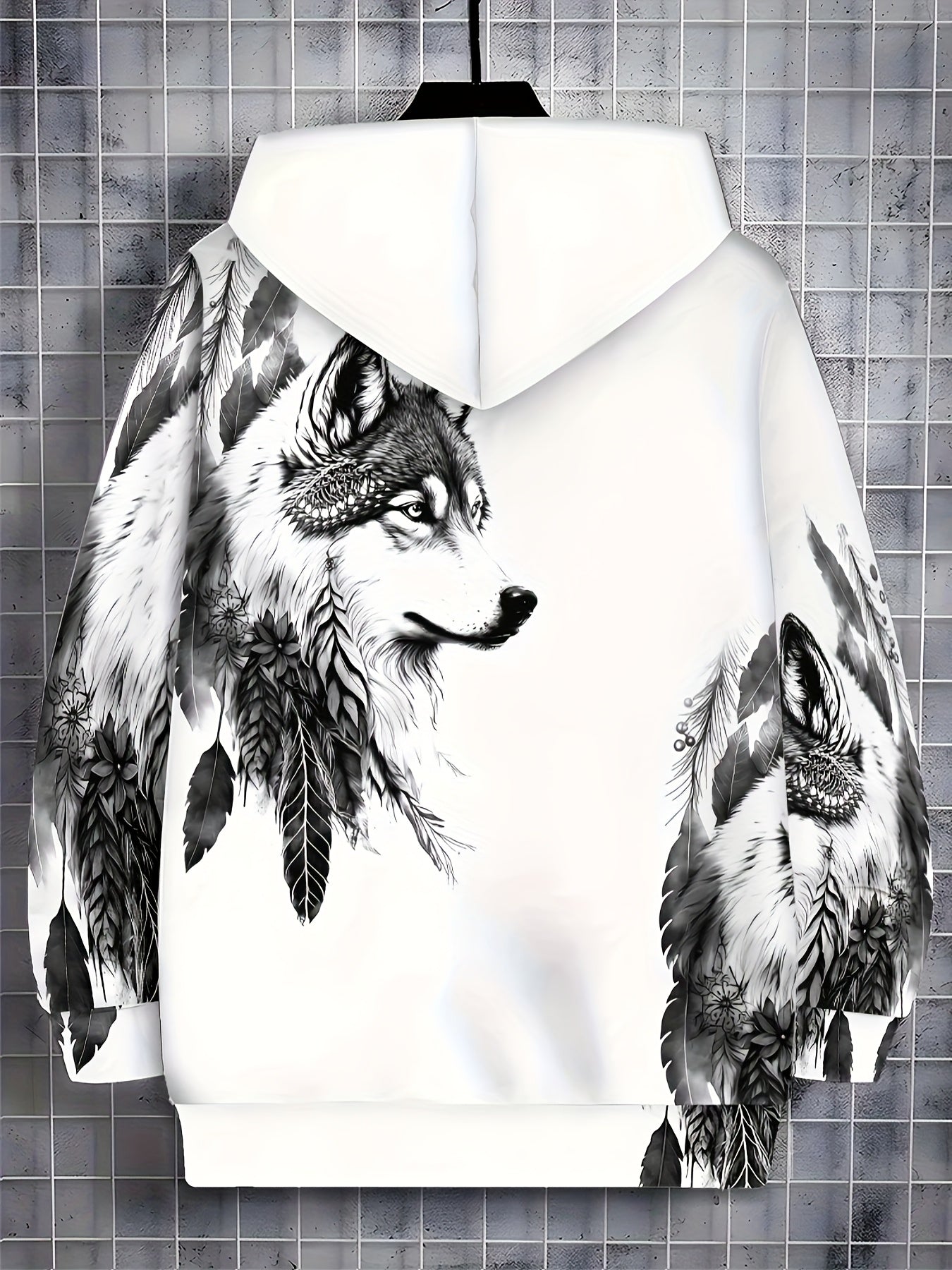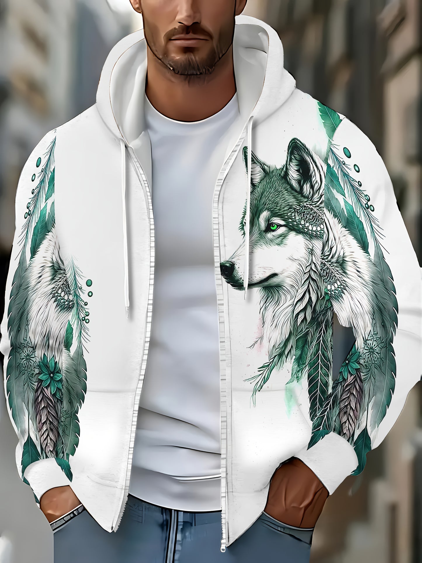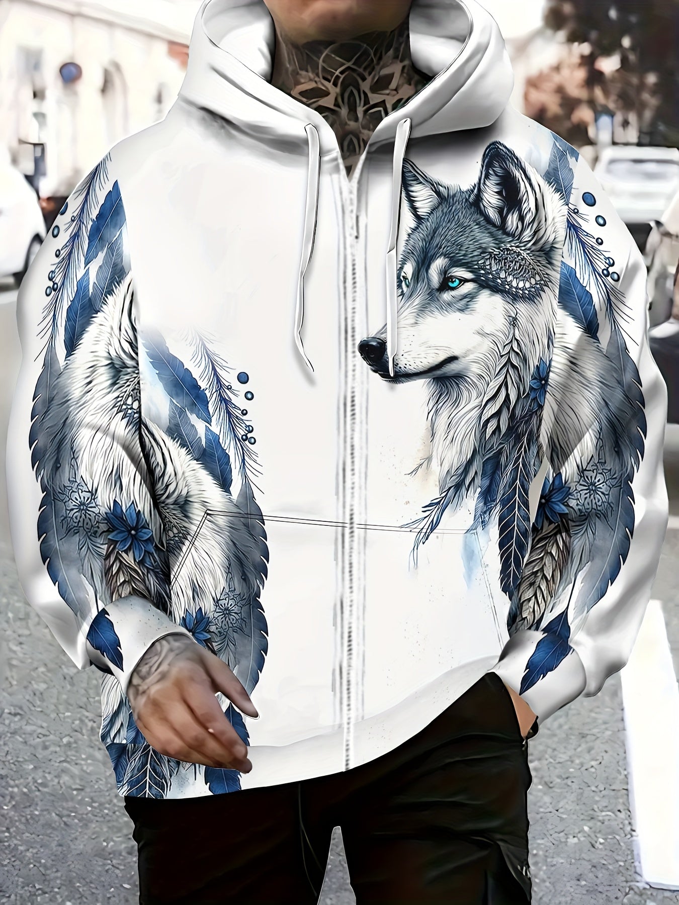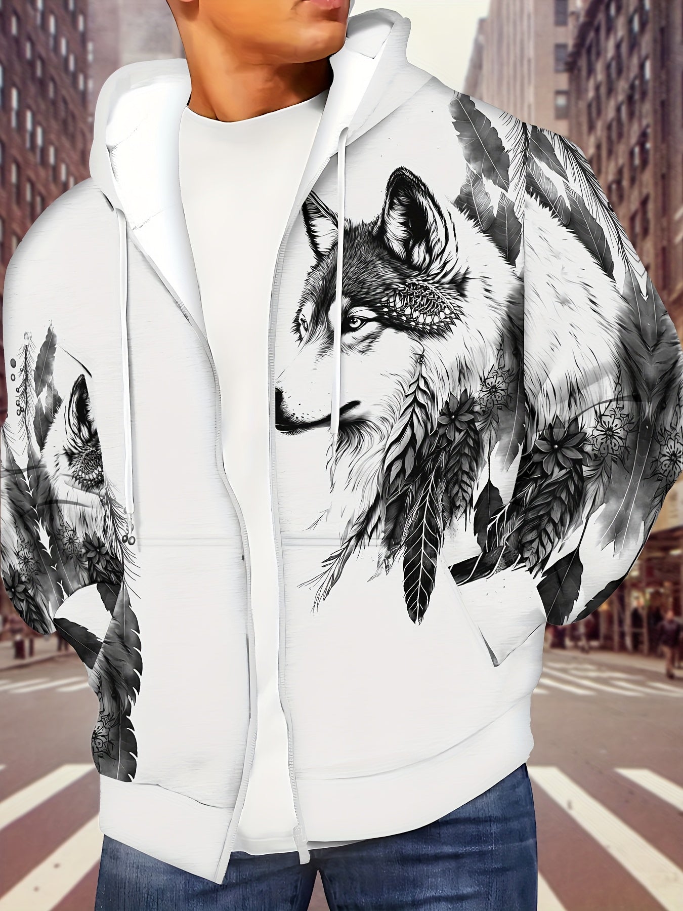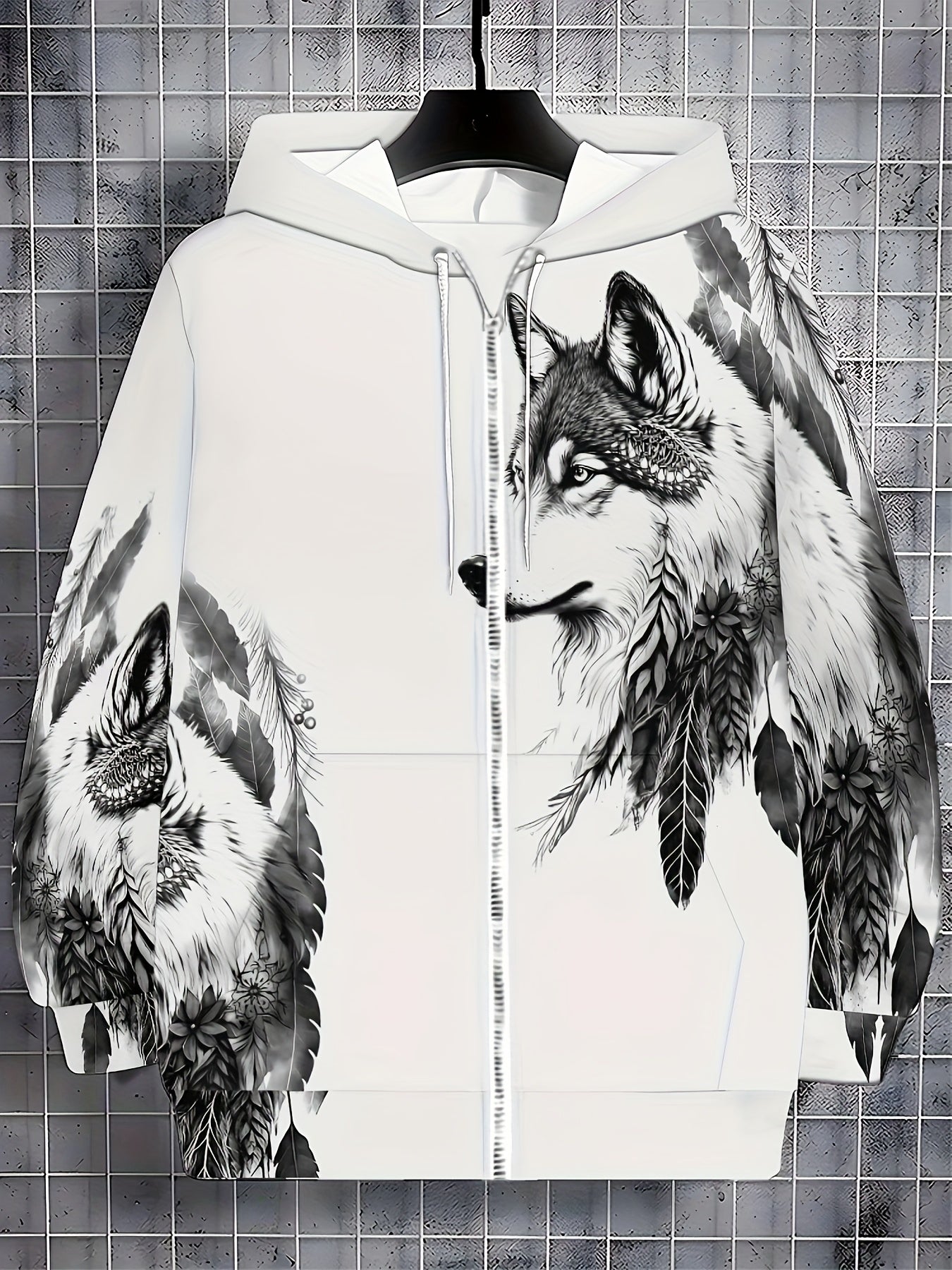 Men'S Long Sleeve Zip-Up Hoodie with Adorable Puppy Design - Cozy Fall & Winter Casual Outdoor Jacket, Drawstring Hood, Pockets, Soft Polyester Blend, White with Black & Brown Puppy Print