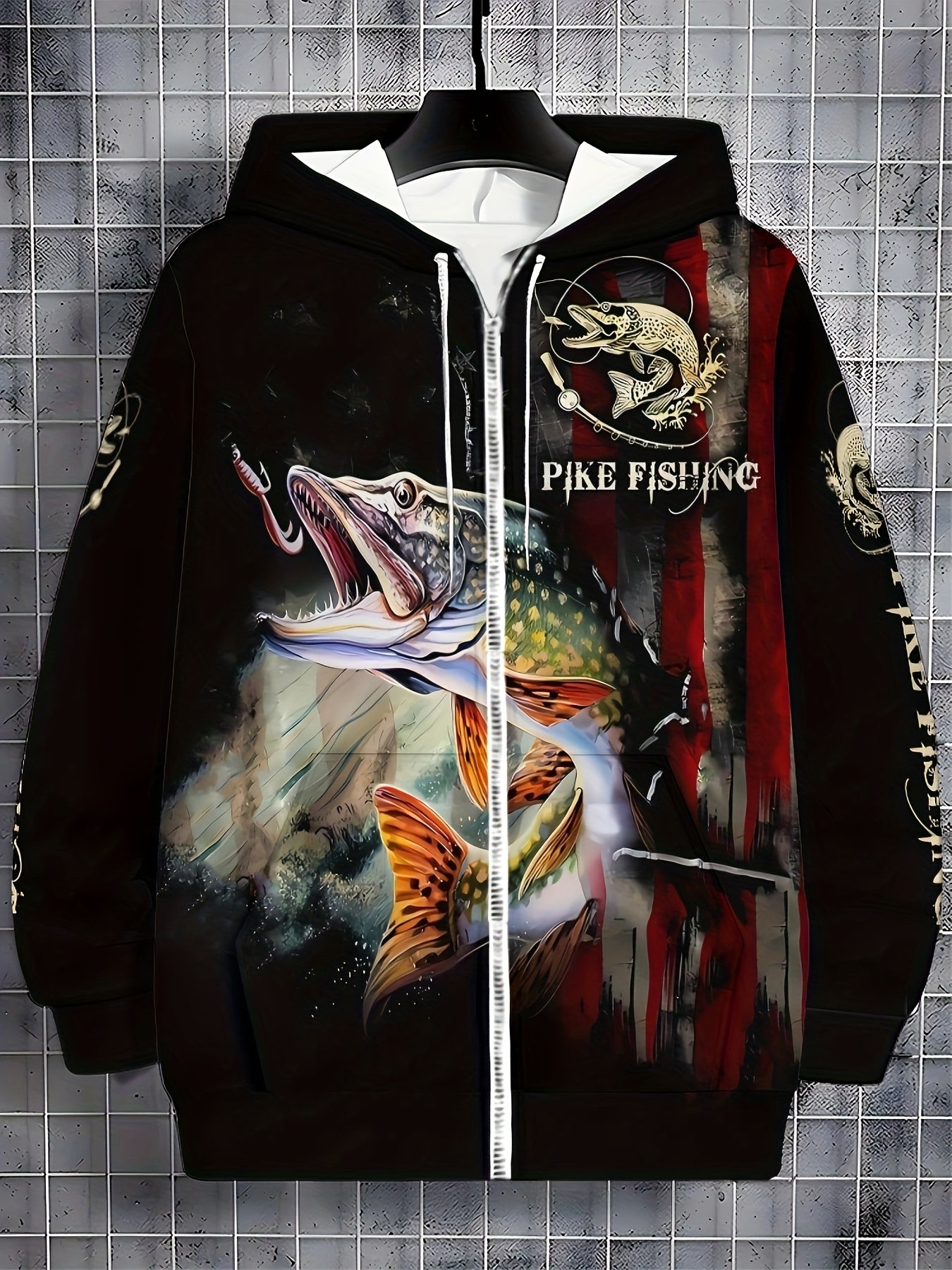 Men'S Pike Fishing Print Hoodie - Stylish Long Sleeve Zip-Up with Vibrant Fish Design, Drawstring Hood, and Pockets, Perfect for Fall & Winter Outdoor Enthusiasts, Casual Sportswear, Fishing Hoodie