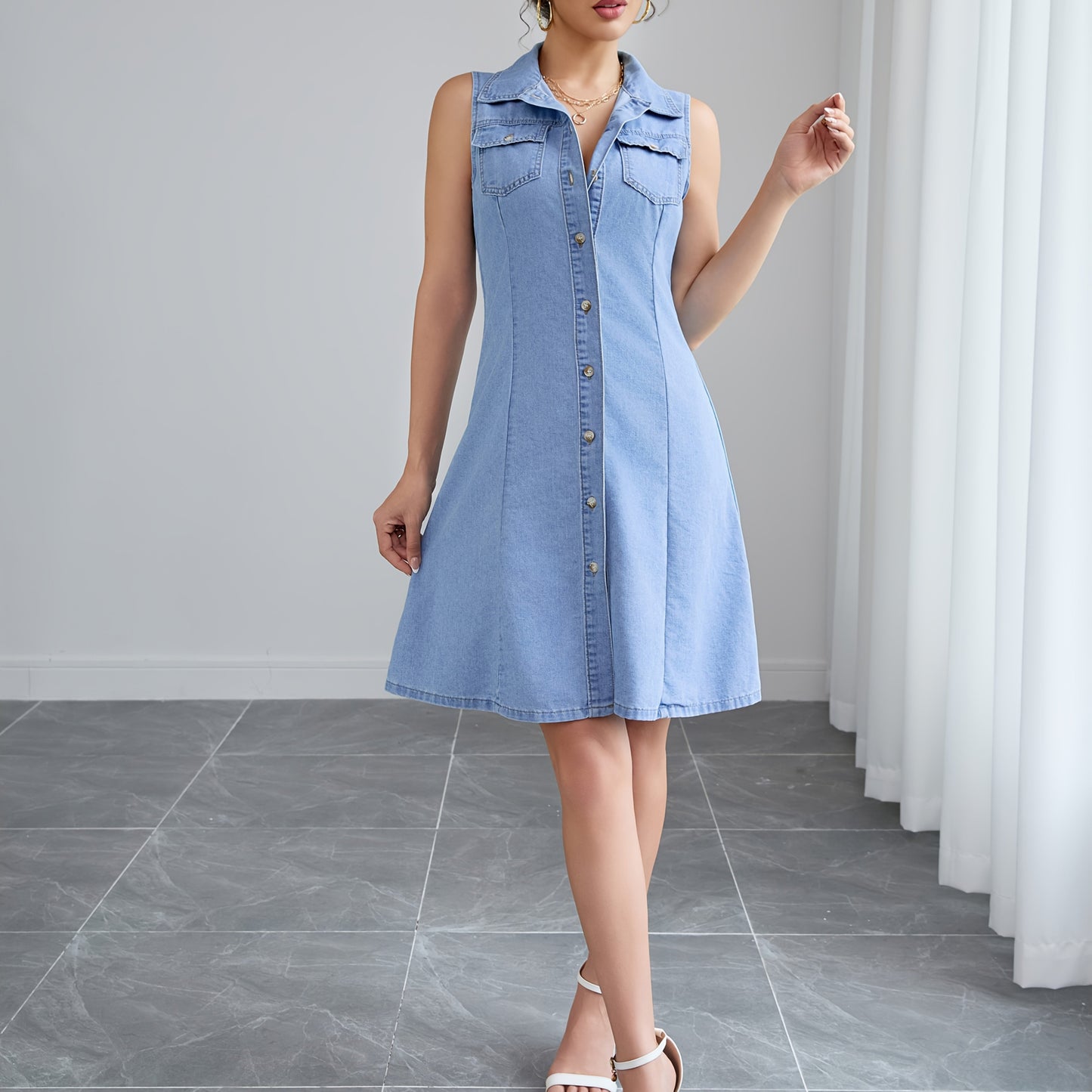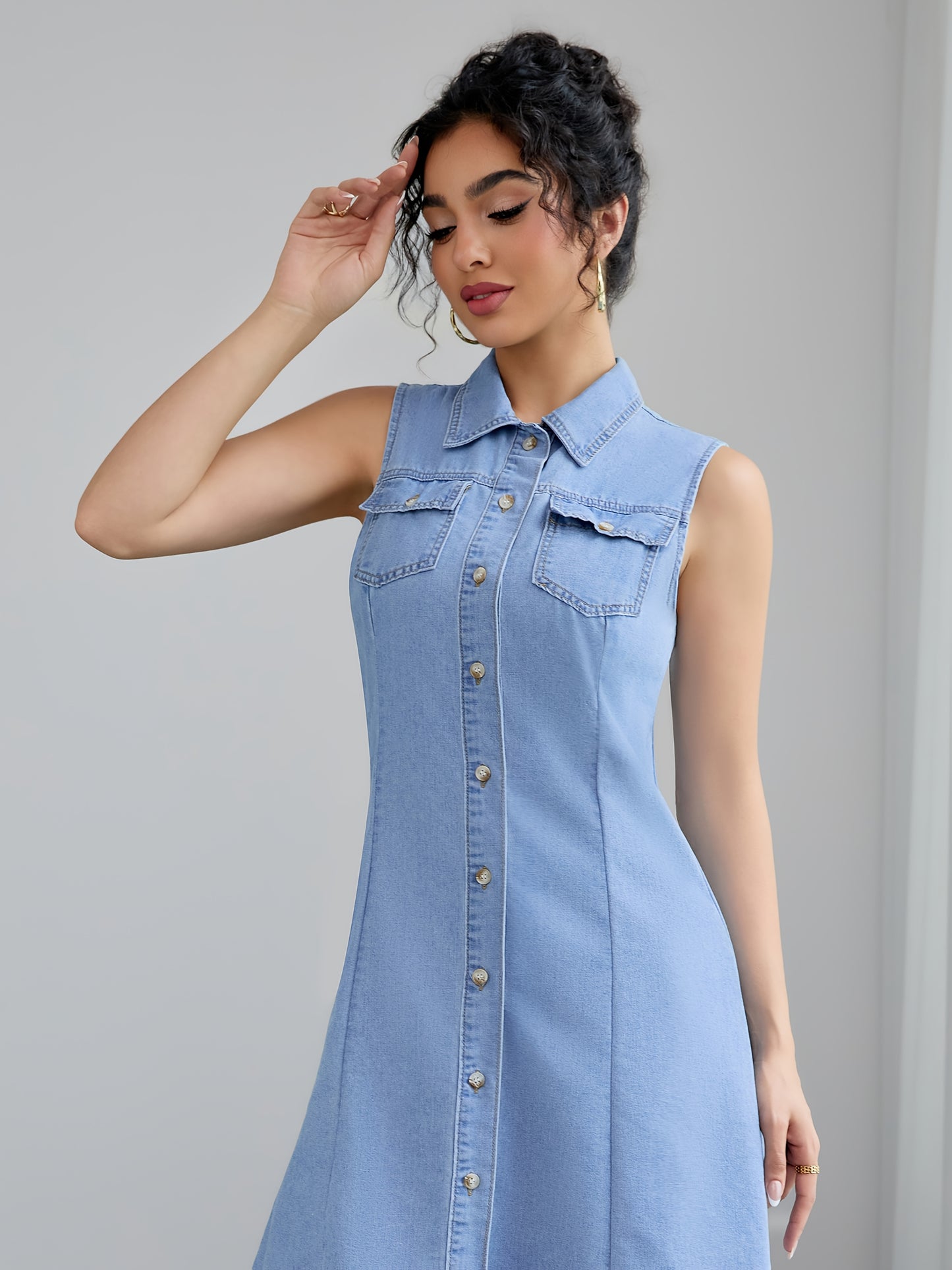 Women's Sleeveless Denim Dress - Casual A-Line with Pockets