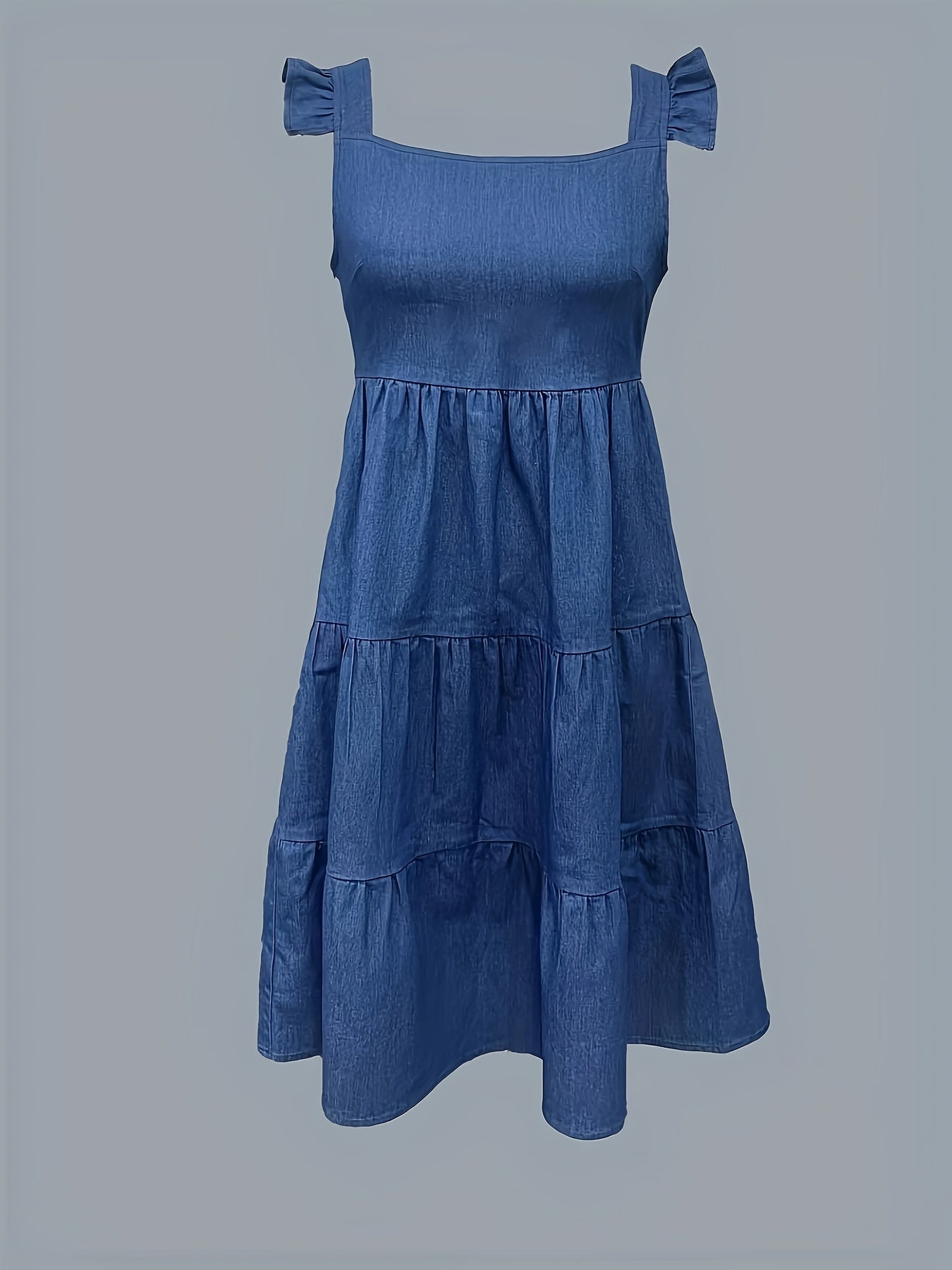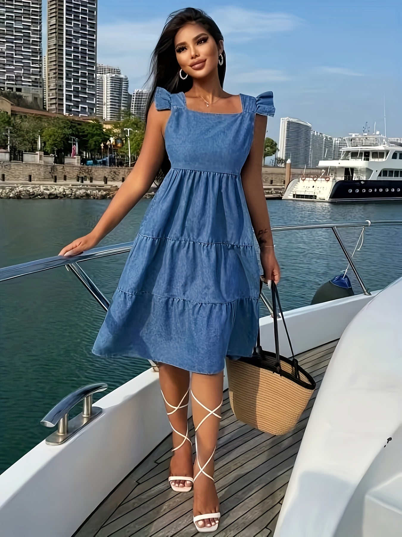 YIWEIDI Women’s Elegant Layered Dress - Stretchy Denim & Ruffled Sleeves