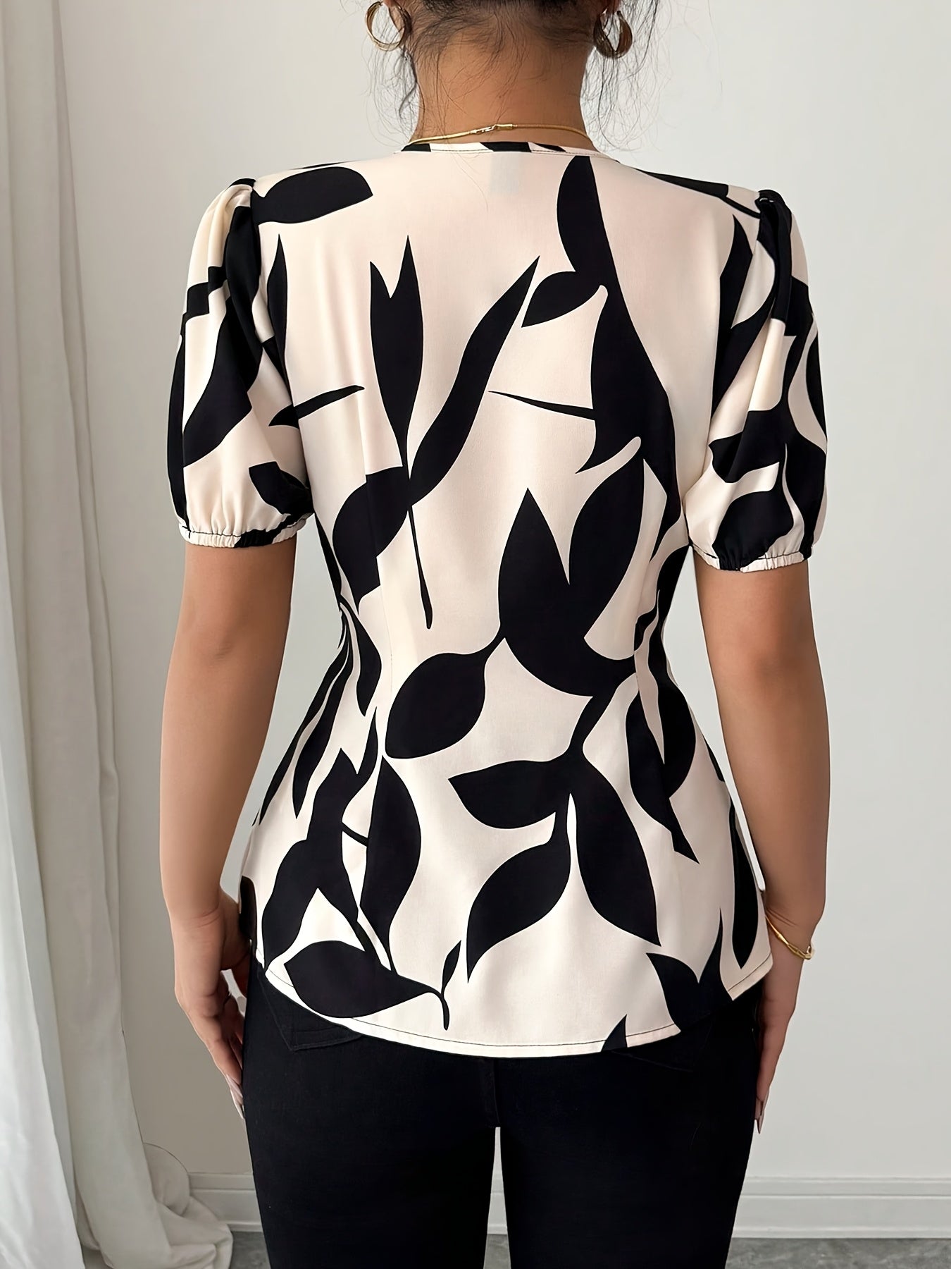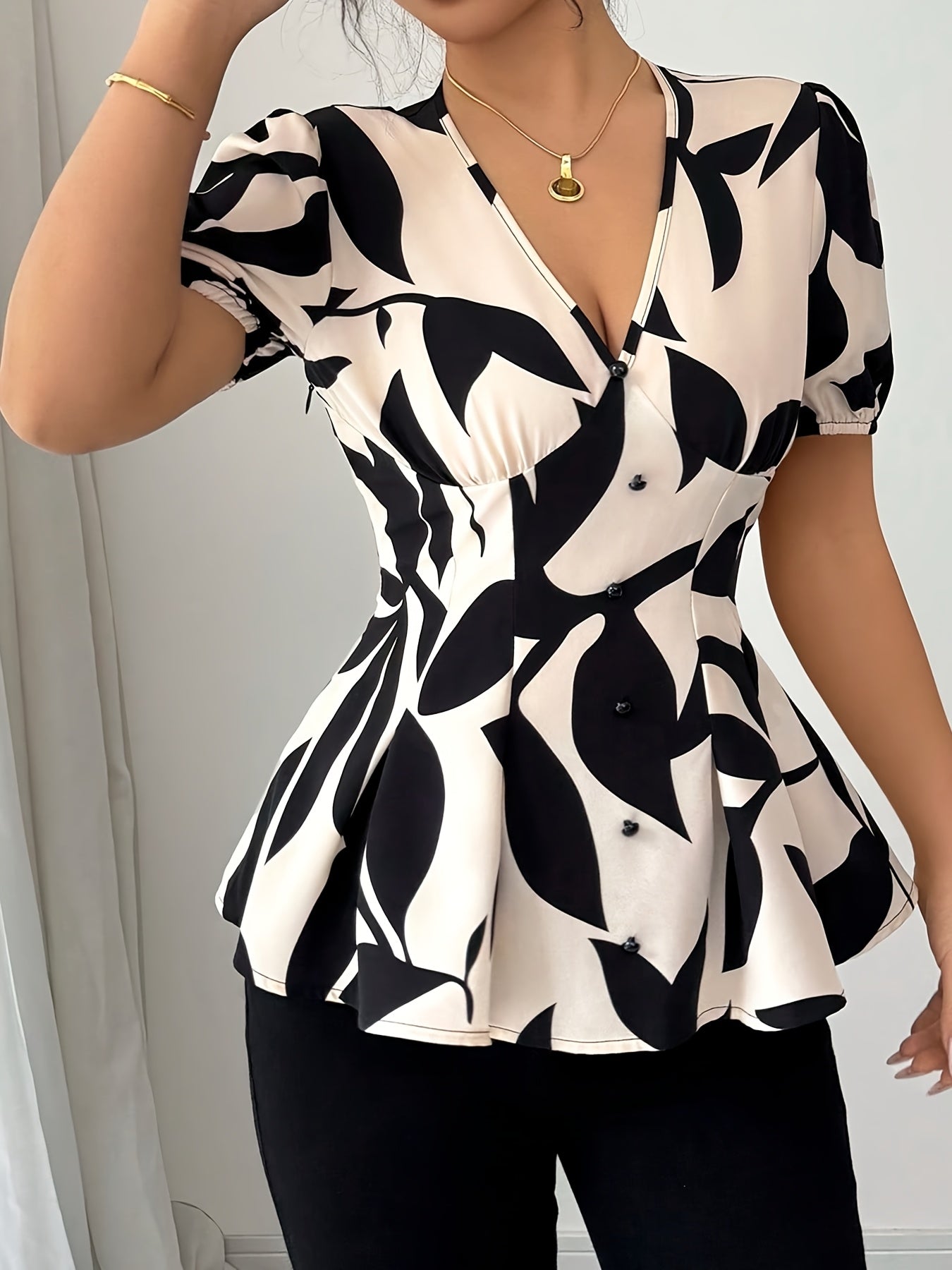 2025 Women's Black & White Floral Blouse - Elegant V-Neck Short Sleeve