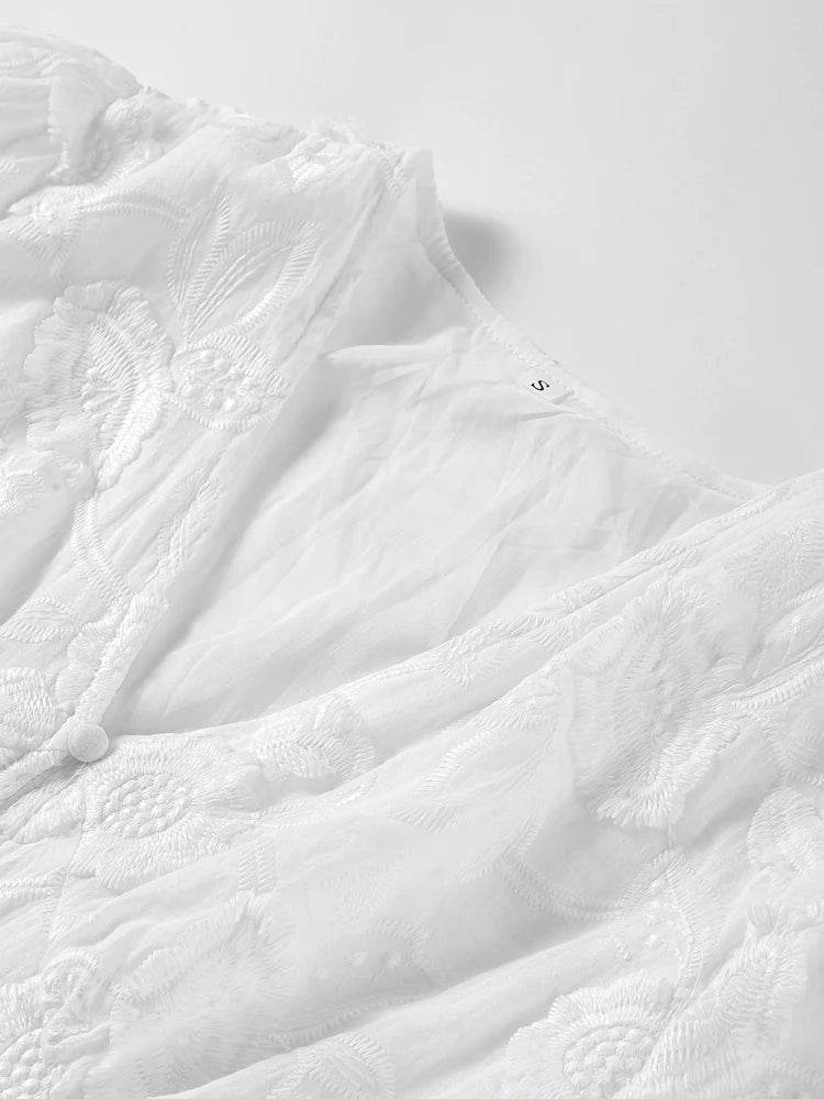 Introducing the Elegant Lace Hollow Out Dress, a stunning addition to this spring and summer's party wardrobe. This beautiful midi dress features a flattering V-neckline and intricate embroidery, making it perfect for various occasions. Crafted from a blend of cotton and synthetic fibers, it offers both comfort and style for the modern woman.