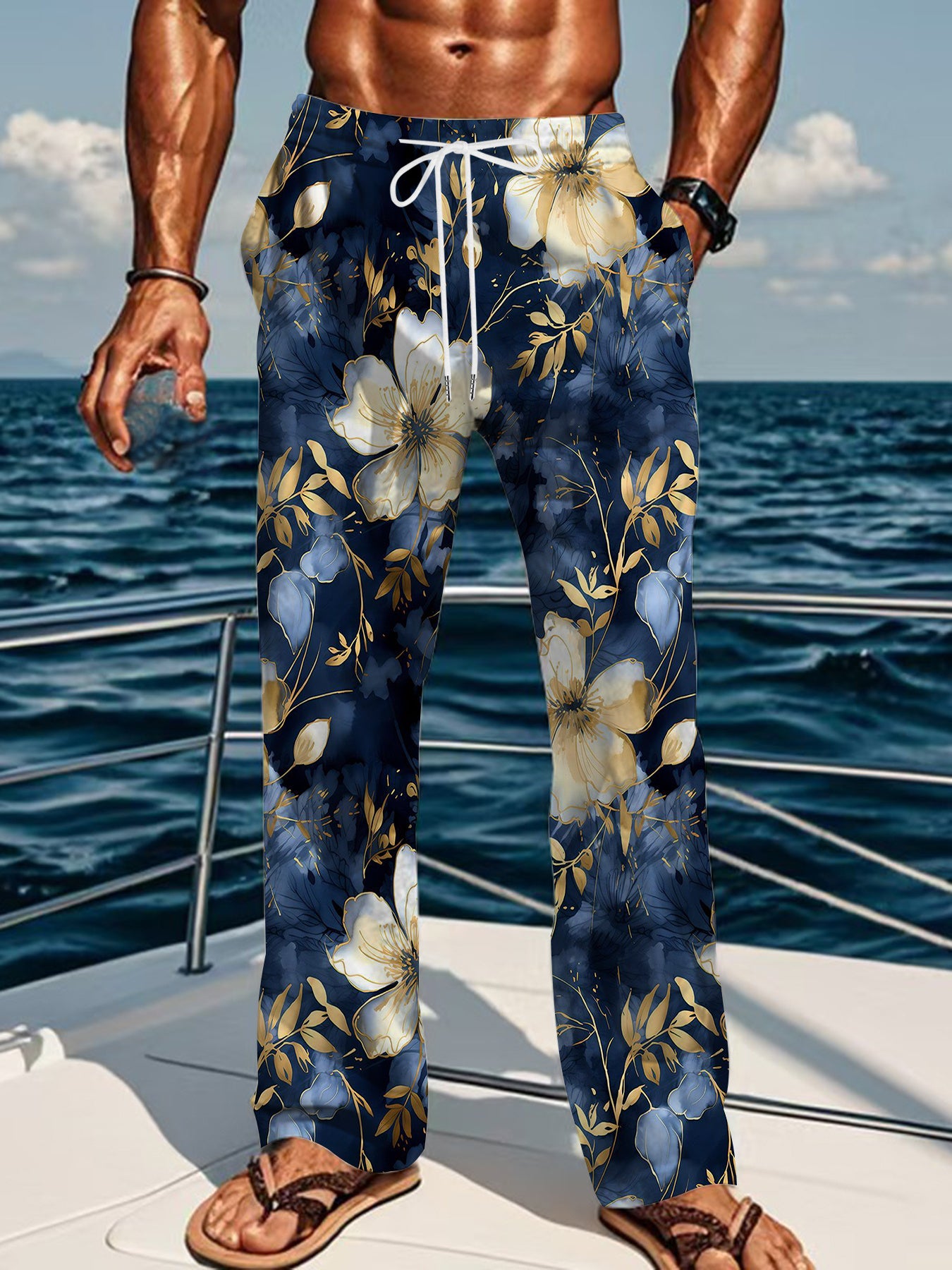 Men's Vintage Floral Straight Leg Pants - Navy Blue, Casual Style