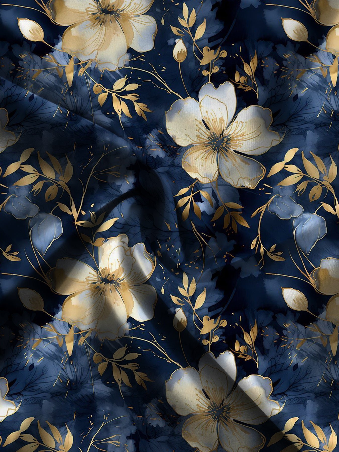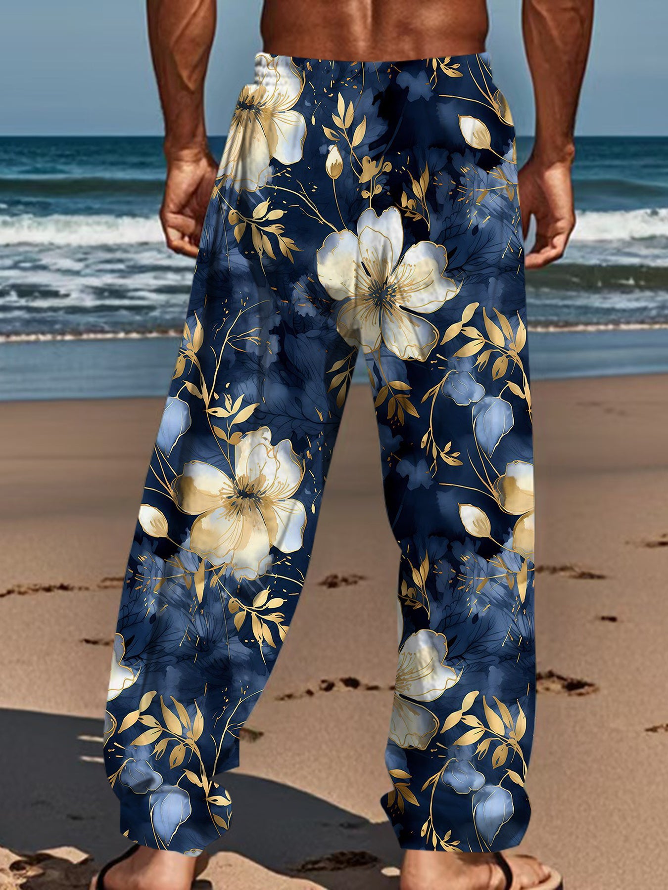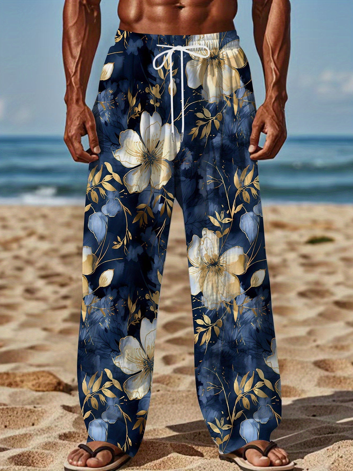 Discover the perfect blend of comfort and style with our Men's Vintage-Inspired Floral Print Straight Leg Pants. Crafted from 100% polyester, these navy blue trousers feature a stunning all-over print of white and golden flowers, making them a trendy choice for both teens and adults. With their loose fit and machine washable fabric, these casual wear pants are ideal for any occasion.